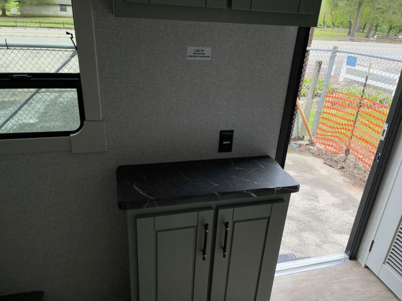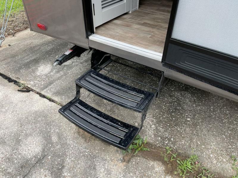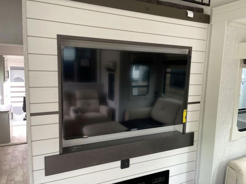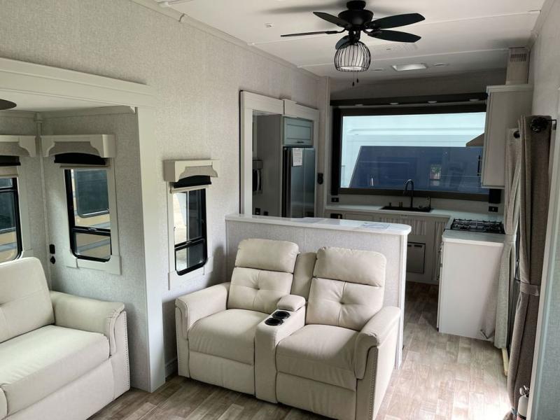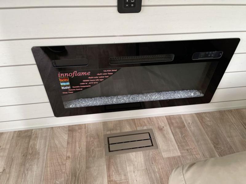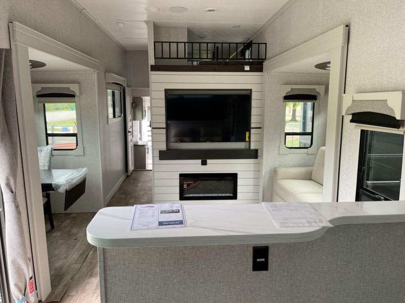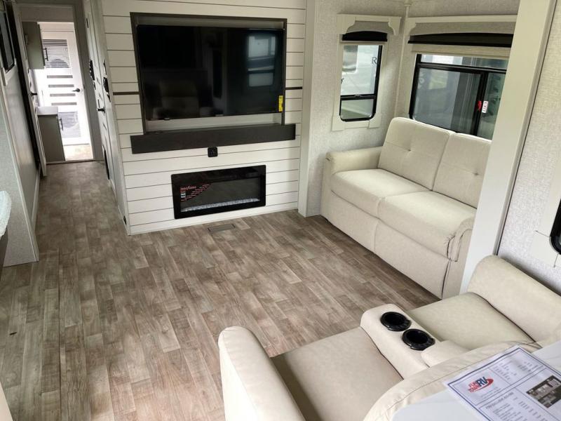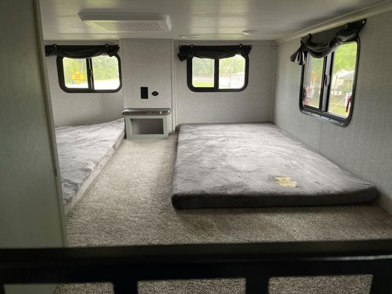 If you are looking for a destination trailer with more space and a larger sleeping capacity, this is the one! There are double loft areas; one above the bedroom with dual bunk mats and one above the bedroom with a third bunk mat. You'll find the rear bedroom ultra inviting with its king bed slide out, entertainment center with a 39" TV, plus a wardrobe and dresser to keep your things organized. If you have any other guests, they can sleep on the 72" sofa in the middle living area. There is also theater seating here, a ceiling fan, plus a fireplace and 50" TV. And the free-standing table with chairs and a bench provides a place to dine and play games in the evening. Head to the front kitchen where you'll find generous counter space, a bar top with two stools, and all the kitchen appliances to create your best meals!
