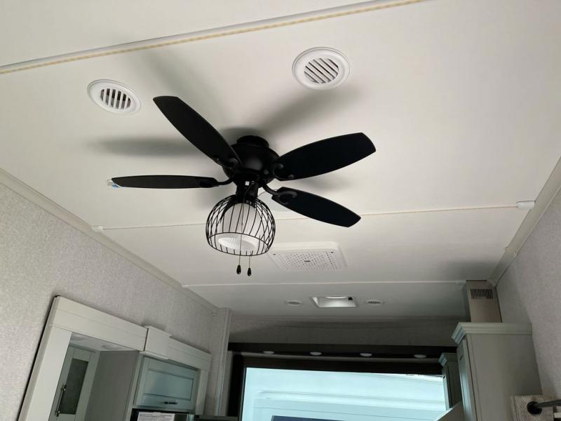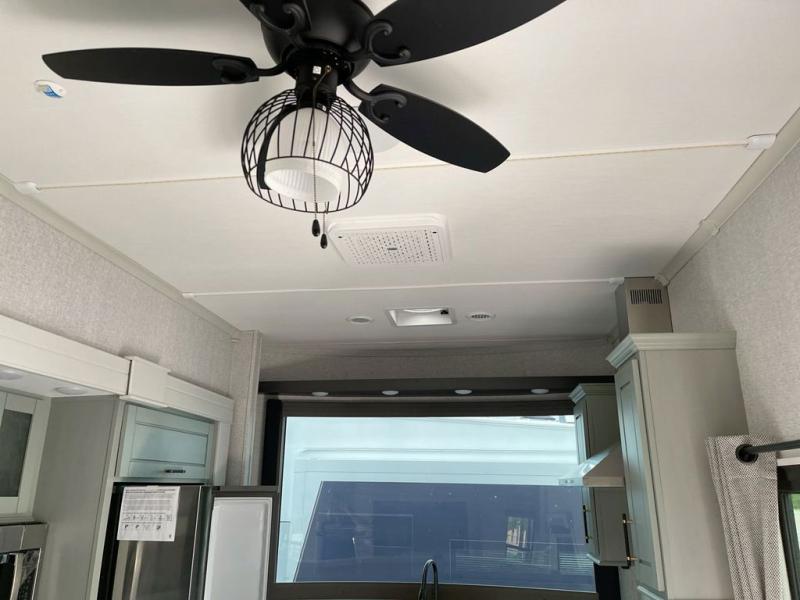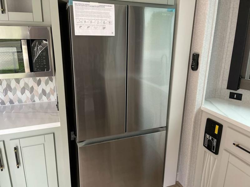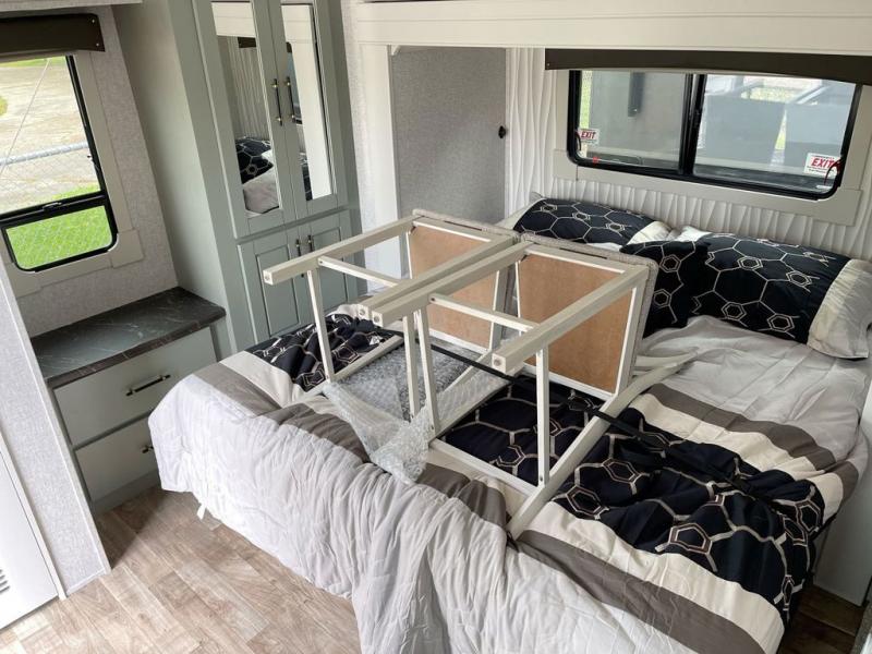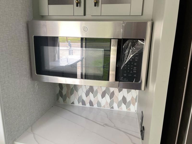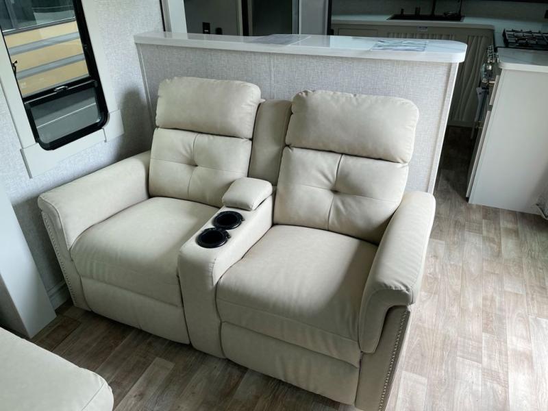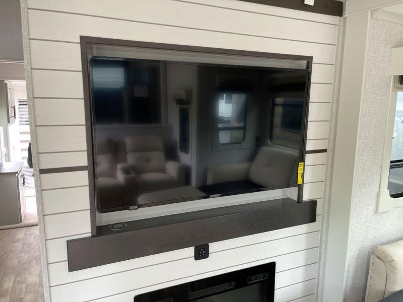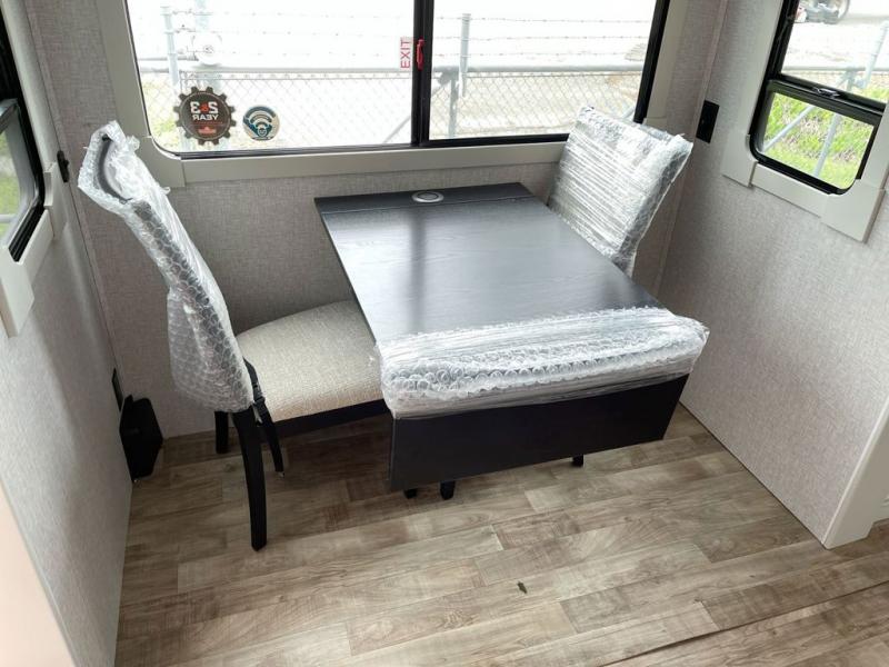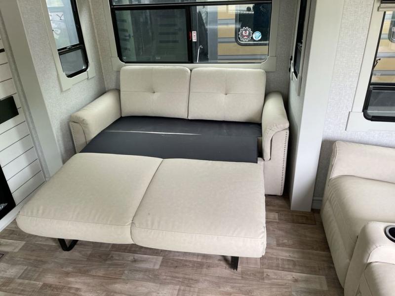 If you are looking for a destination trailer with more space and a larger sleeping capacity, this is the one! There are double loft areas; one above the bedroom with dual bunk mats and one above the bedroom with a third bunk mat. You'll find the rear bedroom ultra inviting with its king bed slide out, entertainment center with a 39" TV, plus a wardrobe and dresser to keep your things organized. If you have any other guests, they can sleep on the 72" sofa in the middle living area. There is also theater seating here, a ceiling fan, plus a fireplace and 50" TV. And the free-standing table with chairs and a bench provides a place to dine and play games in the evening. Head to the front kitchen where you'll find generous counter space, a bar top with two stools, and all the kitchen appliances to create your best meals!
