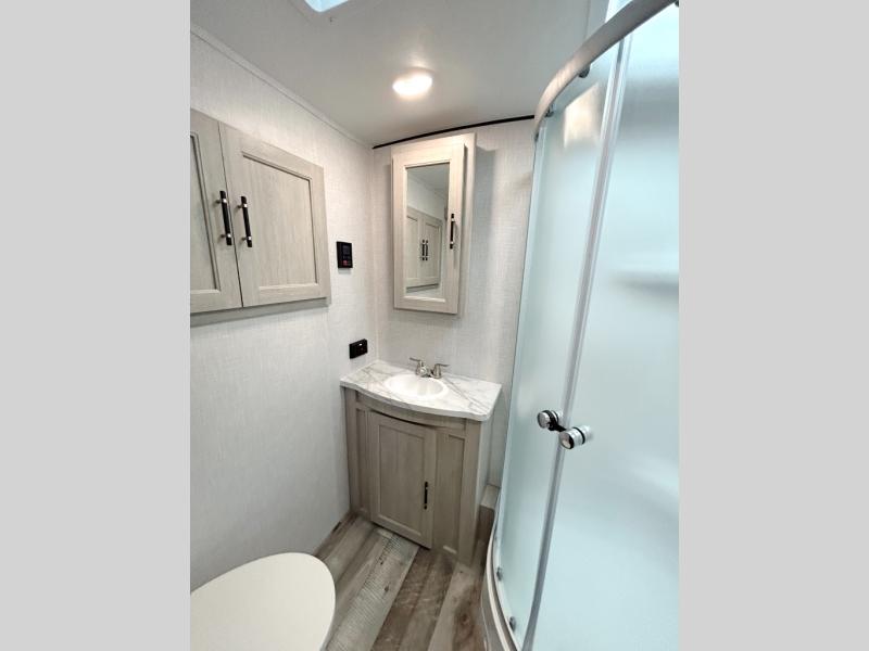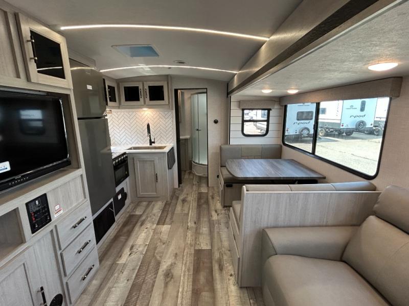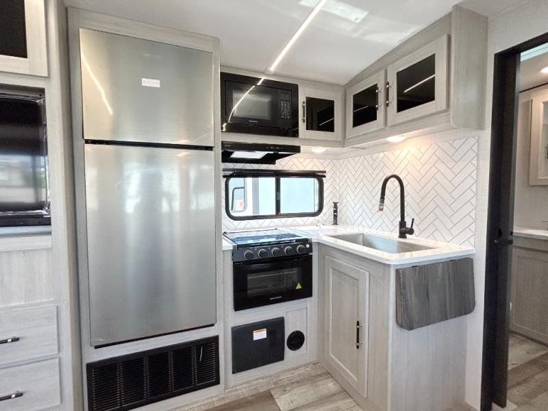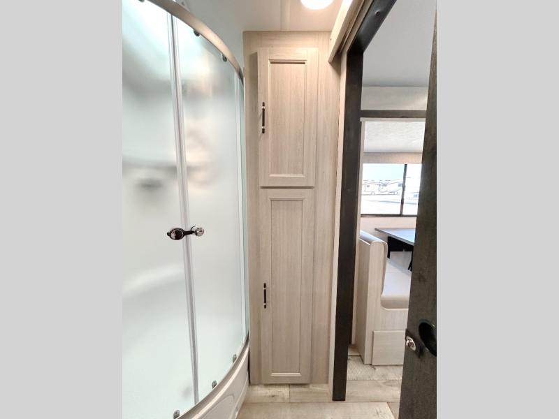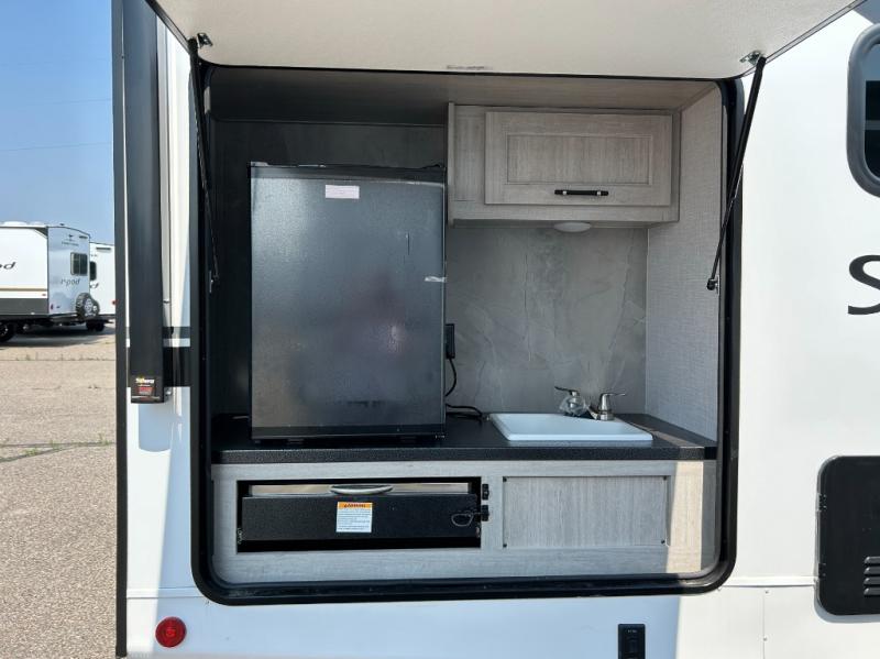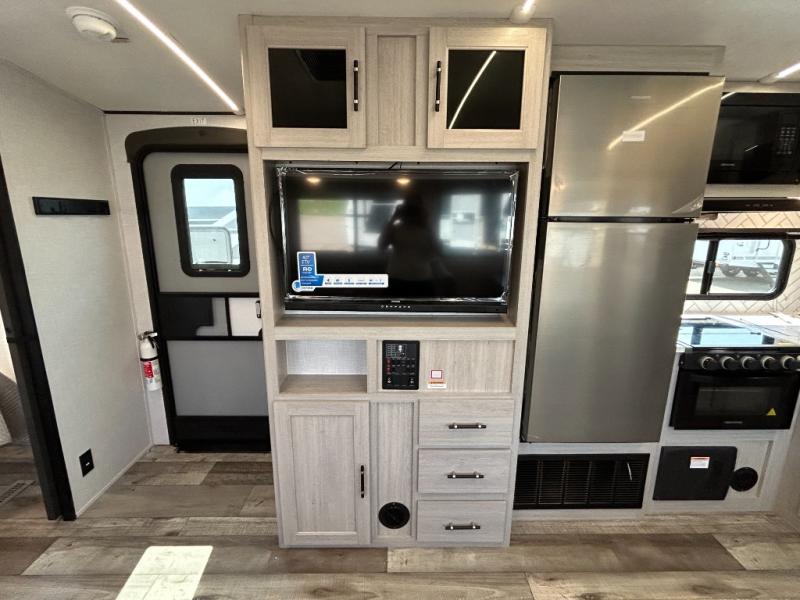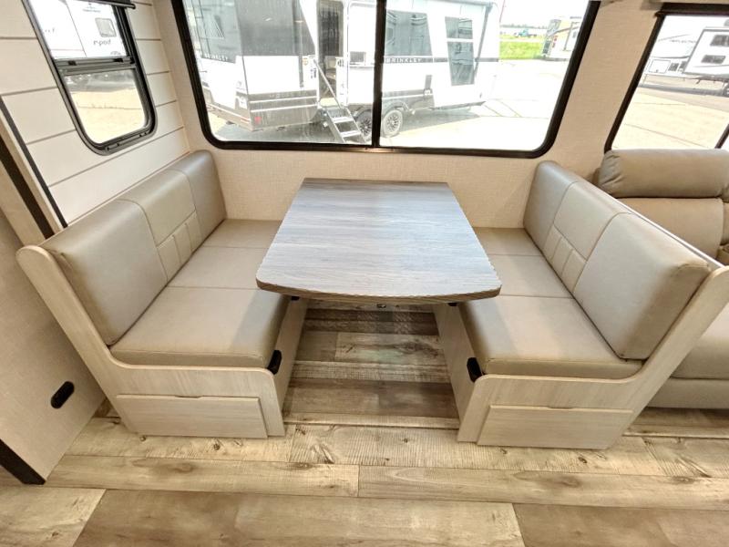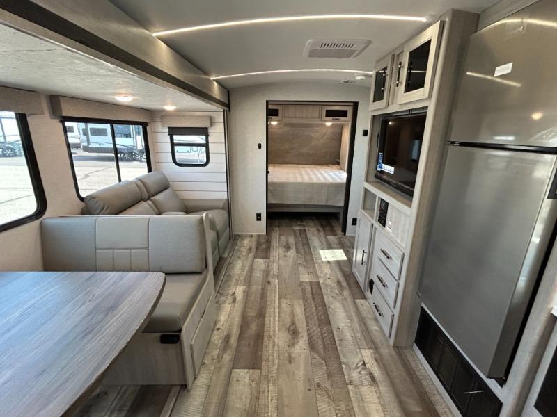 You will love the added interior space you have in this travel trailer thanks to the large slide out in the main living area. Here, you'll enjoy playing cards at the XL booth dinette and relaxing on the theater seating. Make home-cooked meals on the glass top range or use the exterior camp kitchen. There is even an exterior refrigerator for cold drinks, and the power awning will shade you from the hot summer sun. This model features a full rear bath for added privacy, and the shower skylight will allow natural light in. The front private bedroom includes a king bed, dual wardrobes, plus a shoe storage and pet station for your convenience!