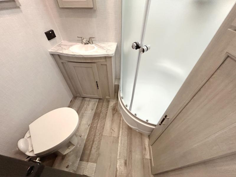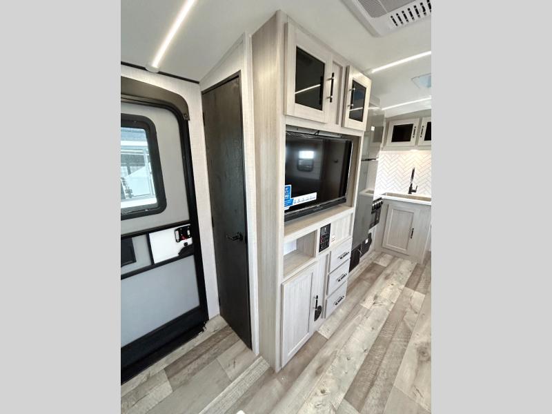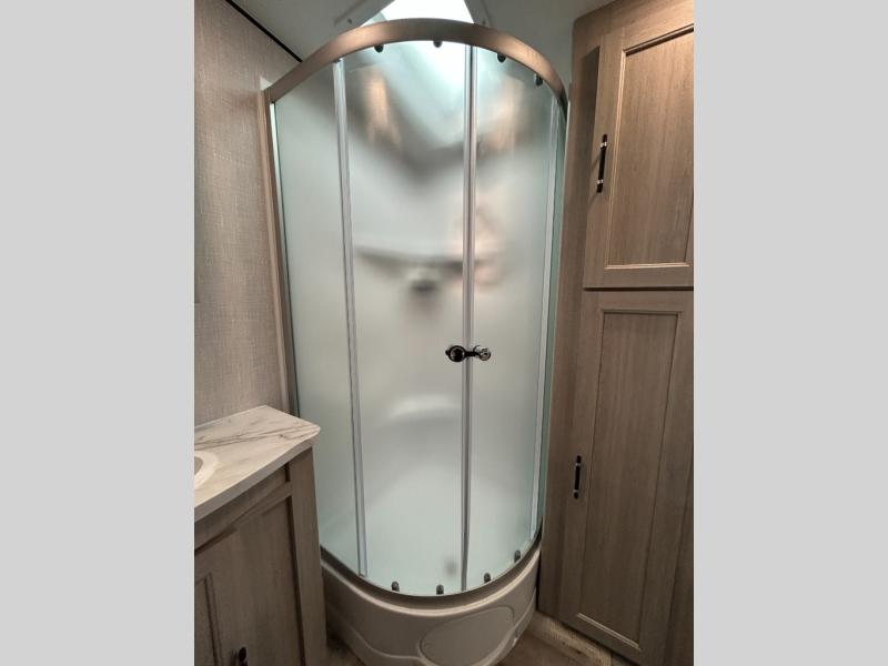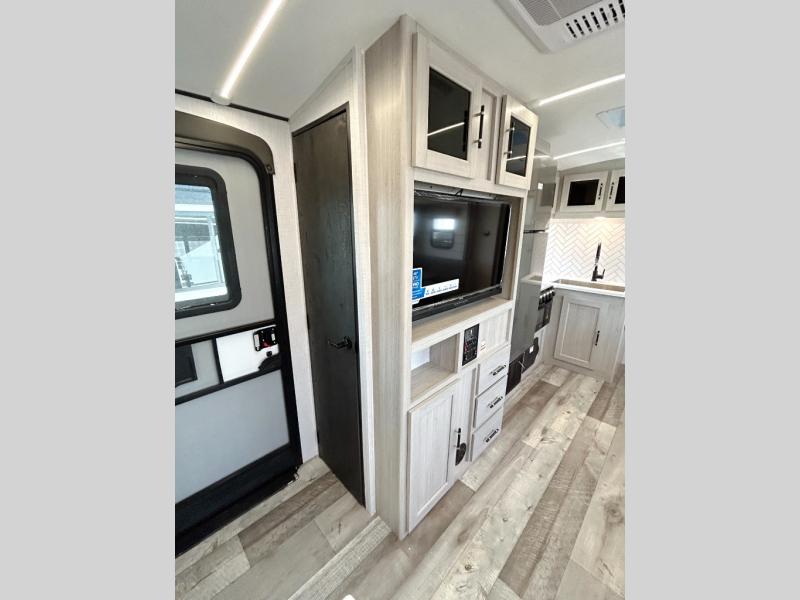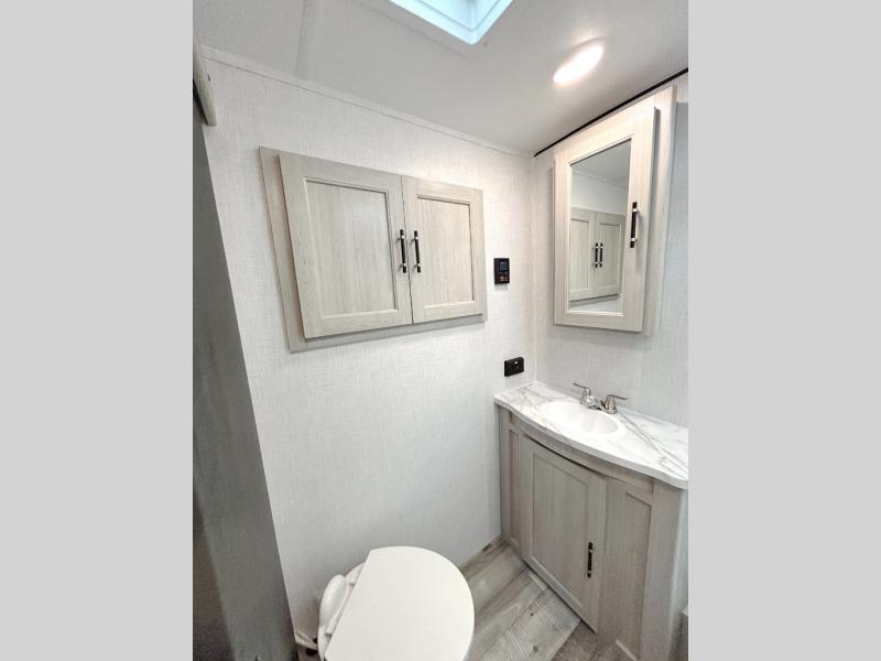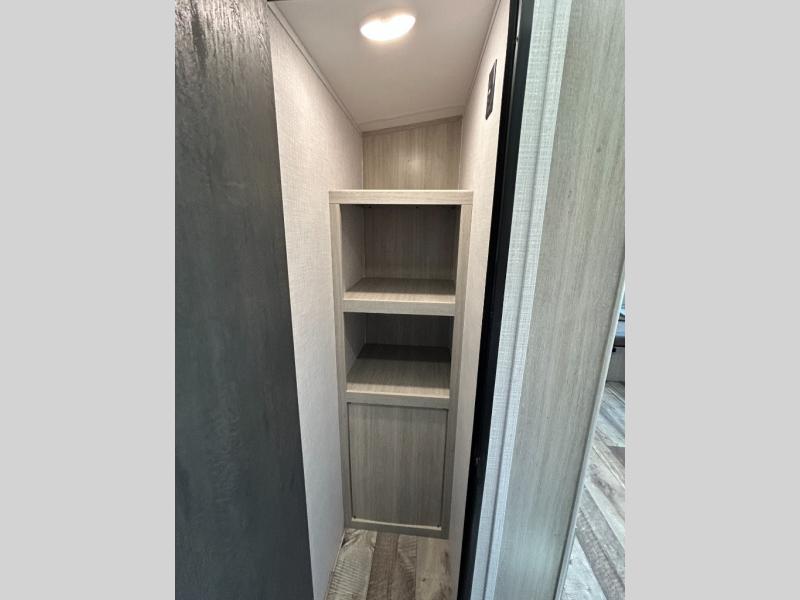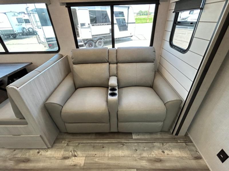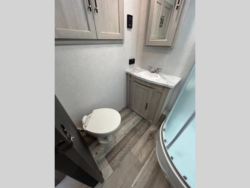 You will love the added interior space you have in this travel trailer thanks to the large slide out in the main living area. Here, you'll enjoy playing cards at the XL booth dinette and relaxing on the theater seating. Make home-cooked meals on the glass top range or use the exterior camp kitchen. There is even an exterior refrigerator for cold drinks, and the power awning will shade you from the hot summer sun. This model features a full rear bath for added privacy, and the shower skylight will allow natural light in. The front private bedroom includes a king bed, dual wardrobes, plus a shoe storage and pet station for your convenience!