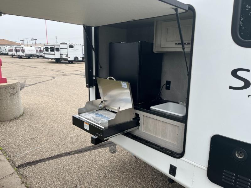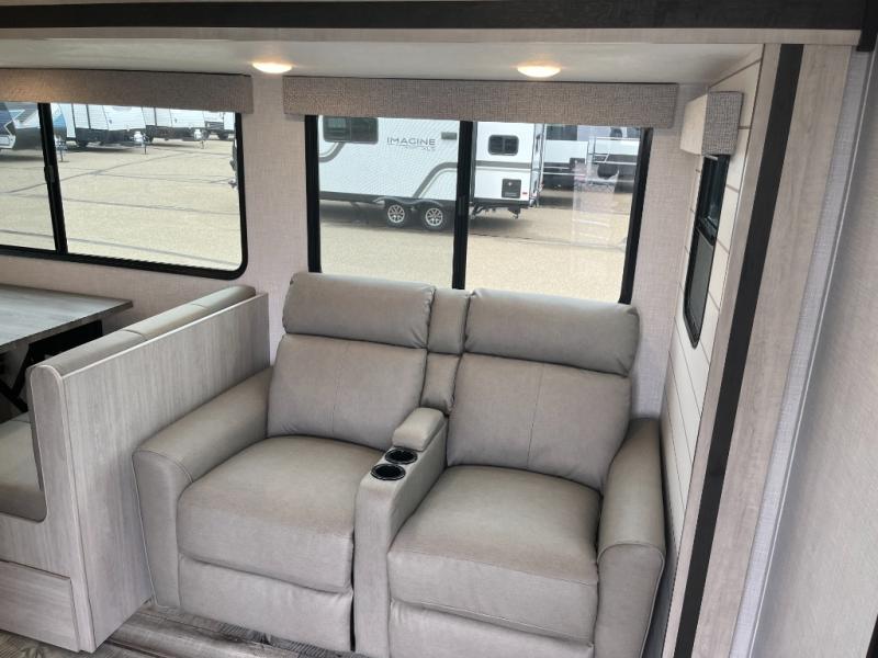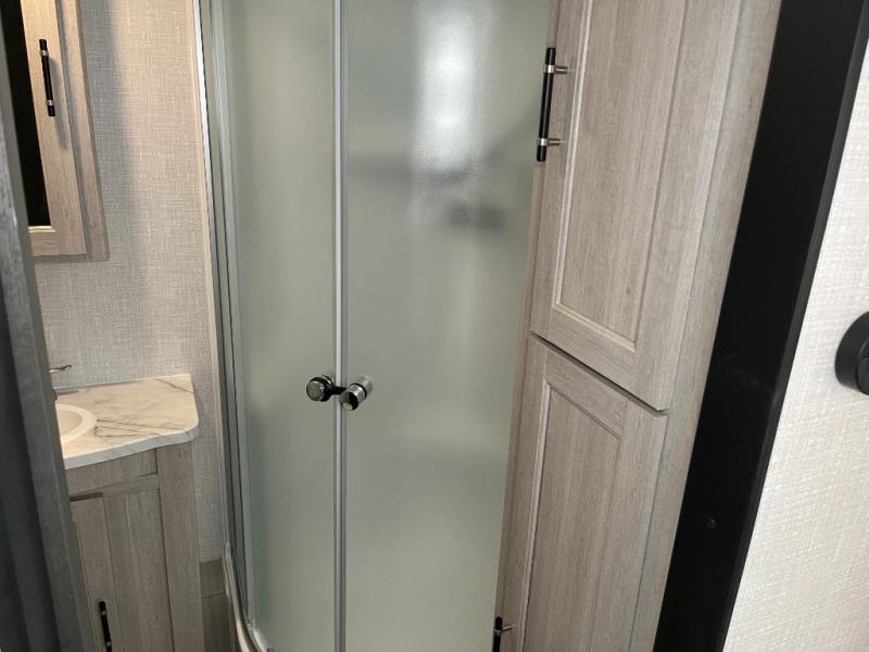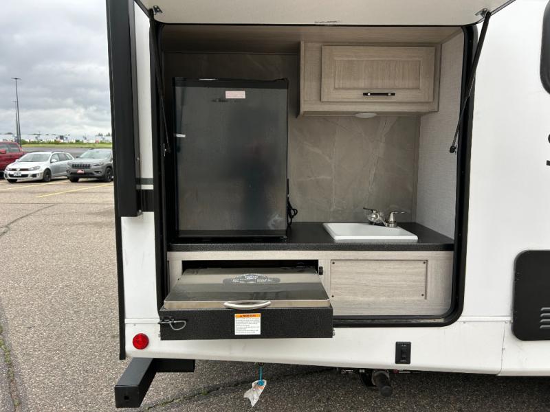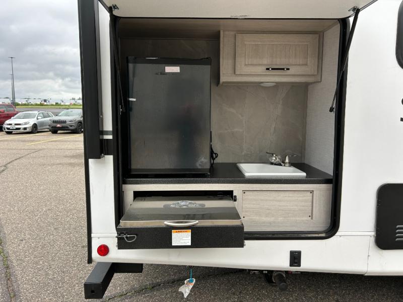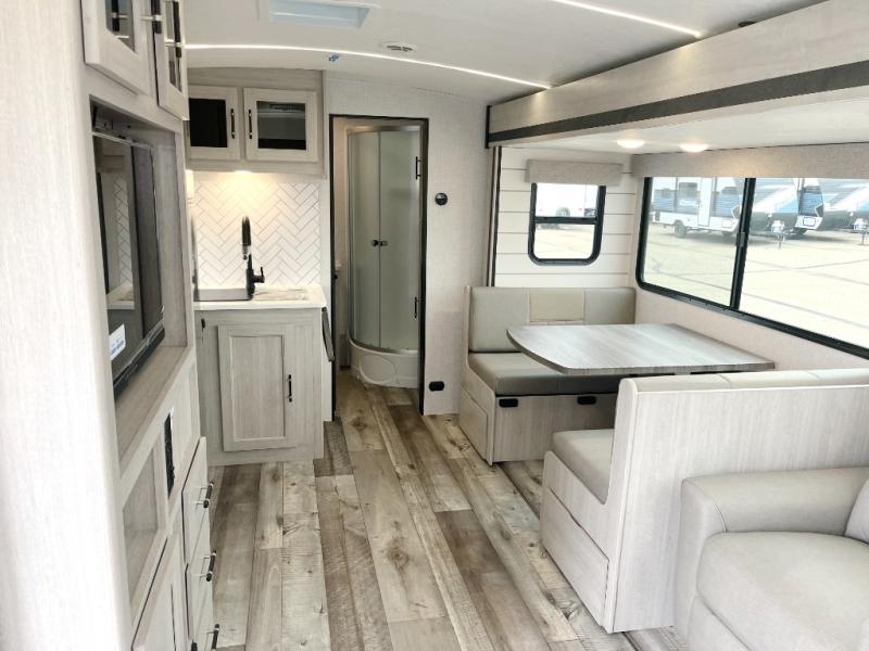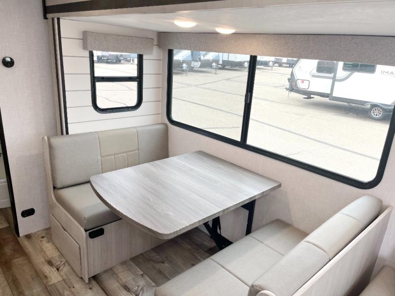 You will love the added interior space you have in this travel trailer thanks to the large slide out in the main living area. Here, you'll enjoy playing cards at the XL booth dinette and relaxing on the theater seating. Make home-cooked meals on the glass top range or use the exterior camp kitchen. There is even an exterior refrigerator for cold drinks, and the power awning will shade you from the hot summer sun. This model features a full rear bath for added privacy, and the shower skylight will allow natural light in. The front private bedroom includes a king bed, dual wardrobes, plus a shoe storage and pet station for your convenience!