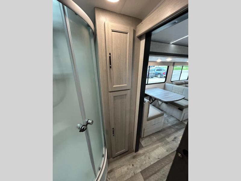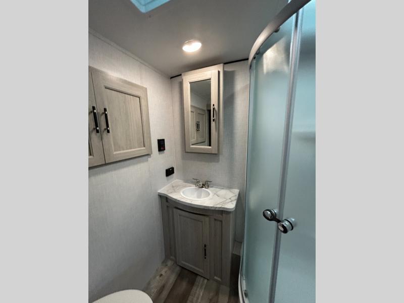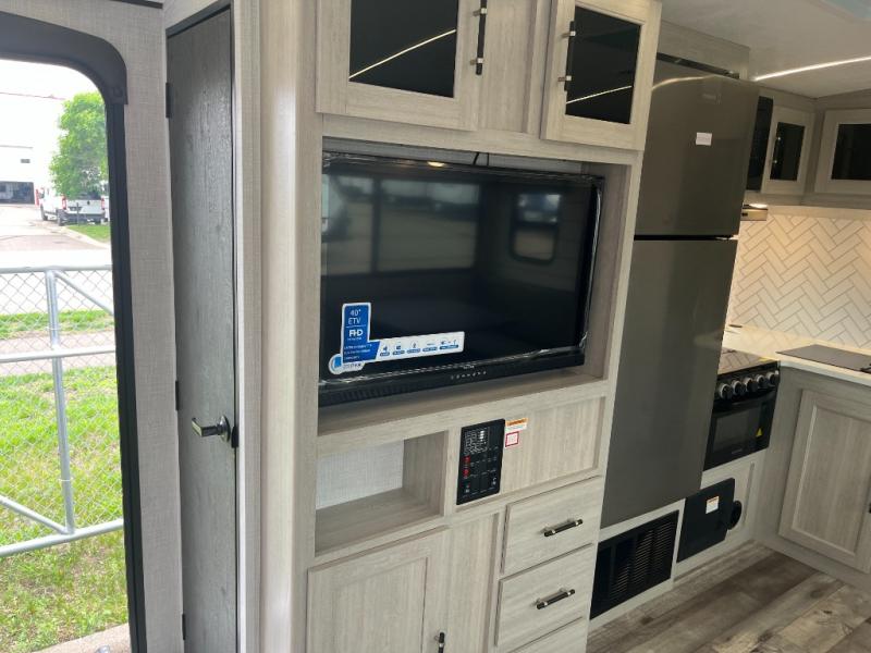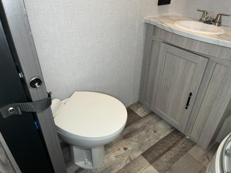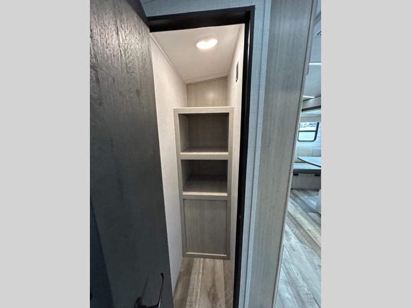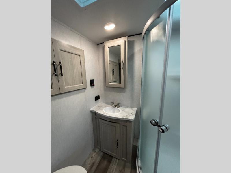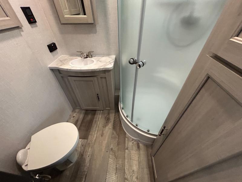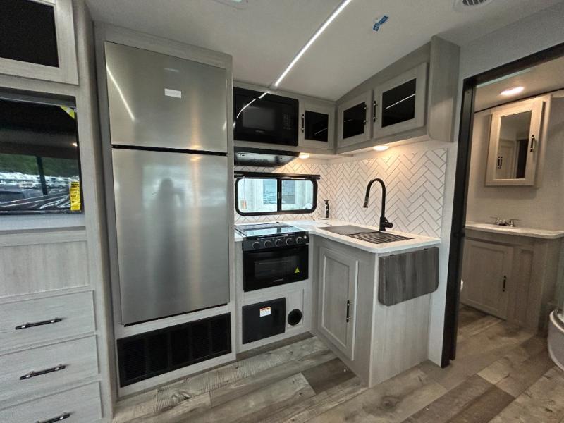 You will love the added interior space you have in this travel trailer thanks to the large slide out in the main living area. Here, you'll enjoy playing cards at the XL booth dinette and relaxing on the theater seating. Make home-cooked meals on the glass top range or use the exterior camp kitchen. There is even an exterior refrigerator for cold drinks, and the power awning will shade you from the hot summer sun. This model features a full rear bath for added privacy, and the shower skylight will allow natural light in. The front private bedroom includes a king bed, dual wardrobes, plus a shoe storage and pet station for your convenience!