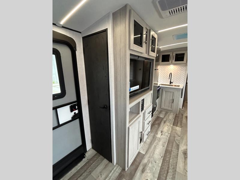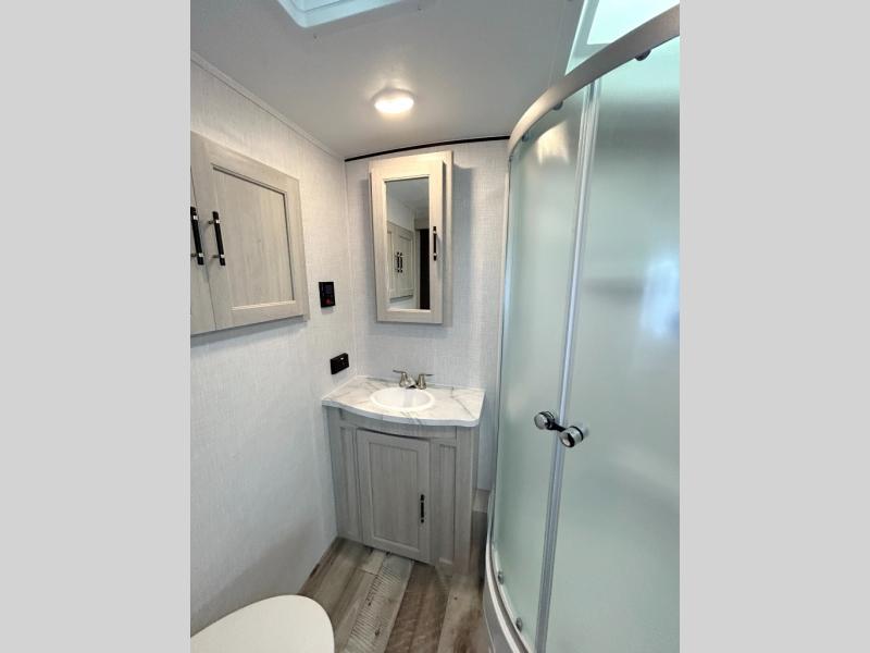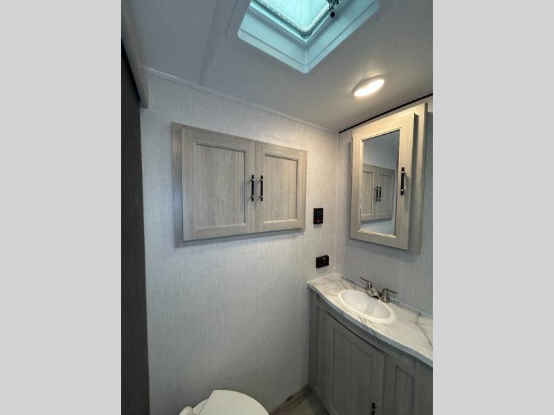 You will love the added interior space you have in this travel trailer thanks to the large slide out in the main living area. Here, you'll enjoy playing cards at the XL booth dinette and relaxing on the theater seating. Make home-cooked meals on the glass top range or use the exterior camp kitchen. There is even an exterior refrigerator for cold drinks, and the power awning will shade you from the hot summer sun. This model features a full rear bath for added privacy, and the shower skylight will allow natural light in. The front private bedroom includes a king bed, dual wardrobes, plus a shoe storage and pet station for your convenience!
