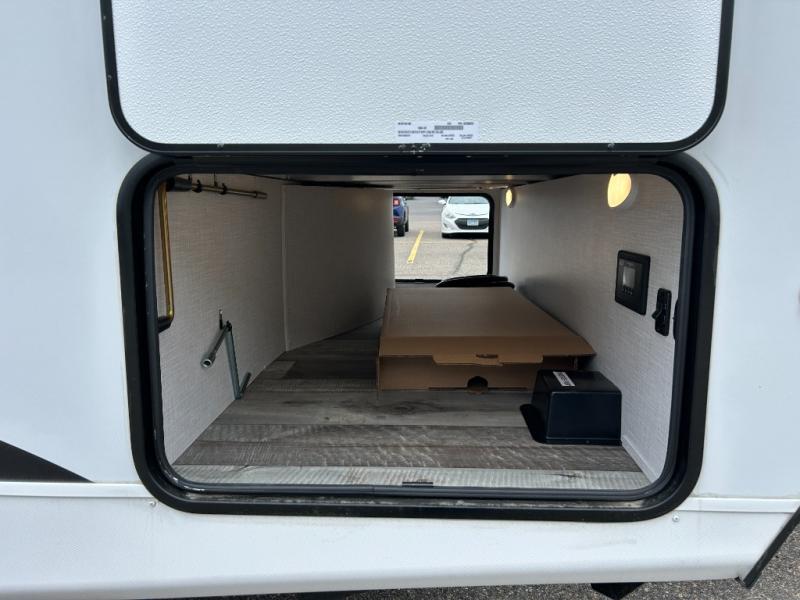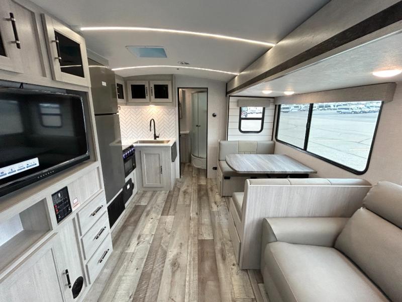 You will love the added interior space you have in this travel trailer thanks to the large slide out in the main living area. Here, you'll enjoy playing cards at the XL booth dinette and relaxing on the theater seating. Make home-cooked meals on the glass top range or use the exterior camp kitchen. There is even an exterior refrigerator for cold drinks, and the power awning will shade you from the hot summer sun. This model features a full rear bath for added privacy, and the shower skylight will allow natural light in. The front private bedroom includes a king bed, dual wardrobes, plus a shoe storage and pet station for your convenience!