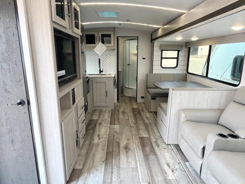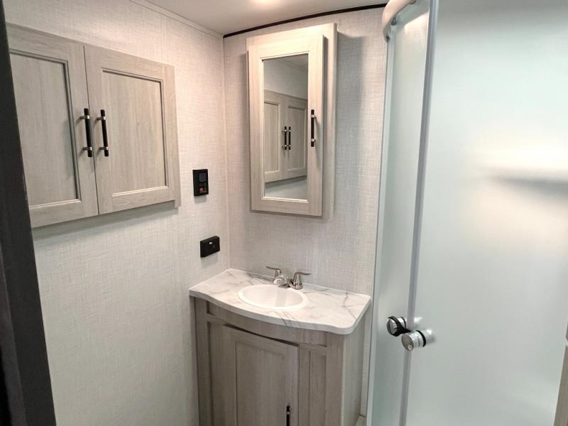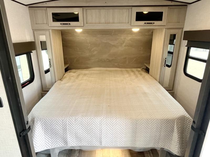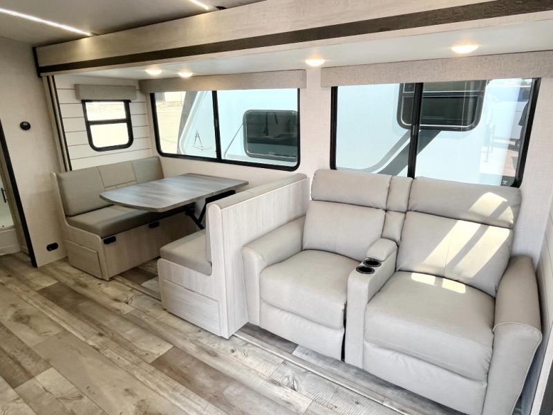 You will love the added interior space you have in this travel trailer thanks to the large slide out in the main living area. Here, you'll enjoy playing cards at the XL booth dinette and relaxing on the theater seating. Make home-cooked meals on the glass top range or use the exterior camp kitchen. There is even an exterior refrigerator for cold drinks, and the power awning will shade you from the hot summer sun. This model features a full rear bath for added privacy, and the shower skylight will allow natural light in. The front private bedroom includes a king bed, dual wardrobes, plus a shoe storage and pet station for your convenience!