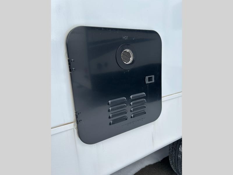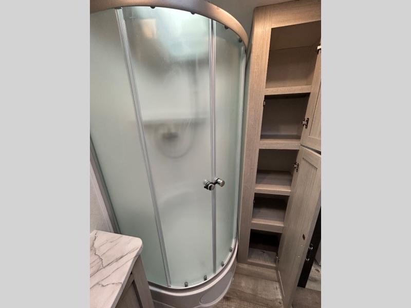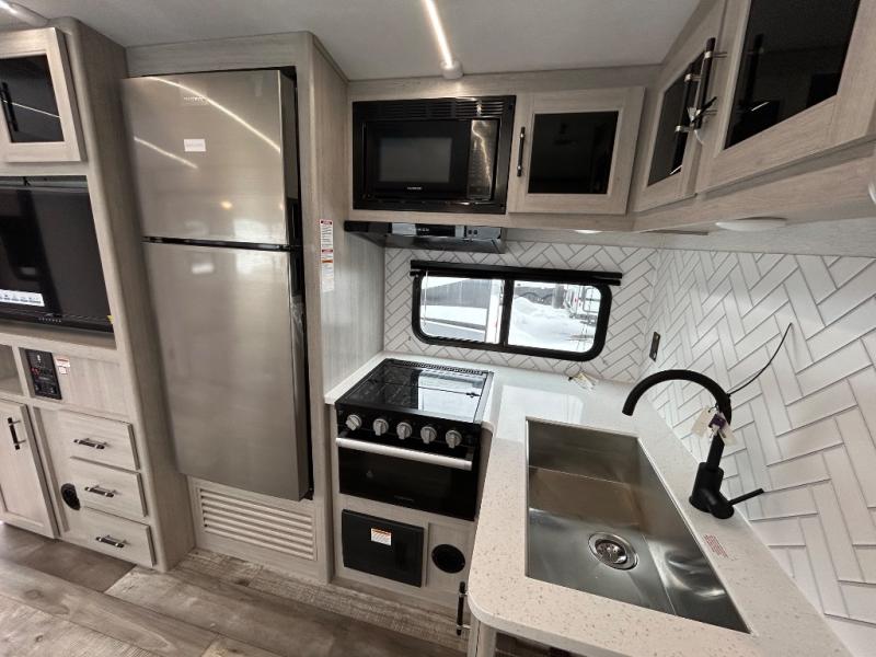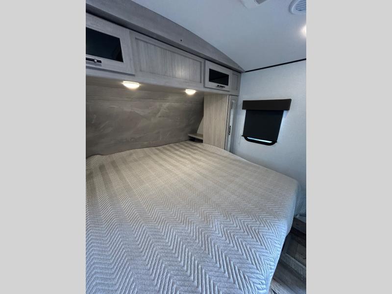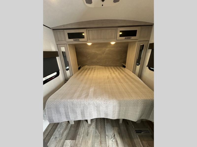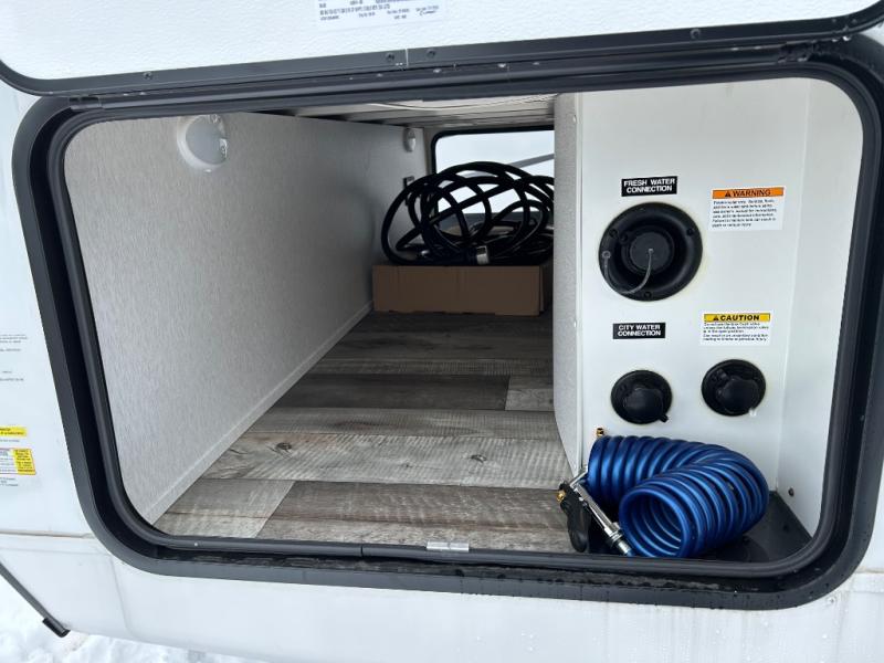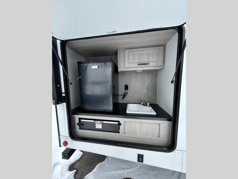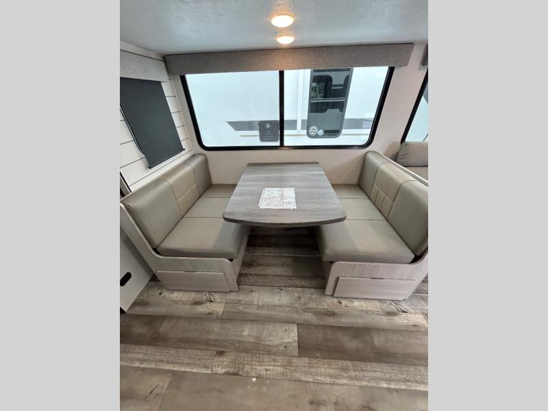 You will love the added interior space you have in this travel trailer thanks to the large slide out in the main living area. Here, you'll enjoy playing cards at the XL booth dinette and relaxing on the tri-fold sofa. Make home-cooked meals on the glass top range or use the exterior camp kitchen. There is even an exterior refrigerator for cold drinks, and the power awning will shade you from the hot summer sun. This model features a full rear bath for added privacy, and the shower skylight will allow natural light in. The front private bedroom includes a king bed, dual wardrobes, plus a shoe storage and pet station for your convenience!