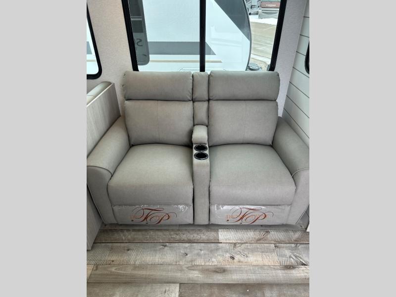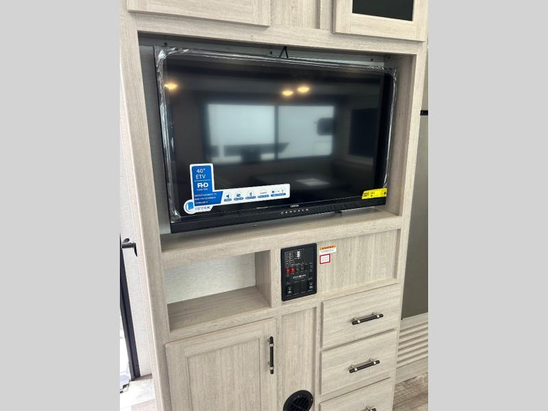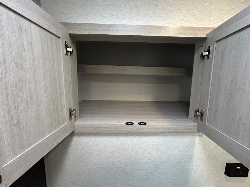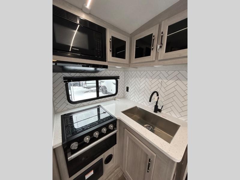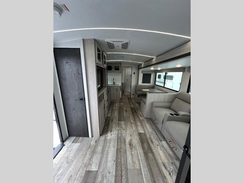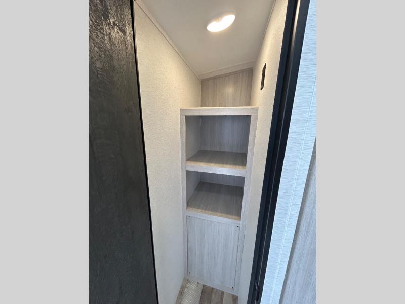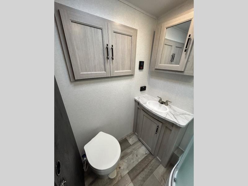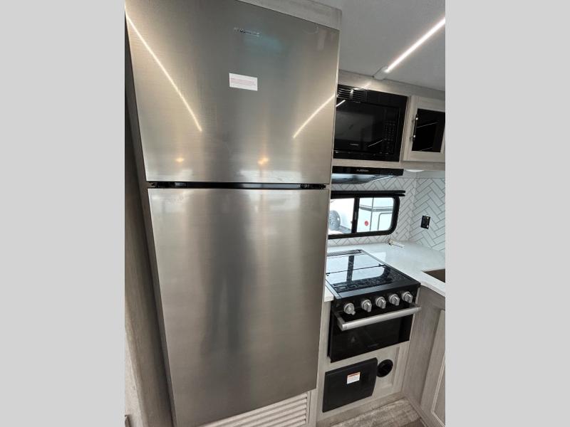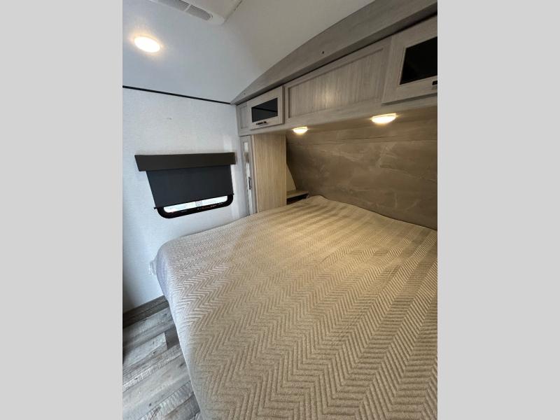 You will love the added interior space you have in this travel trailer thanks to the large slide out in the main living area. Here, you'll enjoy playing cards at the XL booth dinette and relaxing on the tri-fold sofa. Make home-cooked meals on the glass top range or use the exterior camp kitchen. There is even an exterior refrigerator for cold drinks, and the power awning will shade you from the hot summer sun. This model features a full rear bath for added privacy, and the shower skylight will allow natural light in. The front private bedroom includes a king bed, dual wardrobes, plus a shoe storage and pet station for your convenience!