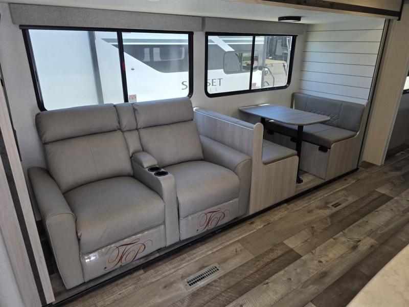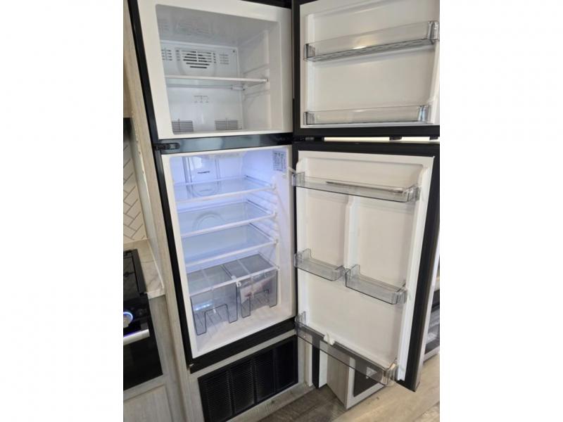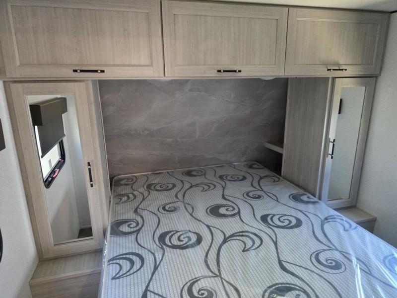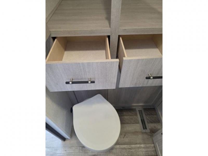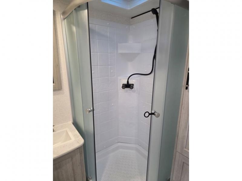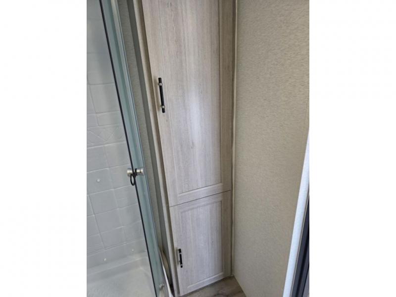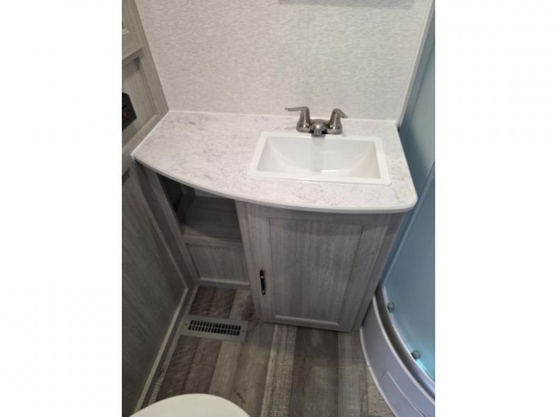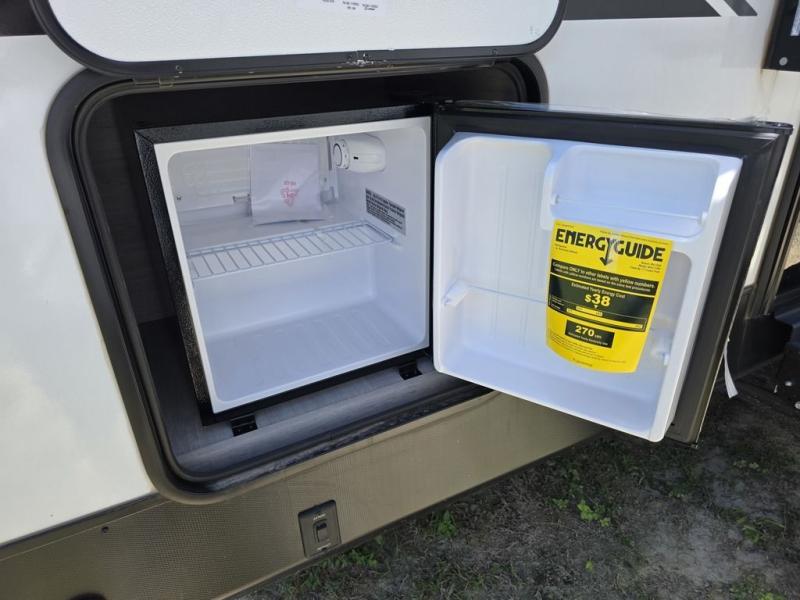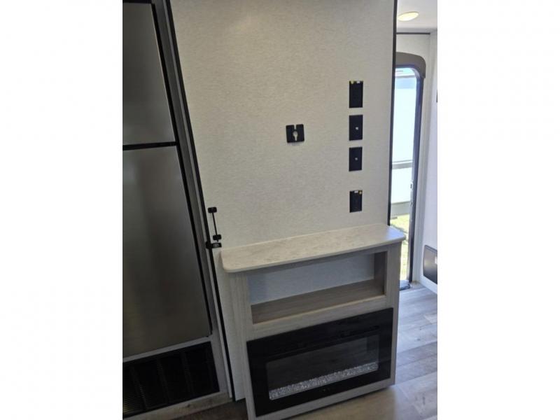 This spacious travel trailer is perfect for the couple who love to travel and camp. You'll have the front private bedroom all to yourselves that includes a queen bed, dual wardrobes and dual shelves to keep your space tidy. There is also a 36" sliding door that will save on space! If you have any guests, they can sleep on the booth dinette when it's not being used to dine at, and there is a home theater sofa across from the fireplace where you can relax in the evenings. A full rear bath is spacious, allowing you to easily get ready in the morning, and there is a linen closet plus a bath wardrobe for clean towels and toiletries.