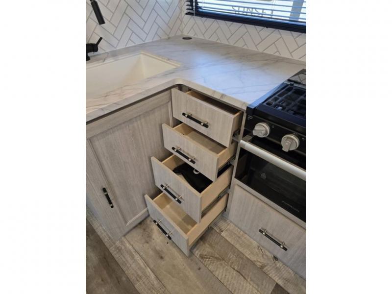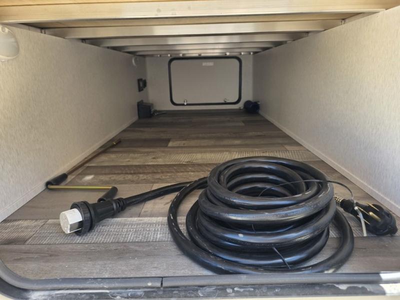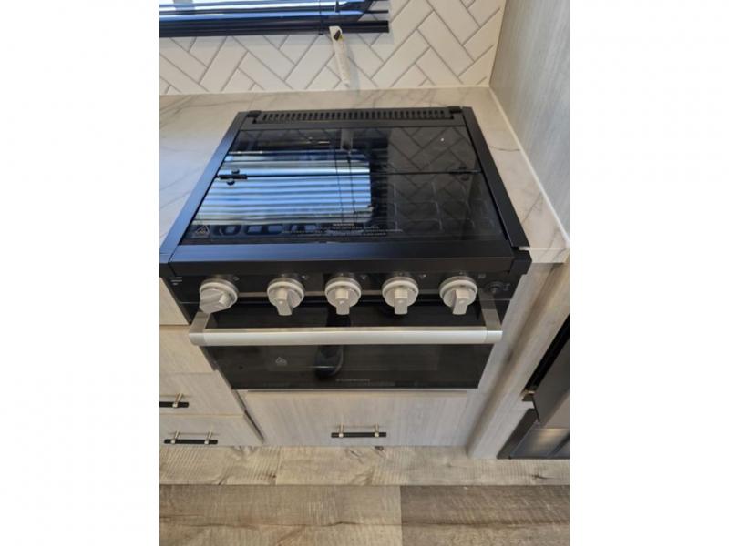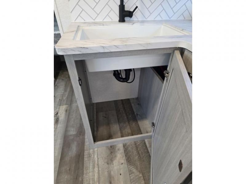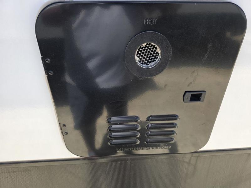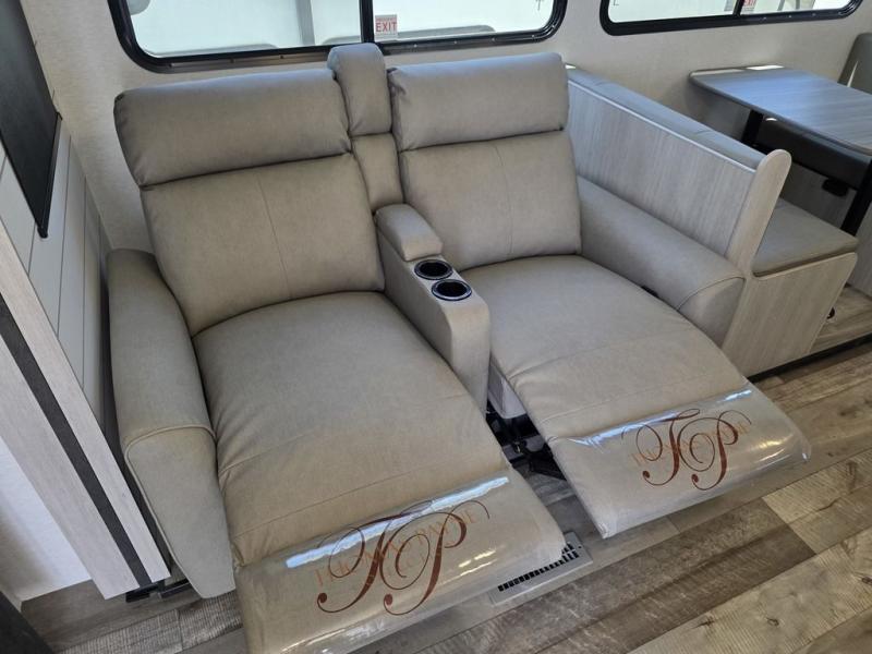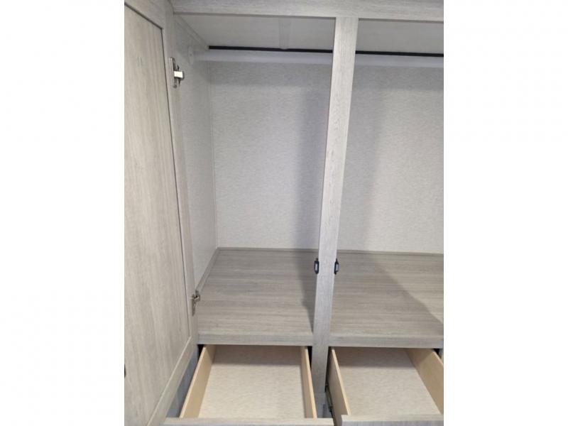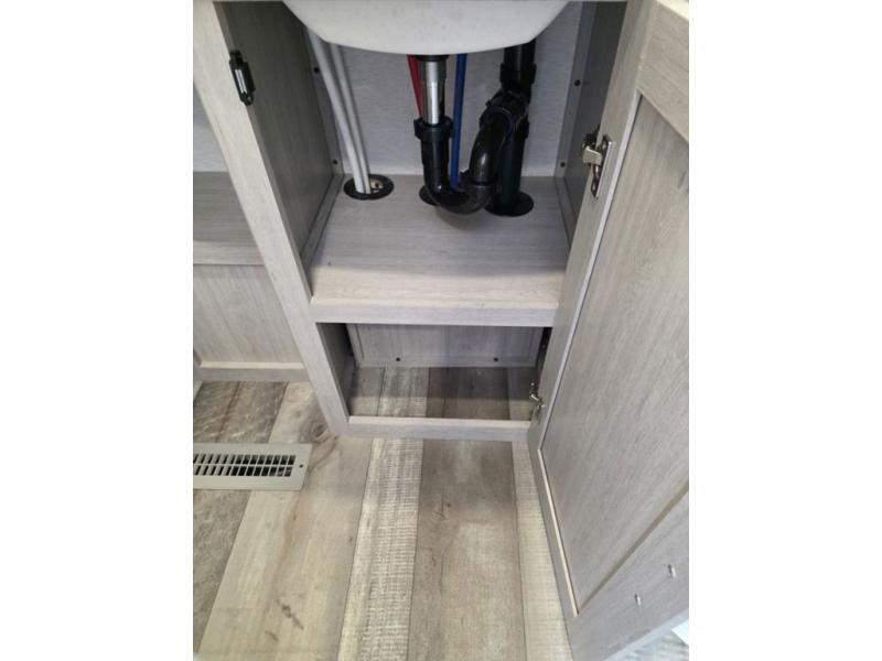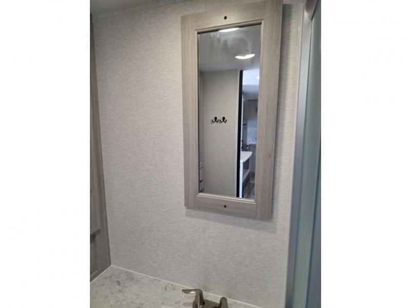 This spacious travel trailer is perfect for the couple who love to travel and camp. You'll have the front private bedroom all to yourselves that includes a queen bed, dual wardrobes and dual shelves to keep your space tidy. There is also a 36" sliding door that will save on space! If you have any guests, they can sleep on the booth dinette when it's not being used to dine at, and there is a home theater sofa across from the fireplace where you can relax in the evenings. A full rear bath is spacious, allowing you to easily get ready in the morning, and there is a linen closet plus a bath wardrobe for clean towels and toiletries.