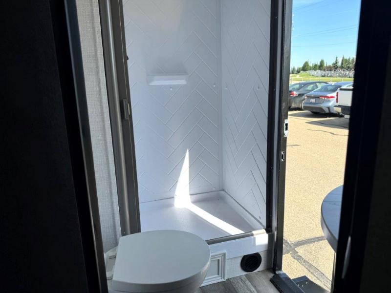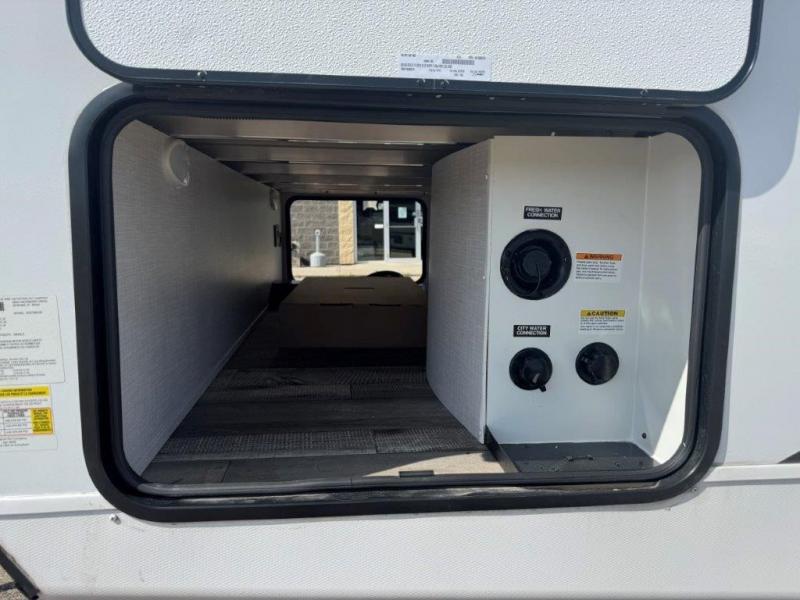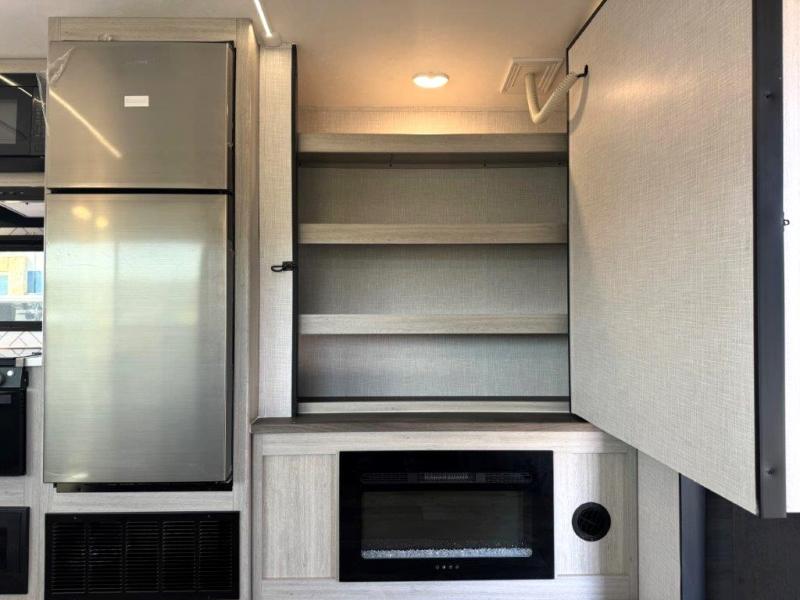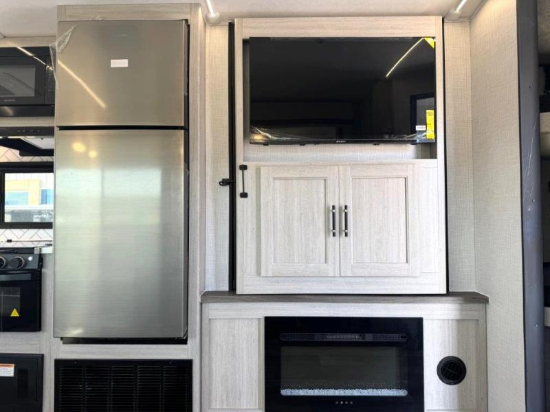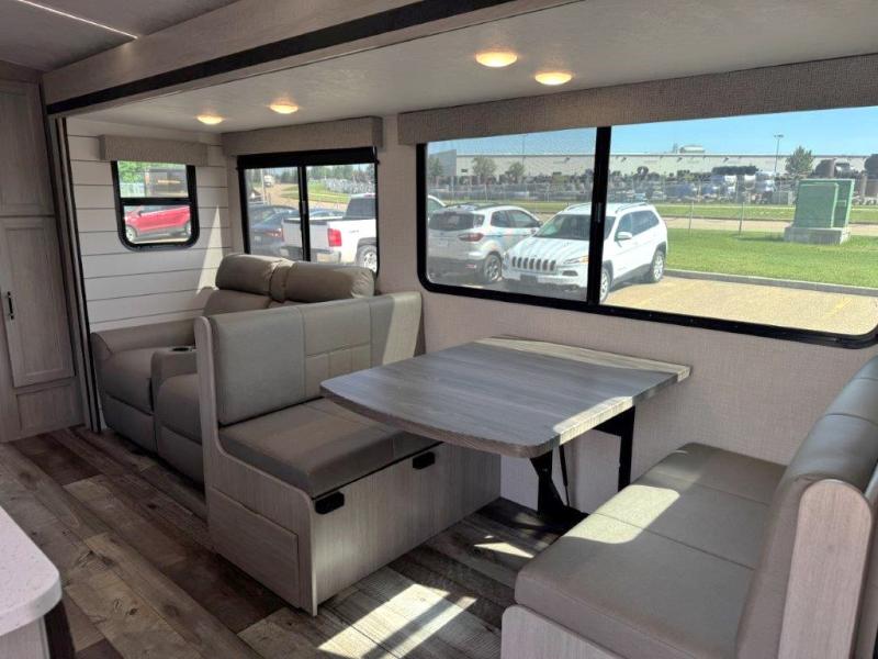 Camping trips are made fun in this spacious travel trailer for eight! There are double-size bunks in the rear corner, with the full bath close by for easy nighttime use. You'll enjoy the front private bedroom all to yourselves, and any other guests can sleep on the sofa and booth dinette. There is also a fireplace here to make this space more cozy. The chef of your group can make home cooked meals in the full kitchen, and they will appreciate the hidden pantry behind the entertainment center to keep food stocked!