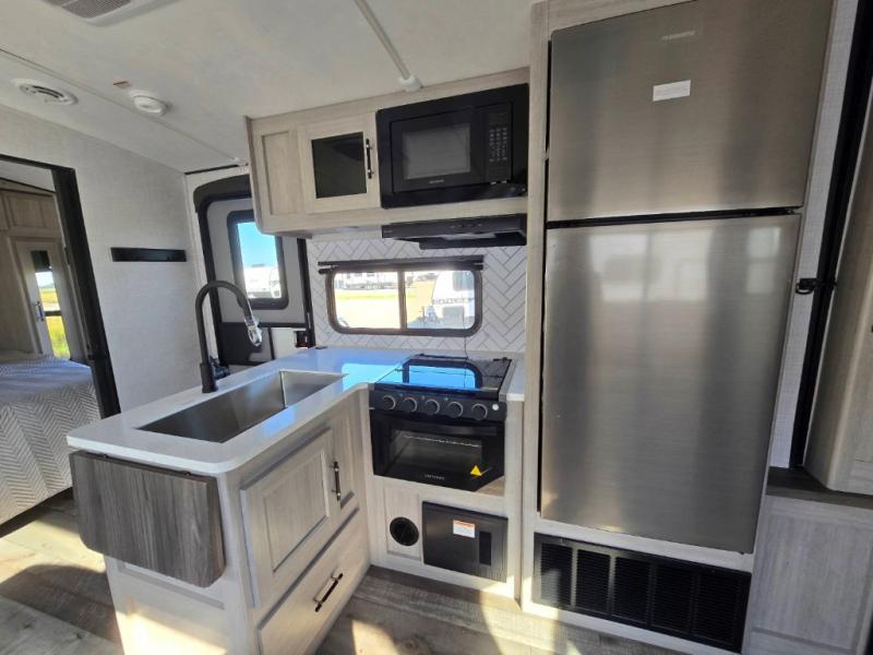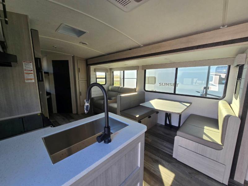 With any Sunset Trailer travel trailer by CrossRoads RV, you will enjoy comfort at every turn! The 5-sided aluminum structure, enclosed underbelly, and HyperDeck flooring provide a durable RV made to last. There is also a power awning with LED lights outdoors, a fiberglass front cap, and a docking station with battery disconnect for easy set-up. Each model includes solid surface kitchen countertops, porcelain toilets, roller shades, and hidden cabinet door hinges to name a few interior comforts!