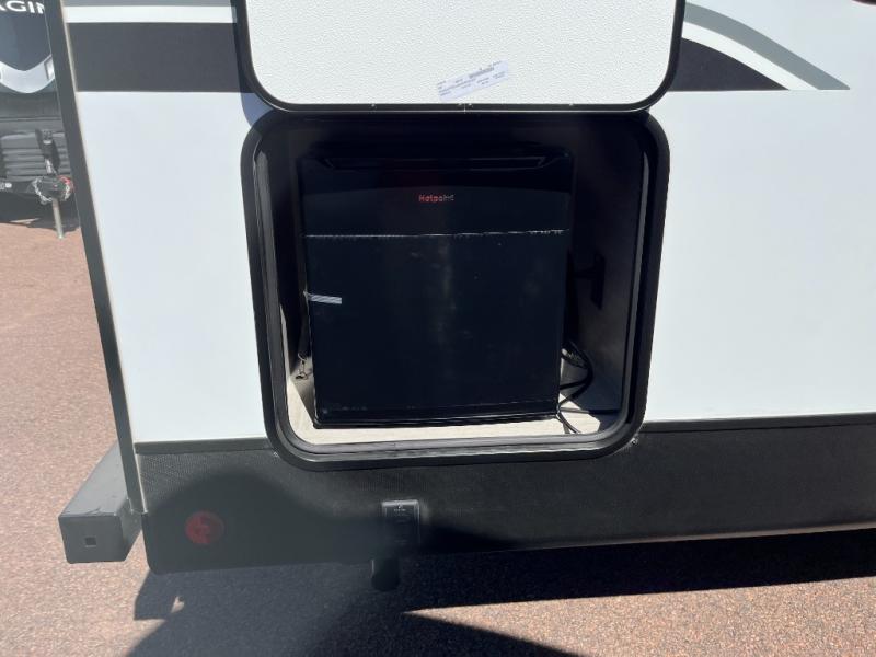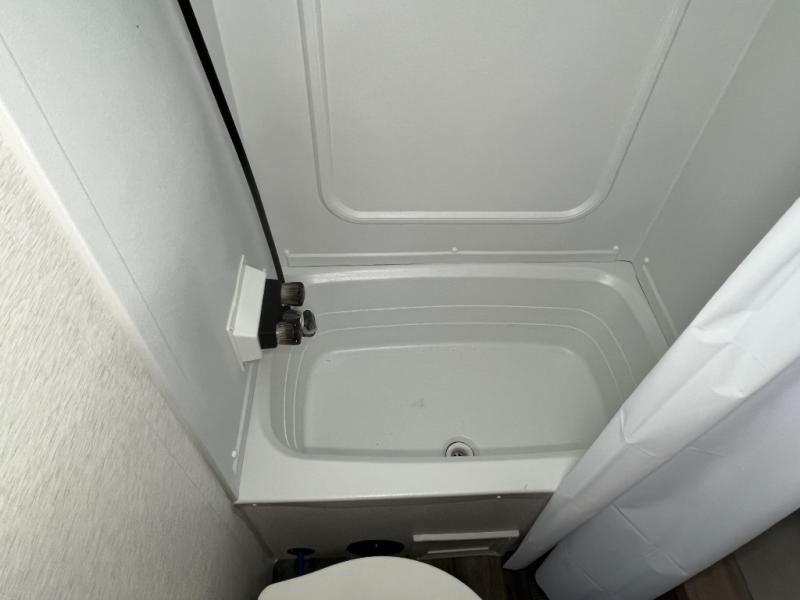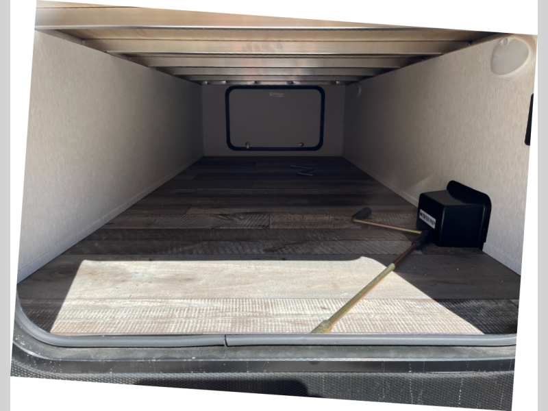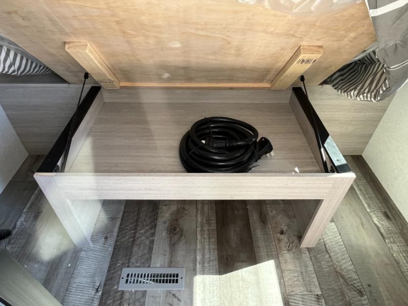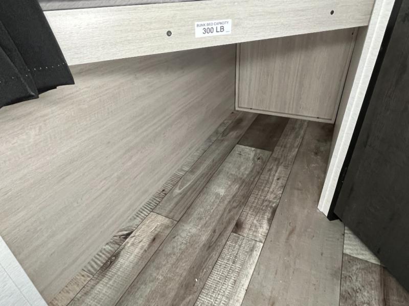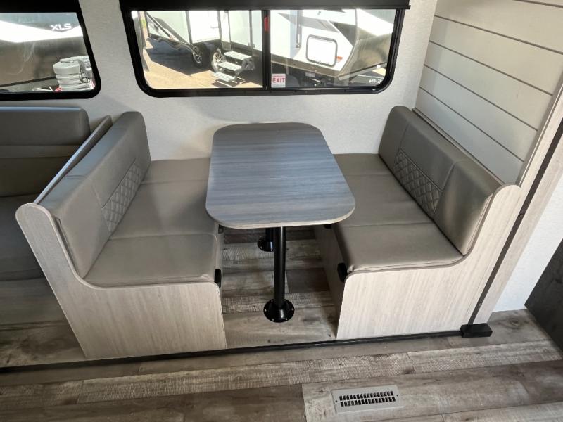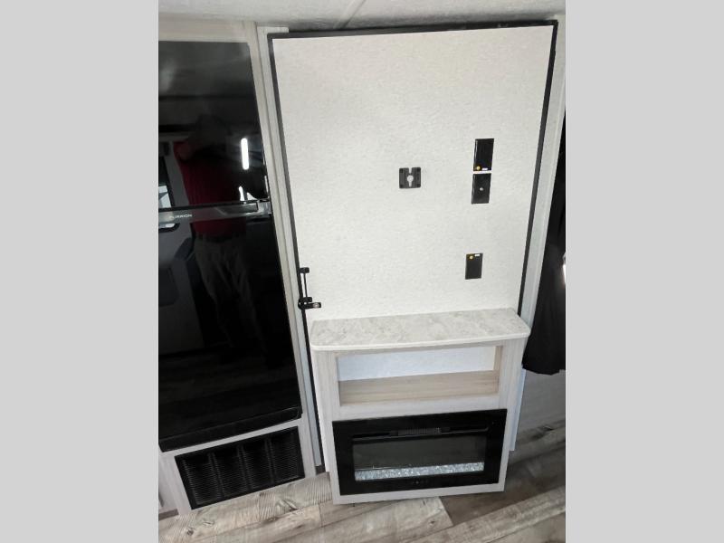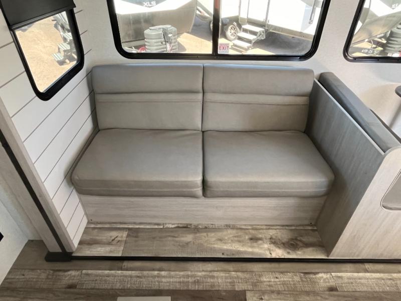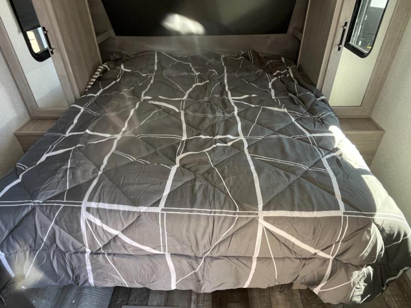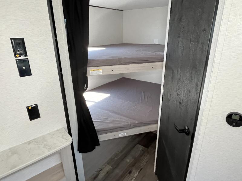 This spacious travel trailer is perfect for the group who loves to travel and camp. You'll have the front private bedroom all to yourselves that includes a queen bed, dual wardrobes and dual shelves to keep your space tidy. There is also a 36" sliding door that will save on space! Your guests or kids can sleep on the double-size bunks, and the full bath with a tub is right next to the bunks for easy nighttime use. The combined kitchen and living area will be a favorite place to hang out with its large slide out, 60" sofa and booth dinette, plus a fireplace with a hidden pantry behind for snacks galore!