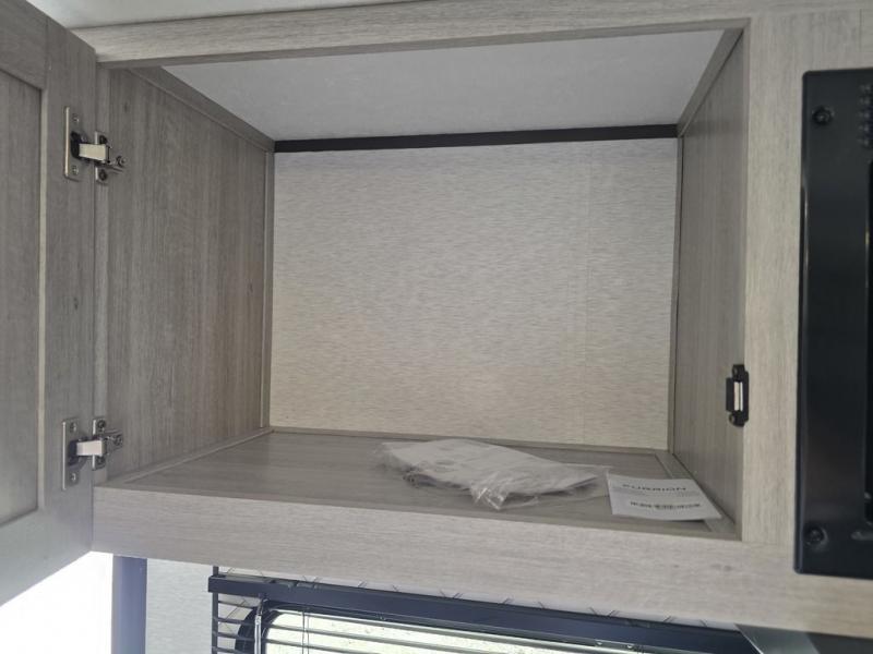 This spacious travel trailer is perfect for the group who loves to travel and camp. You'll have the front private bedroom all to yourselves that includes a queen bed, dual wardrobes and dual shelves to keep your space tidy. There is also a 36" sliding door that will save on space! Your guests or kids can sleep on the double-size bunks, and the full bath with a tub is right next to the bunks for easy nighttime use. The combined kitchen and living area will be a favorite place to hang out with its large slide out, 60" sofa and booth dinette, plus a fireplace with a hidden pantry behind for snacks galore!