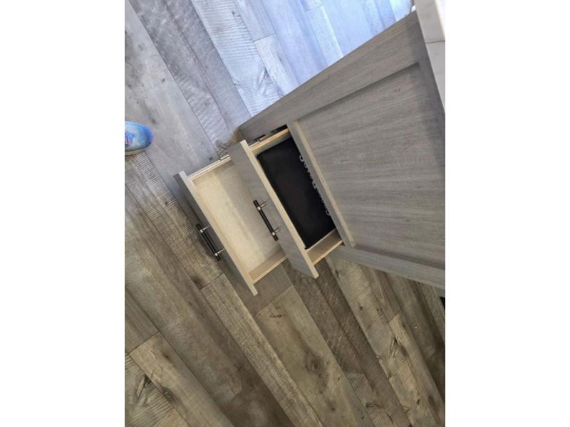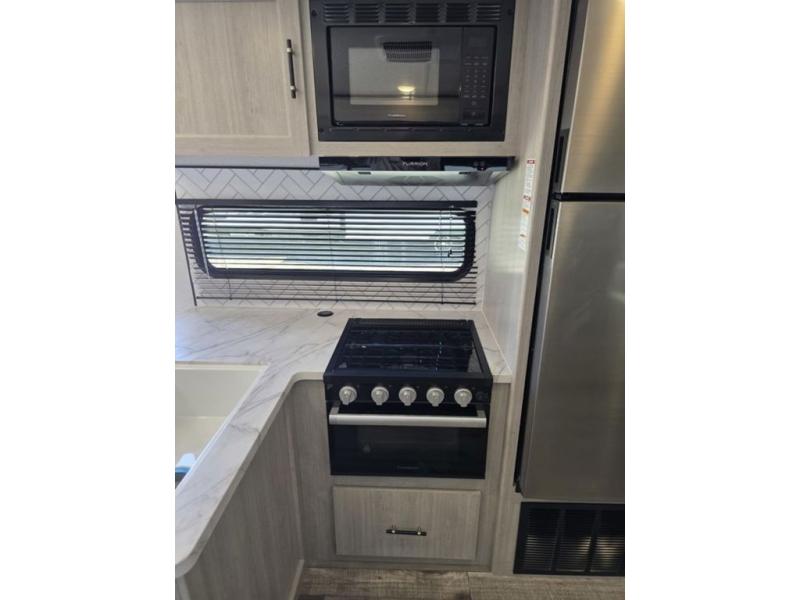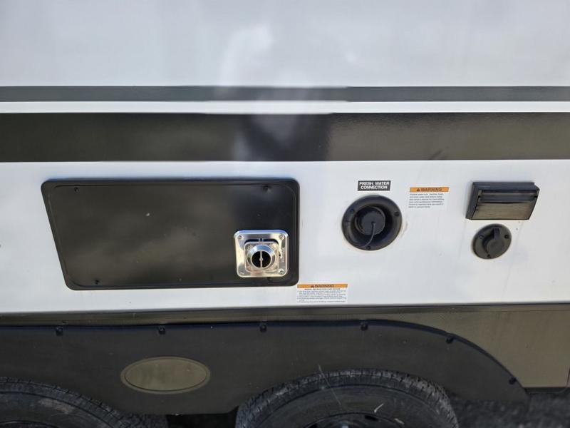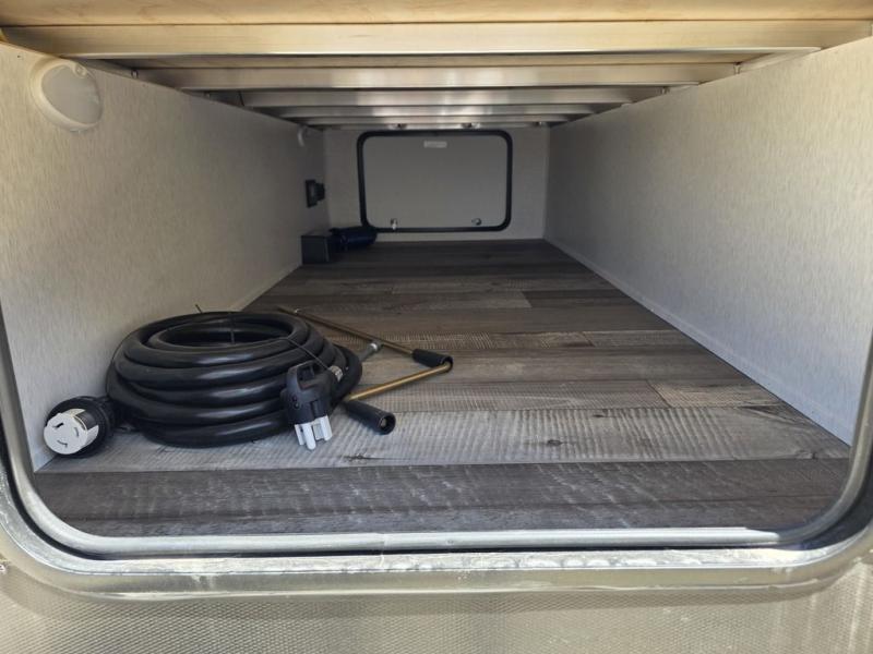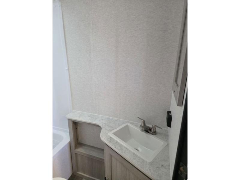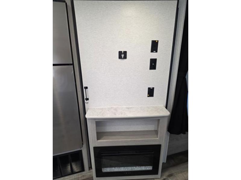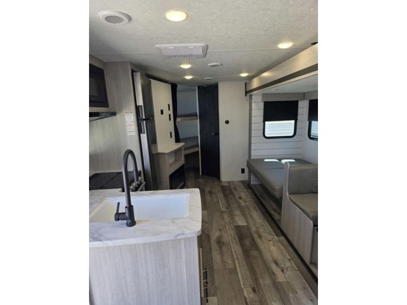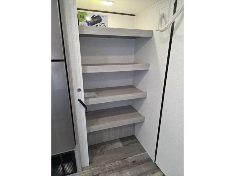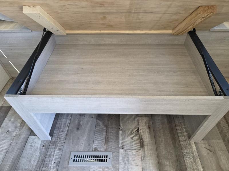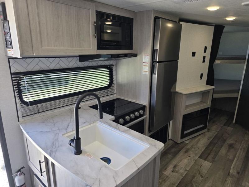 This spacious travel trailer is perfect for the group who loves to travel and camp. You'll have the front private bedroom all to yourselves that includes a queen bed, dual wardrobes and dual shelves to keep your space tidy. There is also a 36" sliding door that will save on space! Your guests or kids can sleep on the double-size bunks, and the full bath with a tub is right next to the bunks for easy nighttime use. The combined kitchen and living area will be a favorite place to hang out with its large slide out, 60" sofa and booth dinette, plus a fireplace with a hidden pantry behind for snacks galore!