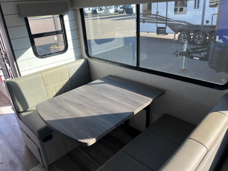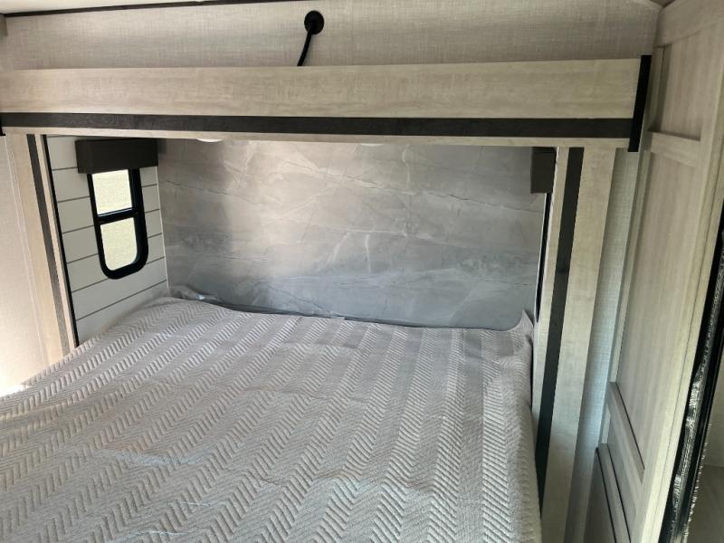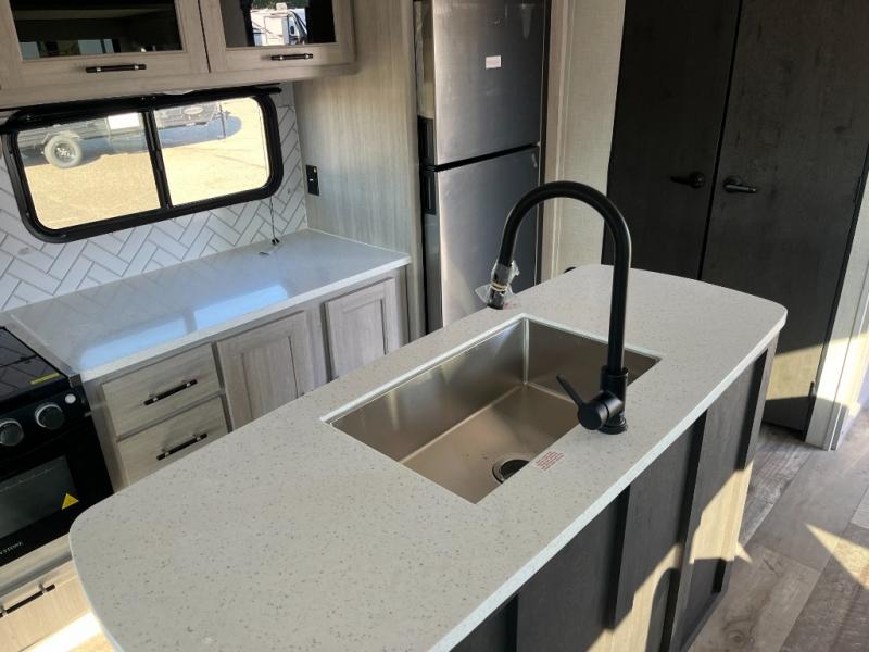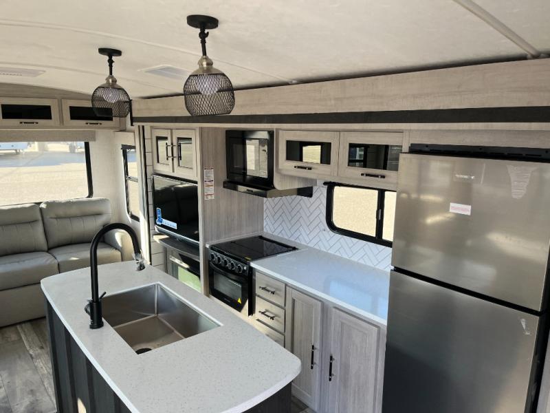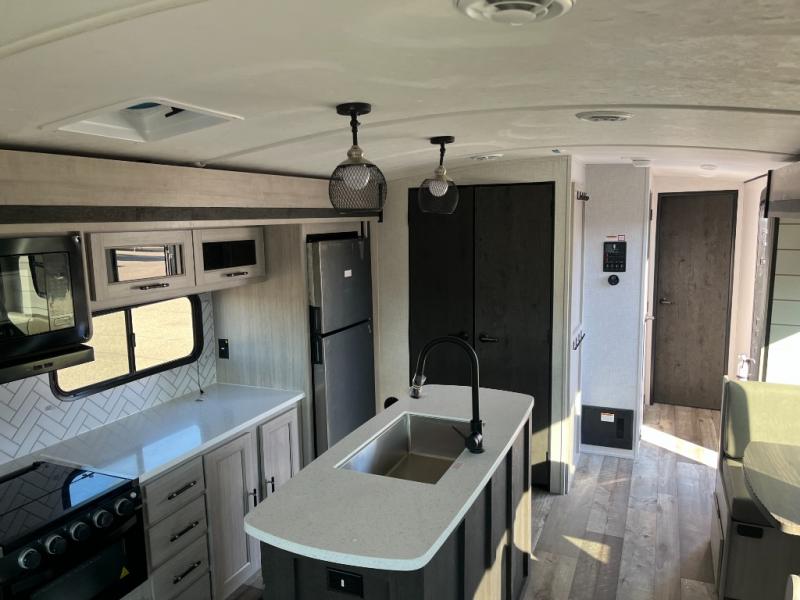 With any Sunset Trailer travel trailer by CrossRoads RV, you will enjoy comfort at every turn! The 5-sided aluminum structure, enclosed underbelly, and HyperDeck flooring provide a durable RV made to last. There is also a power awning with LED lights outdoors, a fiberglass front cap, and a docking station with battery disconnect for easy set-up. Each model includes solid surface kitchen countertops, porcelain toilets, roller shades, and hidden cabinet door hinges to name a few interior comforts!