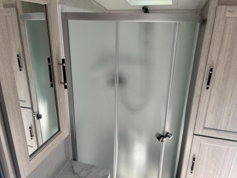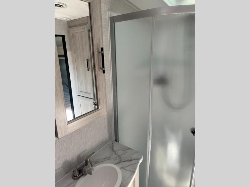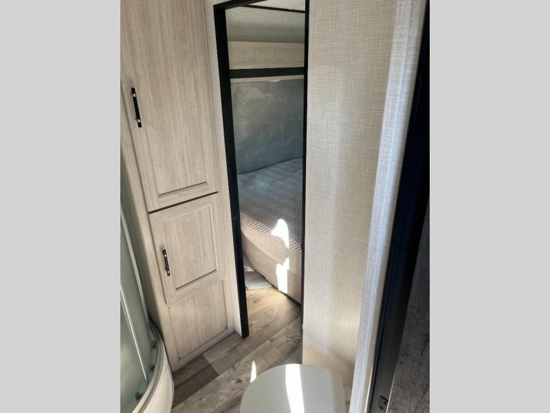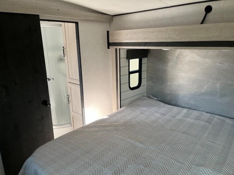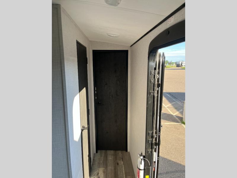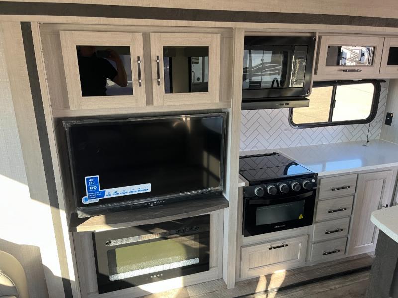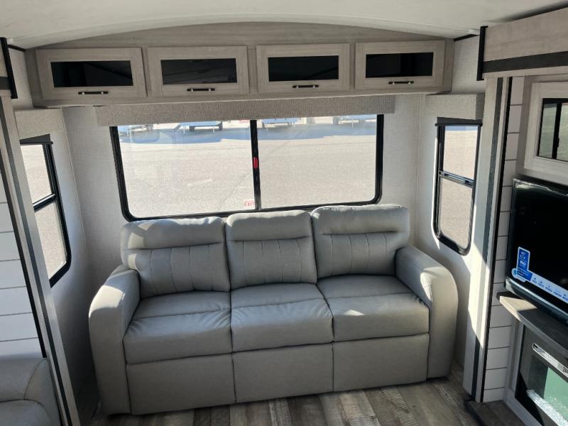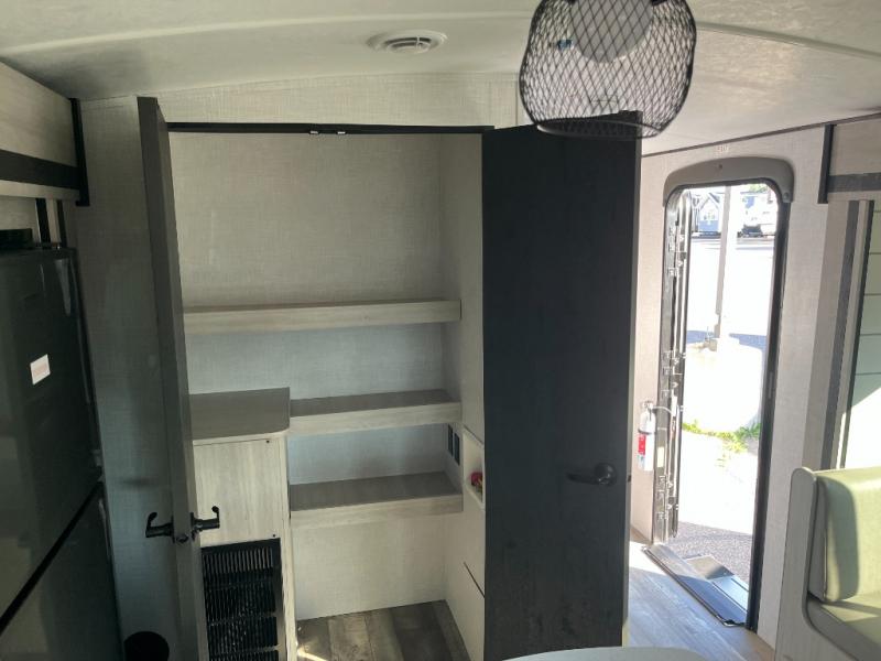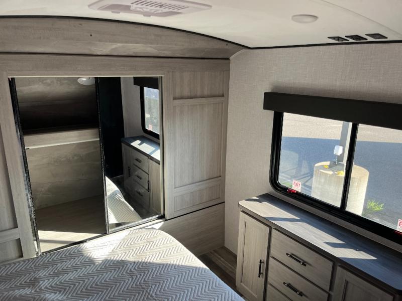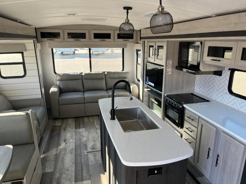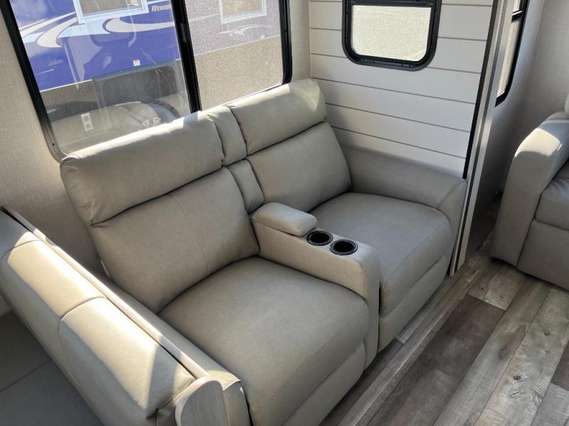 This spacious travel trailer is beaming with luxurious features you are sure to love. The dual opposing slides in the main living area open up the whole space, plus there is a third slide out in the front master suite. The chef of the family will appreciate the kitchen island for additional counter space, and there is a large pantry for all your non-perishables. This space has also been prepped to add an optional washer and dryer if you choose. Your family will find plenty of seating space on the rear 82" tri-fold sofa, the XL booth dinette, and the theater seating. The dual entry bath creates a front master bedroom, and you'll find plenty of storage space here, including a chest of drawers and a large front shelf!