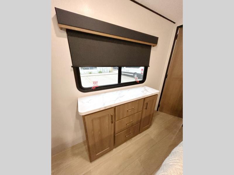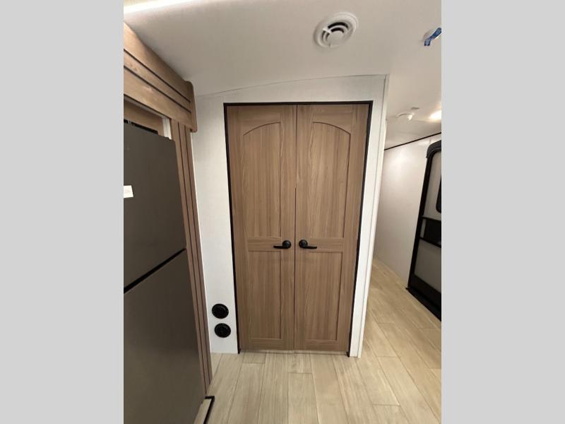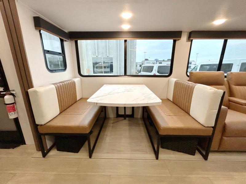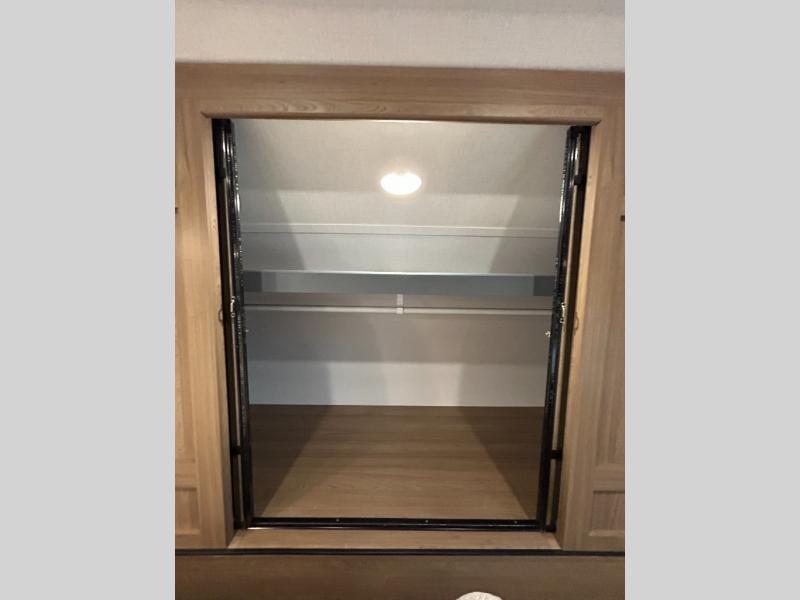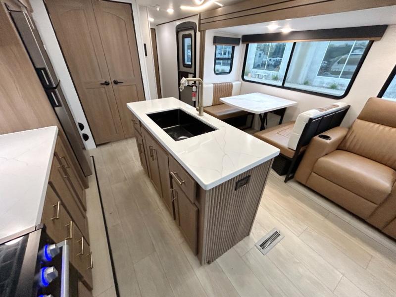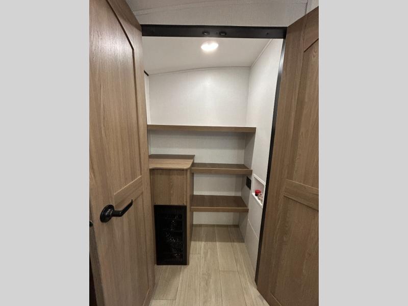 This spacious travel trailer is beaming with luxurious features you are sure to love. The dual opposing slides in the main living area open up the whole space, plus there is a third slide out in the front master suite. The chef of the family will appreciate the kitchen island for additional counter space, and there is a large pantry for all your non-perishables. This space has also been prepped to add an optional washer and dryer if you choose. Your family will find plenty of seating space on the rear 82" tri-fold sofa, the XL booth dinette, and the theater seating. The dual entry bath creates a front master bedroom, and you'll find plenty of storage space here, including a chest of drawers and a large front shelf!