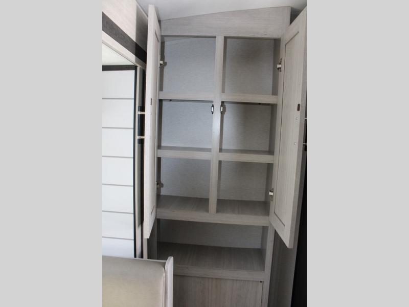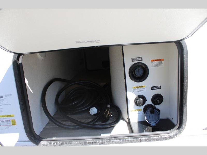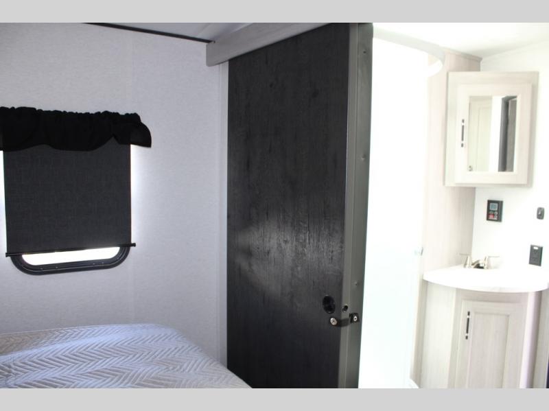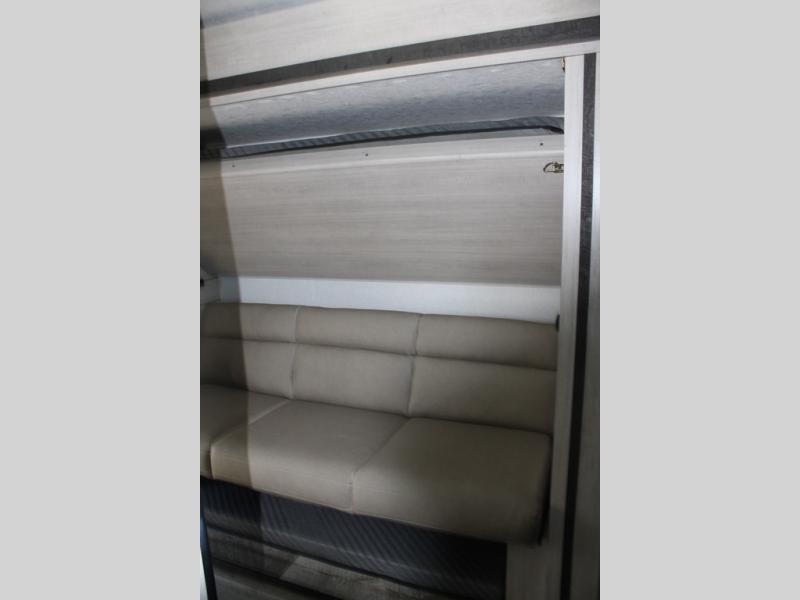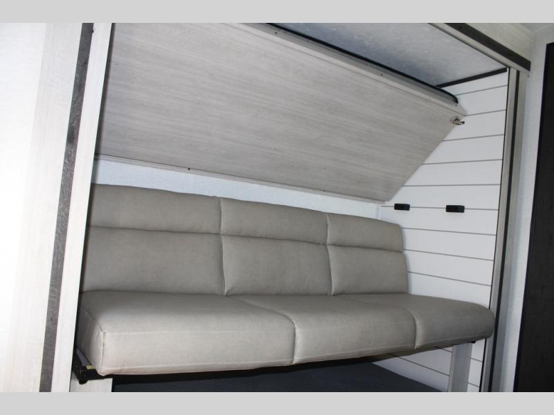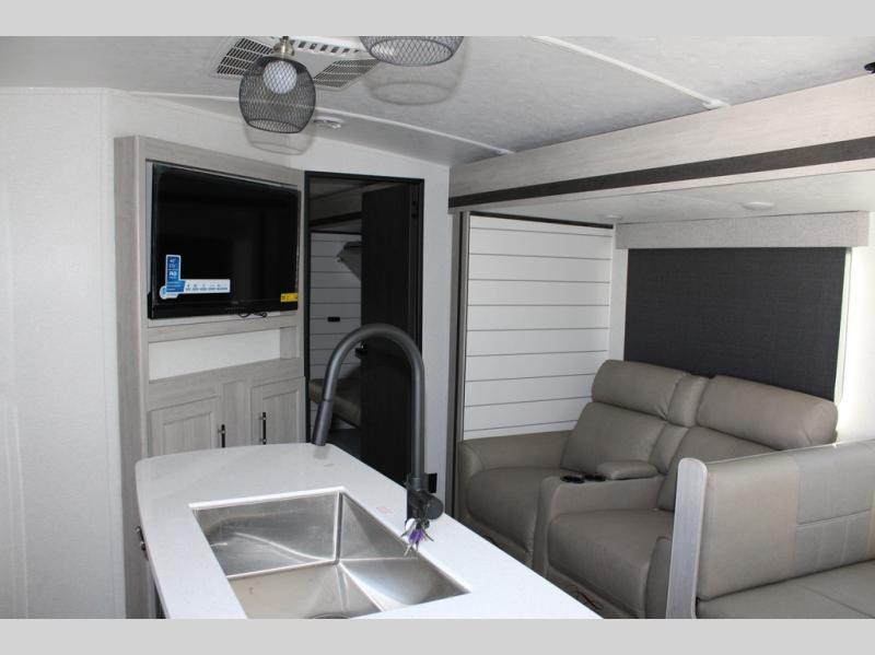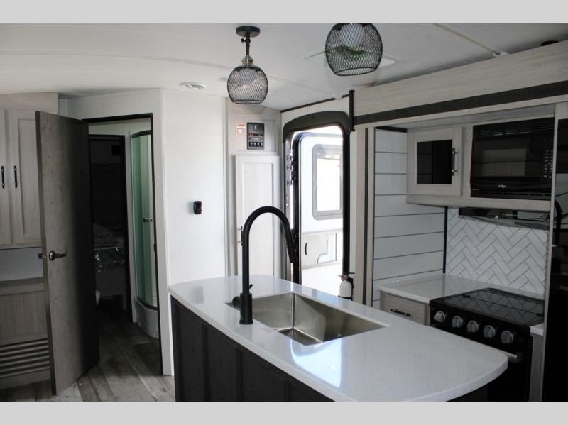 This travel trailer is packed with convenient features and luxury comforts for a camping trip you won't soon forget. Once you arrive at the campground, put out the electric awning and make a quick lunch on the exterior camp kitchen. The kitchen island inside will be the perfect place to cut up all the fixings for the burgers and you can grab the chips from the pantry. The kids will love the private bunkhouse that includes two bunks, a jackknife sofa with a kick, plus a dual entry half bath for convenience. The full walk-through bath will create a front master bedroom you are sure to love. Here, the king bed will provide a great night's rest and there are dual wardrobes for all your clothes. Plus there is a convenient shoe storage and pet station for your trusted loyal friends!