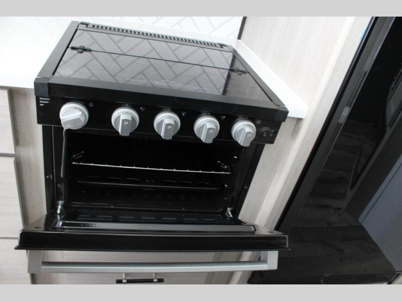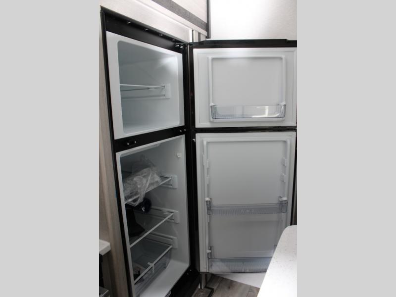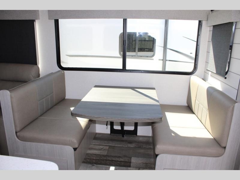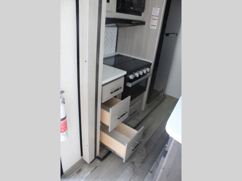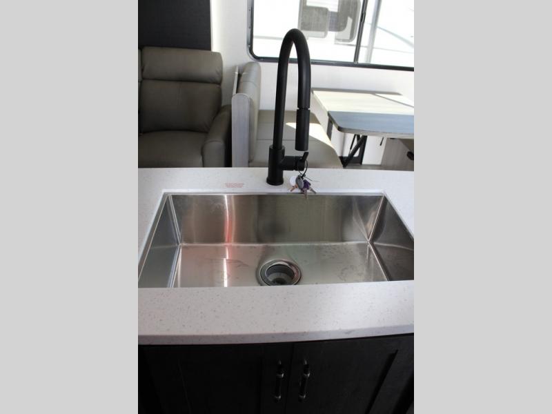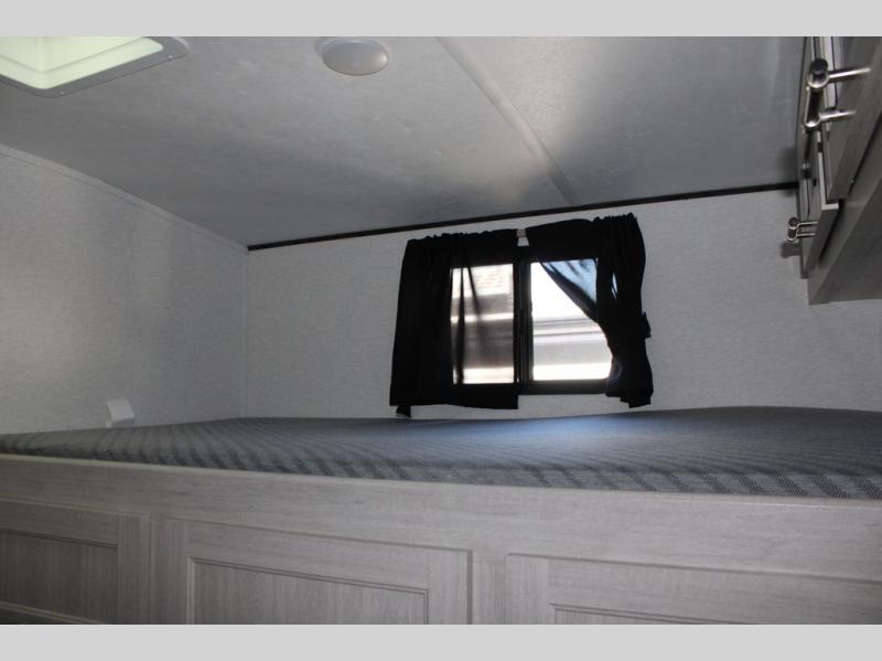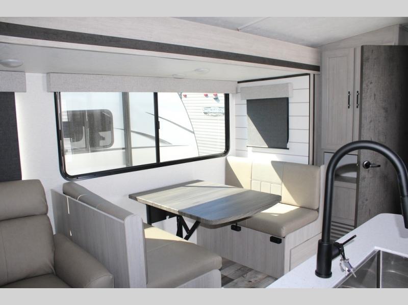 With any Sunset Trail travel trailer by CrossRoads RV, the interior offers a stainless steel farmhouse sink with a cover, solid surface kitchen countertops, and a docking station with 12 Volt, USB Port, and 110 Outlets. Also included is a 13,500 BTU air conditioner plus upgraded insulation with roof and floor reflective foil for added comfort, plus sturdy construction elements like a plywood bed board with strut assist, residential wood window trim, and hardwood cabinet doors. Make your lightweight and comfortable RV decision today!