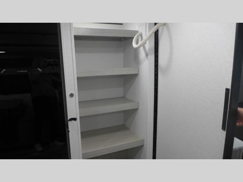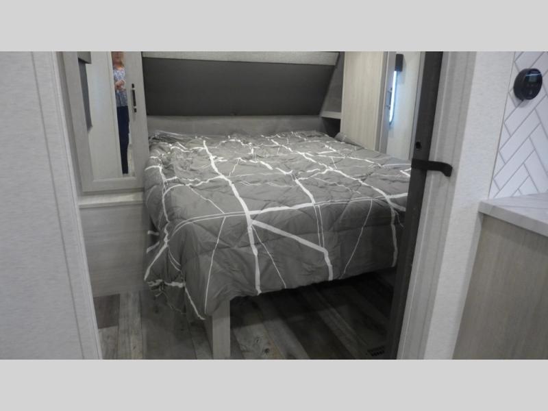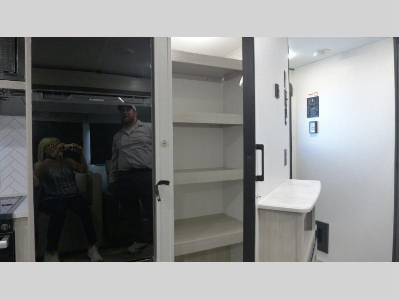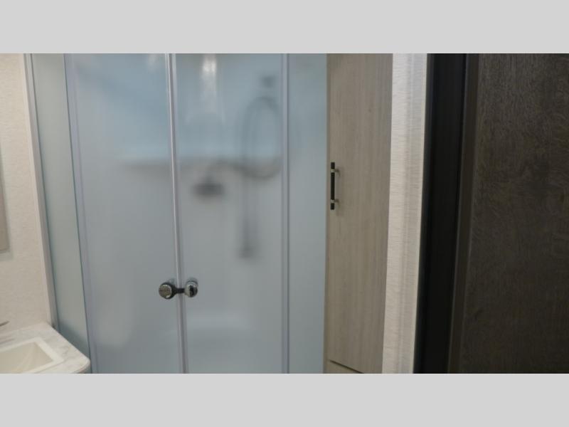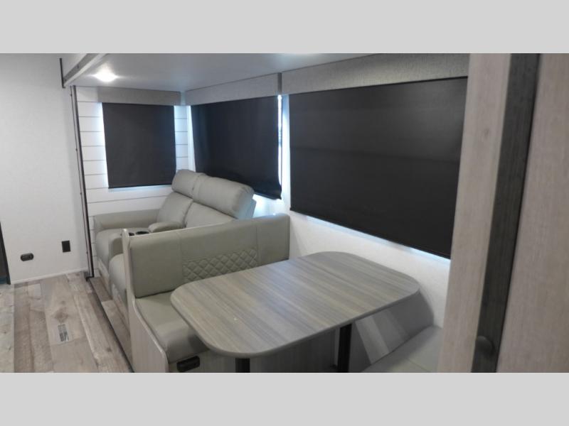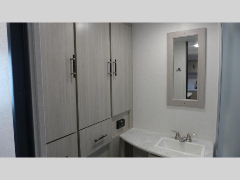 This spacious travel trailer is perfect for the couple who love to travel and camp. You'll have the front private bedroom all to yourselves that includes a queen bed, dual wardrobes and dual shelves to keep your space tidy. There is also a 36" sliding door that will save on space! If you have any guests, they can sleep on the booth dinette when it's not being used to dine at, and there is a home theater sofa across from the fireplace where you can relax in the evenings. A full rear bath is spacious, allowing you to easily get ready in the morning, and there is a linen closet plus a bath wardrobe for clean towels and toiletries.