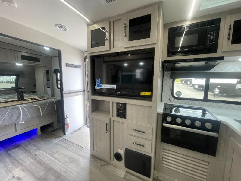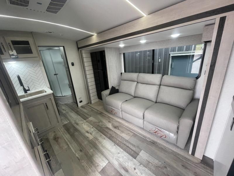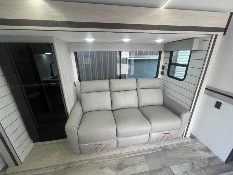 It's time to upgrade your RV to this spacious travel trailer! The slide out in the main living area will provide the dog space to stretch out, and within the slide out you'll find the tri-fold sofa/chaise lounge for your comfort. The full rear bath is both spacious and convenient with its shower skylight, medicine cabinet, and linen closet for clean towels. Head to the kitchen to prepare lunch on the glass top range or take your preparations outside to cook on the exterior camp kitchen. This model also features a front private bedroom with a king bed, dual wardrobes, shoe storage, and a pet station for your loyal buddy, plus there is an available optional 8 cu. ft. refrigerator, and more!