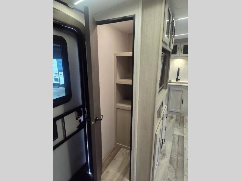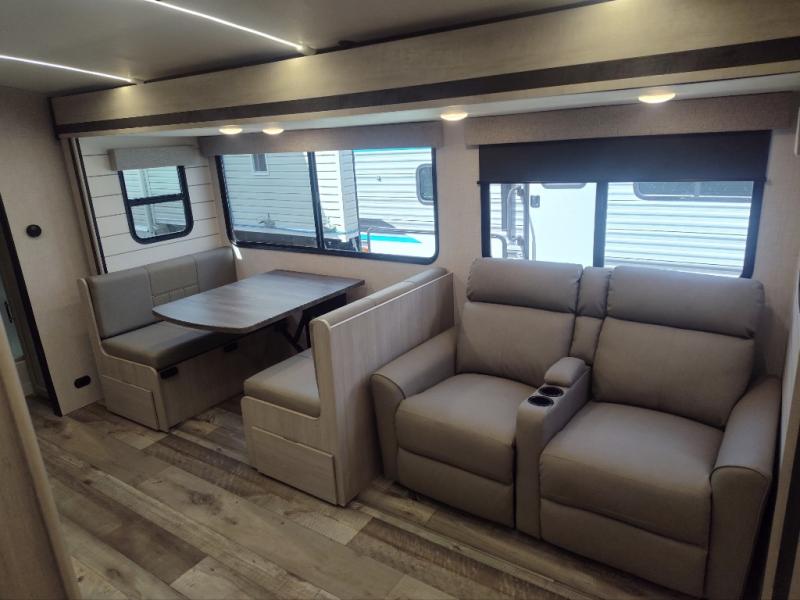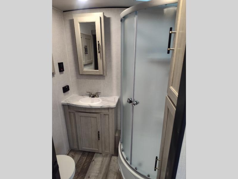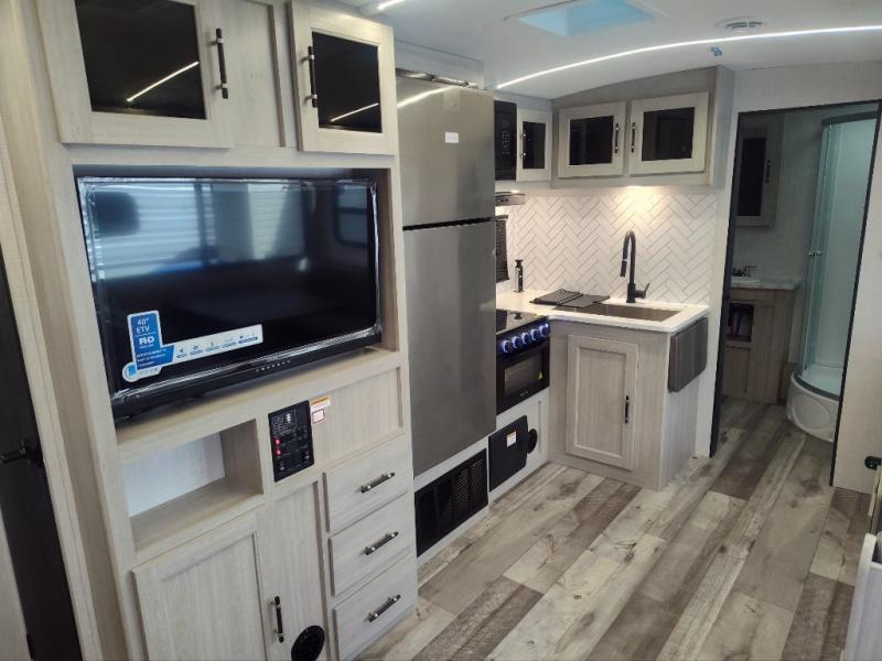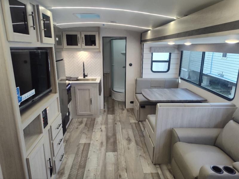 You will love the added interior space you have in this travel trailer thanks to the large slide out in the main living area. Here, you'll enjoy playing cards at the XL booth dinette and relaxing on the tri-fold sofa. Make home-cooked meals on the glass top range or use the exterior camp kitchen. There is even an exterior refrigerator for cold drinks, and the power awning will shade you from the hot summer sun. This model features a full rear bath for added privacy, and the shower skylight will allow natural light in. The front private bedroom includes a king bed, dual wardrobes, plus a shoe storage and pet station for your convenience!