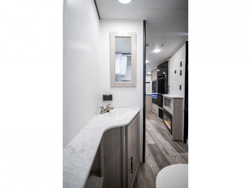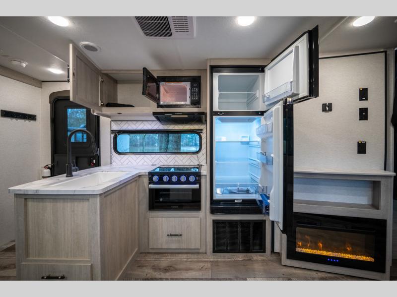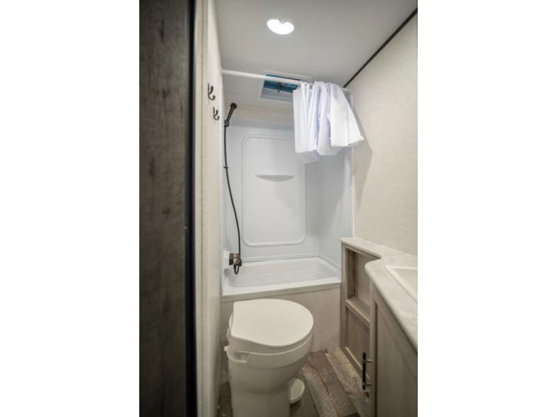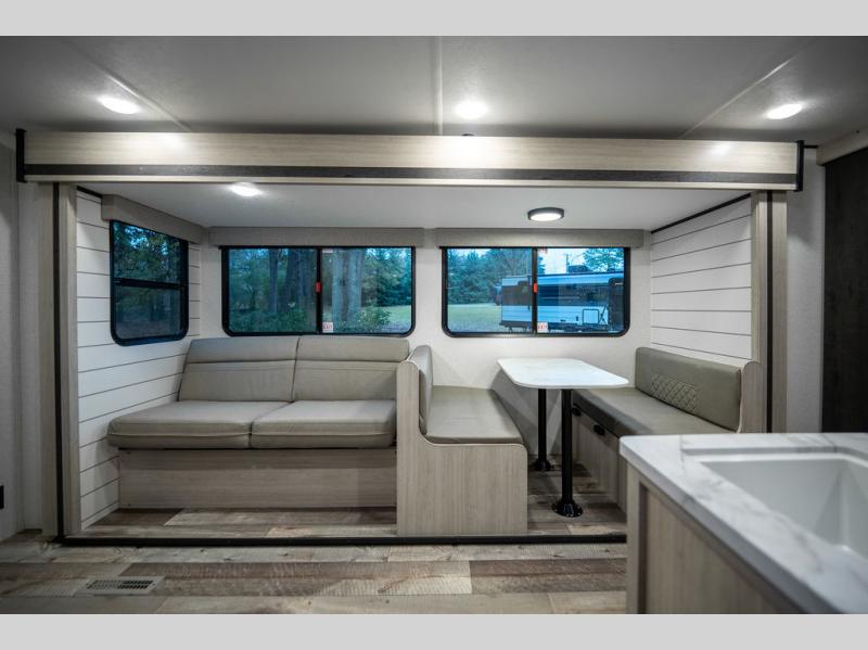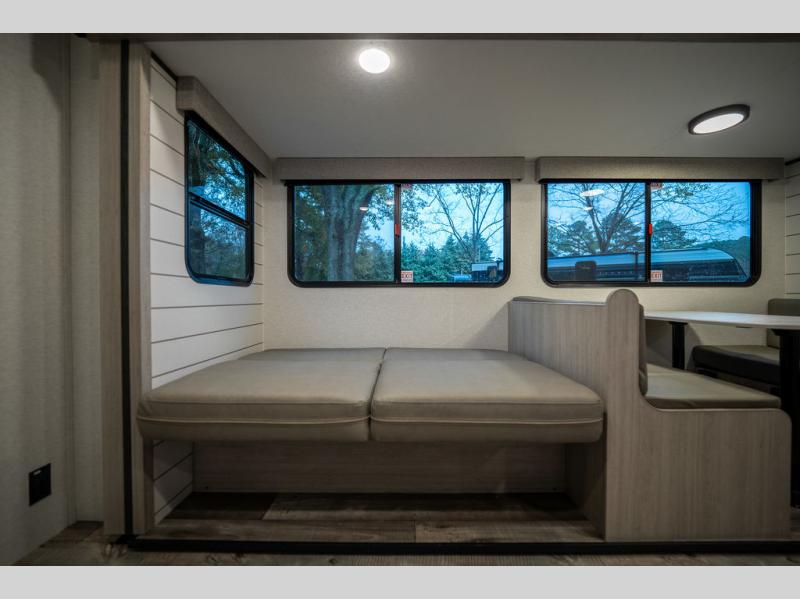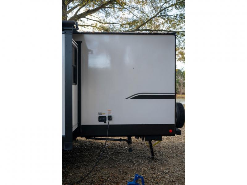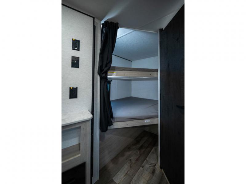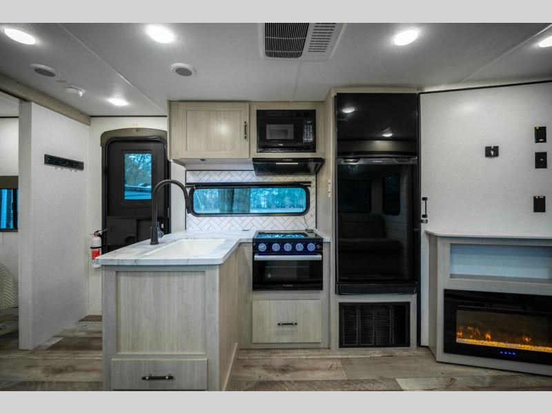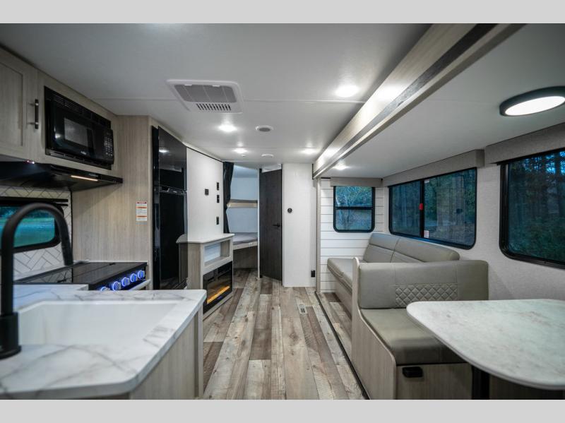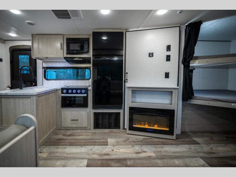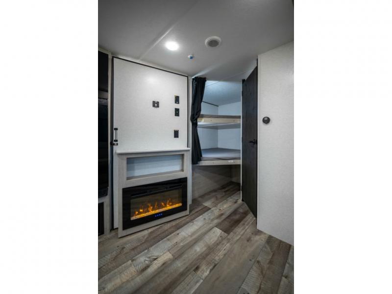 This spacious travel trailer is perfect for the group who loves to travel and camp. You'll have the front private bedroom all to yourselves that includes a queen bed, dual wardrobes and dual shelves to keep your space tidy. There is also a 36" sliding door that will save on space! Your guests or kids can sleep on the double-size bunks, and the full bath with a tub is right next to the bunks for easy nighttime use. The combined kitchen and living area will be a favorite place to hang out with its large slide out, 60" sofa and booth dinette, plus a fireplace with a hidden pantry behind for snacks galore!