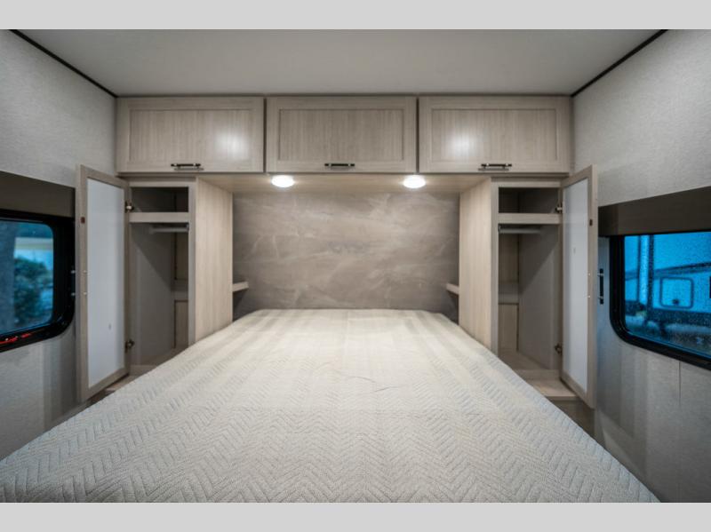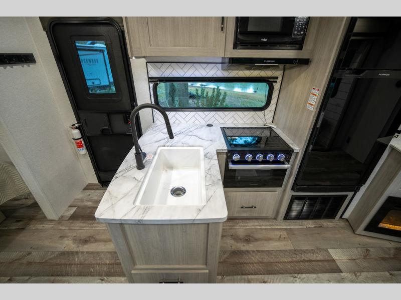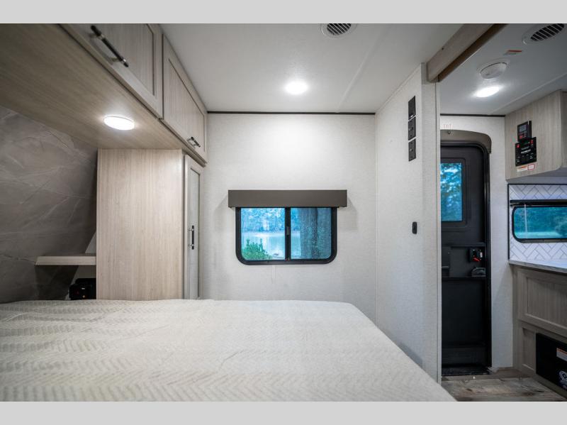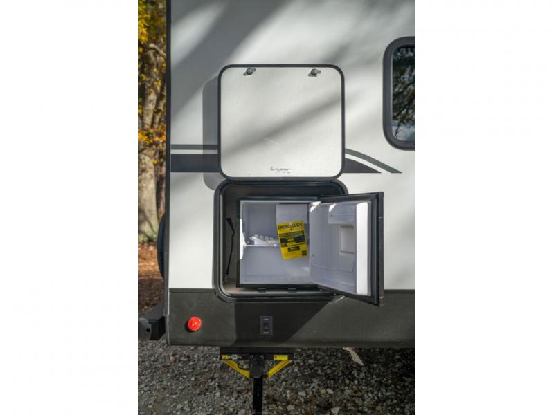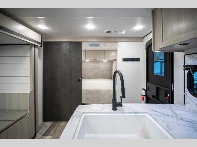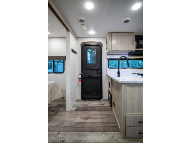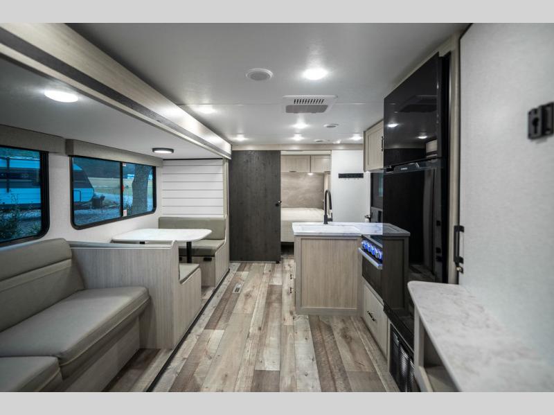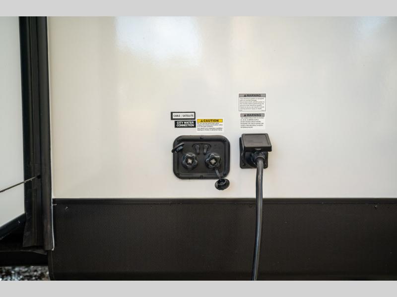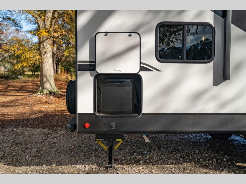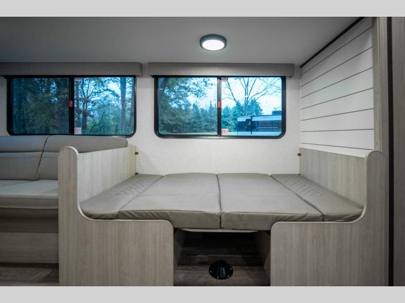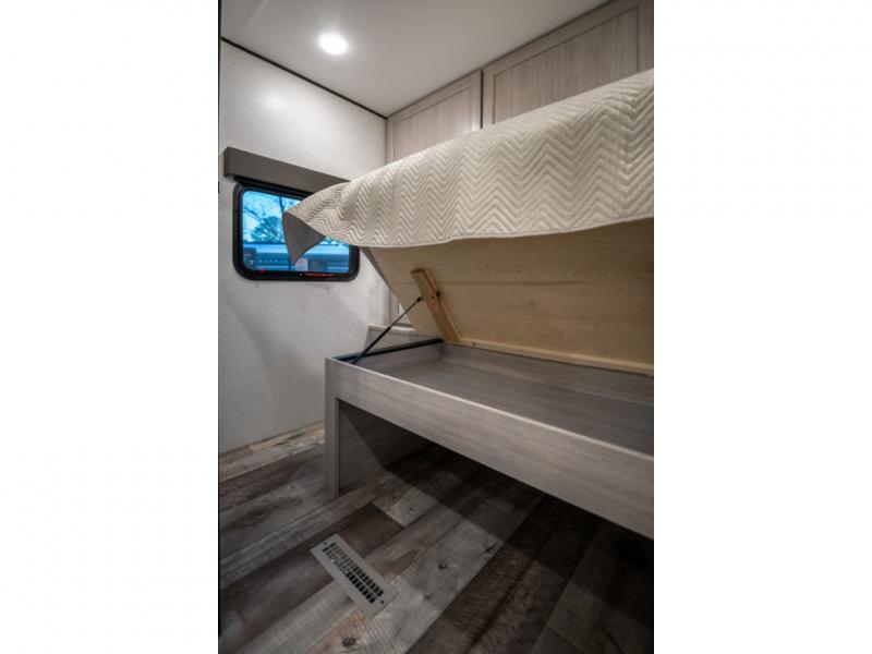 This spacious travel trailer is perfect for the group who loves to travel and camp. You'll have the front private bedroom all to yourselves that includes a queen bed, dual wardrobes and dual shelves to keep your space tidy. There is also a 36" sliding door that will save on space! Your guests or kids can sleep on the double-size bunks, and the full bath with a tub is right next to the bunks for easy nighttime use. The combined kitchen and living area will be a favorite place to hang out with its large slide out, 60" sofa and booth dinette, plus a fireplace with a hidden pantry behind for snacks galore!