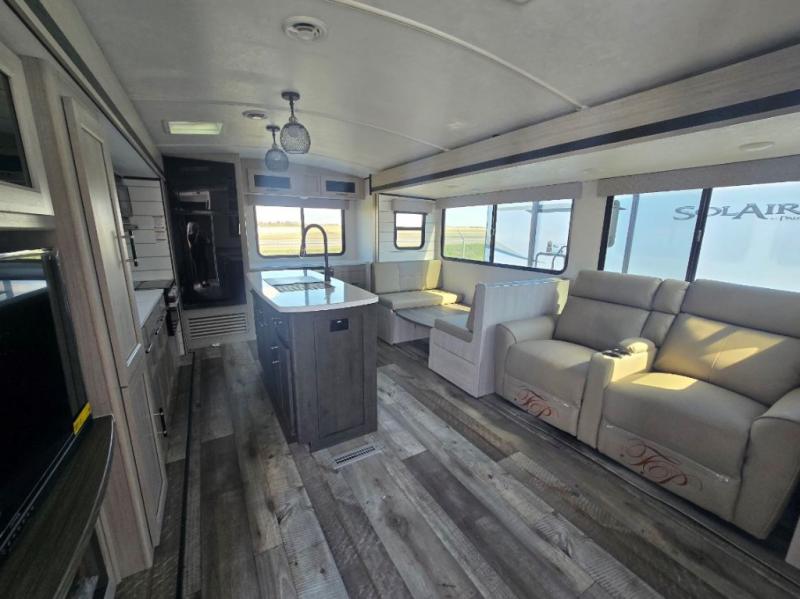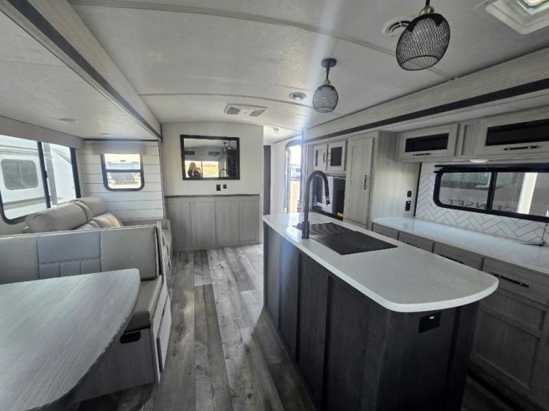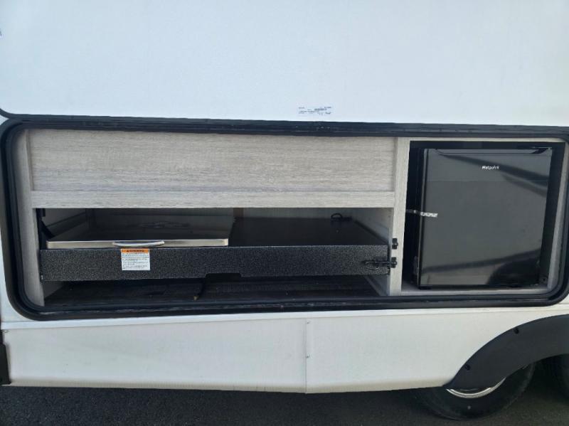 What could be more comfortable than a king bed, dual opposing slides for added space, plus an exterior camp kitchen? You will get all that and more when you choose this spacious travel trailer. The chef of the family will love the kitchen island for added space to cook and clean up, and there is plenty of rear counter space to set out fresh fruits and veggies. The tri-fold sofa sits directly across from the fireplace for a cozy evening indoors, and if you're not needing the extra sleeping space you can choose the optional theater seating in place of the tri-fold sofa. You will truly feel at home in the front private bedroom that includes a king bed, dual wardrobes, plus a third wardrobe in the closet. There is even a pet station that will make camping with your dog easier than ever!