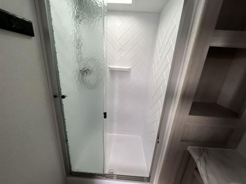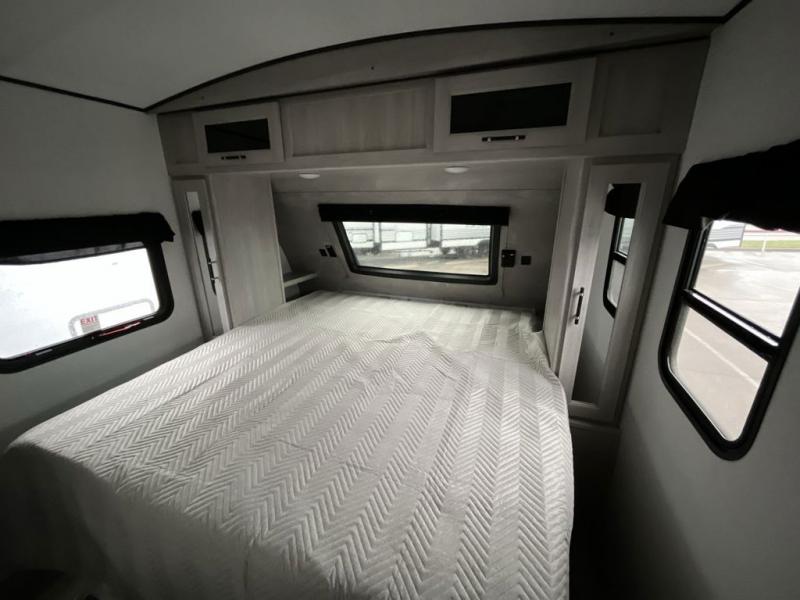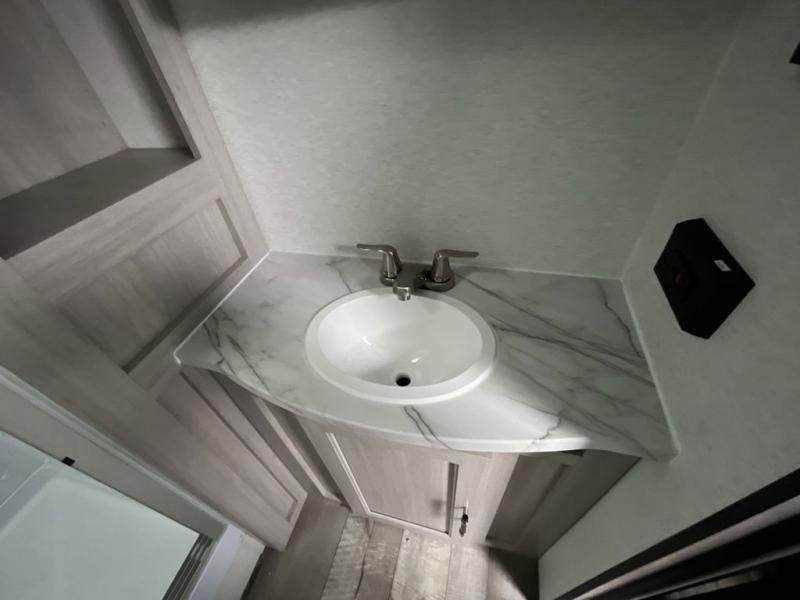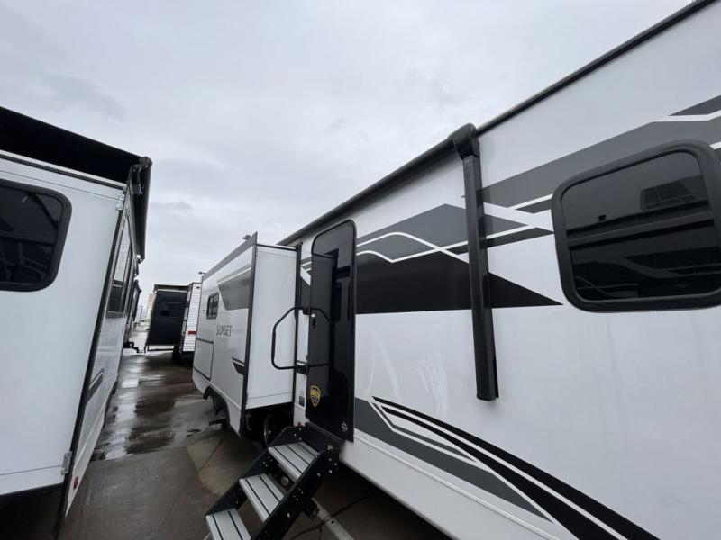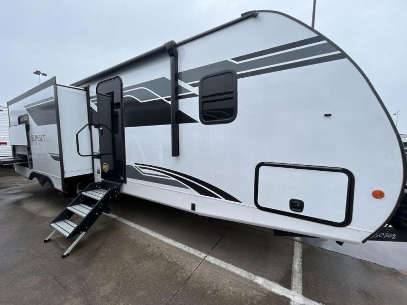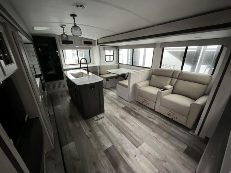 With any Sunset Trailer travel trailer by CrossRoads RV, you will enjoy comfort at every turn! The 5-sided aluminum structure, enclosed underbelly, and HyperDeck flooring provide a durable RV made to last. There is also a power awning with LED lights outdoors, a fiberglass front cap, and a docking station with battery disconnect for easy set-up. Each model includes solid surface kitchen countertops, porcelain toilets, roller shades, and hidden cabinet door hinges to name a few interior comforts!