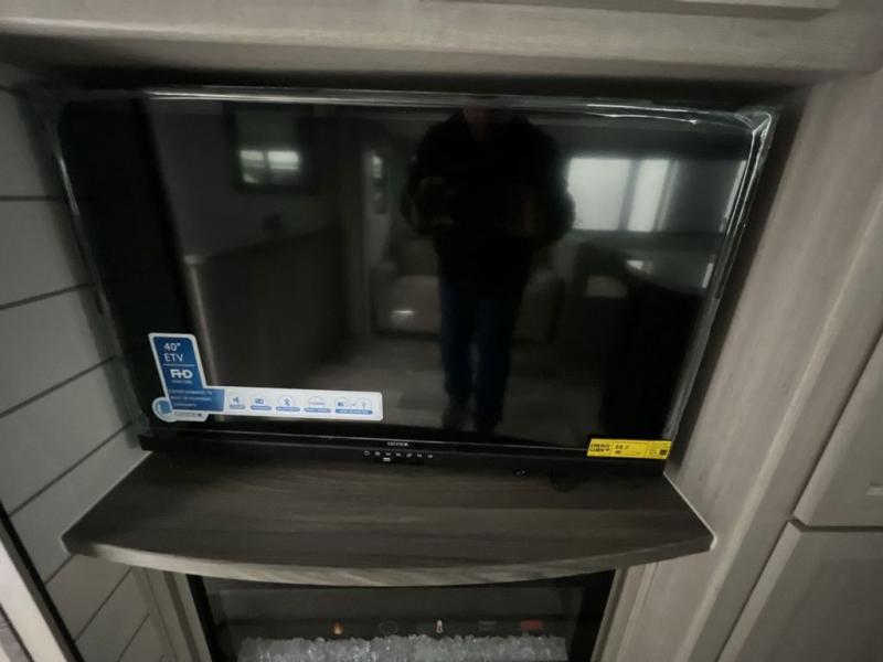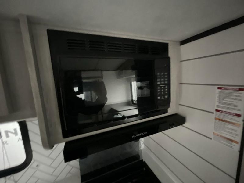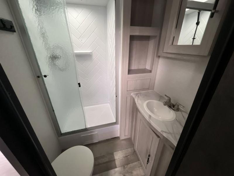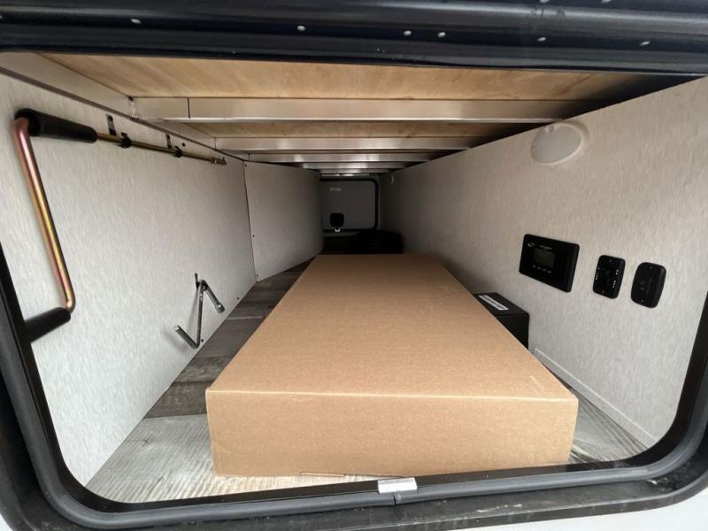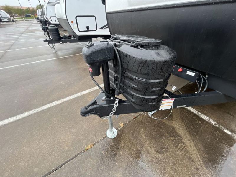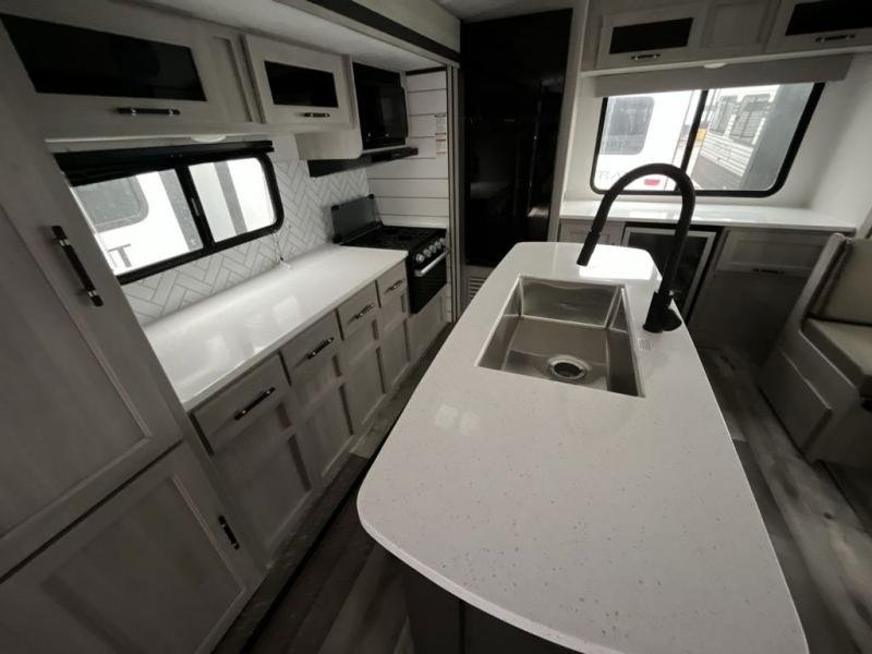 What could be more comfortable than a king bed, dual opposing slides for added space, plus an exterior camp kitchen? You will get all that and more when you choose this spacious travel trailer. The chef of the family will love the kitchen island for added space to cook and clean up, and there is plenty of rear counter space to set out fresh fruits and veggies. The tri-fold sofa sits directly across from the fireplace for a cozy evening indoors, and if you're not needing the extra sleeping space you can choose the optional theater seating in place of the tri-fold sofa. You will truly feel at home in the front private bedroom that includes a king bed, dual wardrobes, plus a third wardrobe in the closet. There is even a pet station that will make camping with your dog easier than ever!