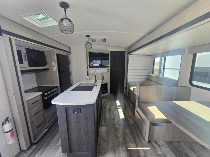 With any Sunset Trailer travel trailer by CrossRoads RV, you will enjoy comfort at every turn! The 5-sided aluminum structure, enclosed underbelly, and HyperDeck flooring provide a durable RV made to last. There is also a power awning with LED lights outdoors, a fiberglass front cap, and a docking station with battery disconnect for easy set-up. Each model includes solid surface kitchen countertops, porcelain toilets, roller shades, and hidden cabinet door hinges to name a few interior comforts!