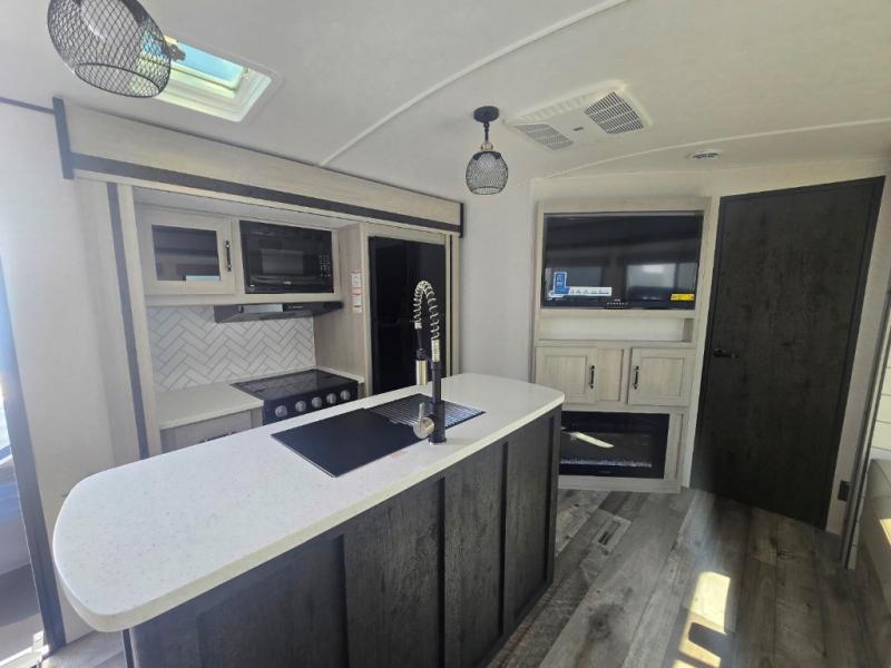 This travel trailer is packed with convenient features and luxury comforts for a camping trip you won't soon forget. Once you arrive at the campground, put out the electric awning and make a quick lunch on the exterior camp kitchen. The kitchen island inside will be the perfect place to cut up all the fixings for the burgers and you can grab the chips from the pantry. The kids will love the private bunkhouse that includes two bunks, a jackknife sofa with a kick, plus a dual entry half bath for convenience. The full walk-through bath will create a front master bedroom you are sure to love. Here, the king bed will provide a great night's rest and there are dual wardrobes for all your clothes.