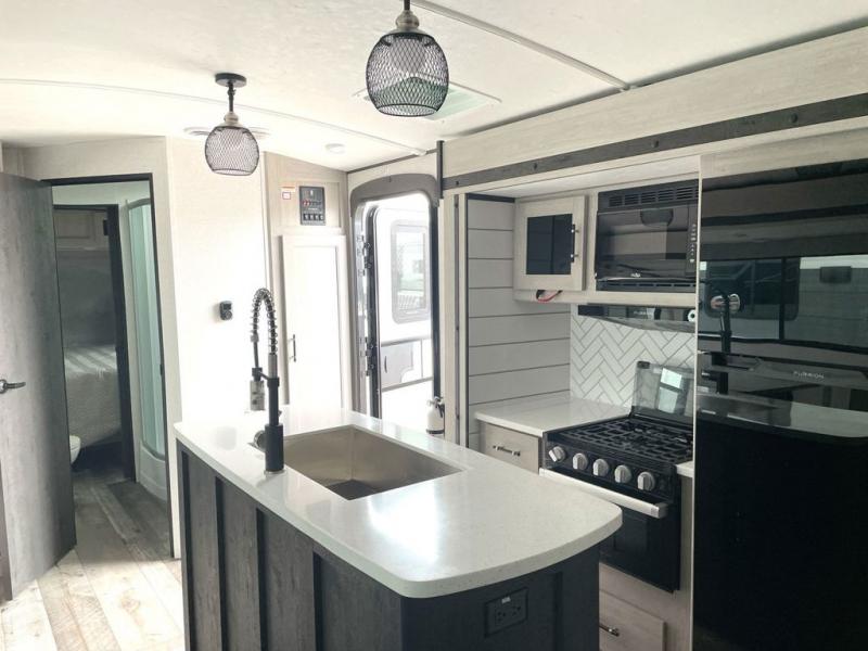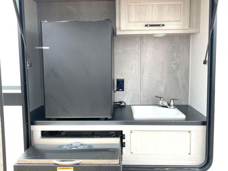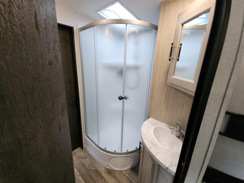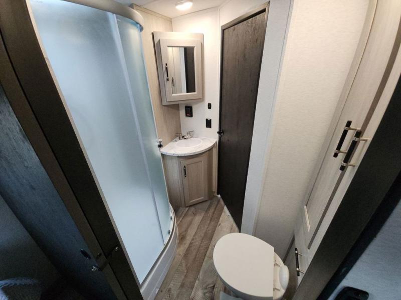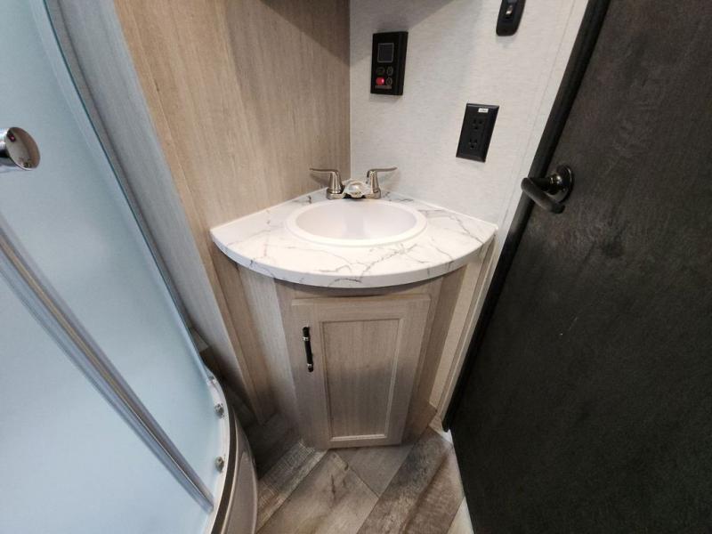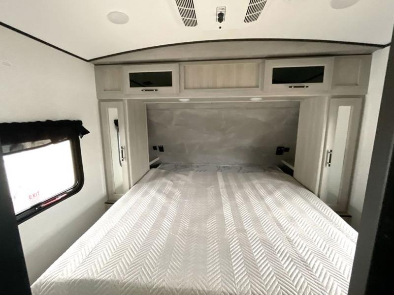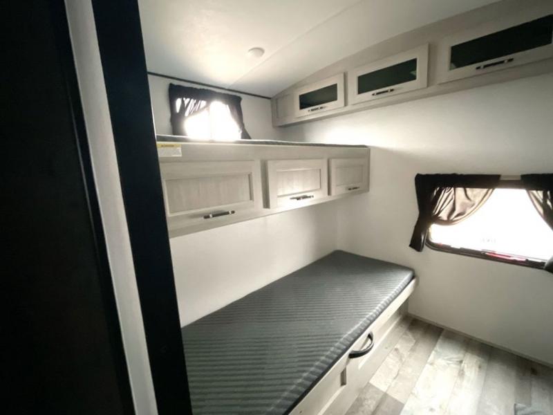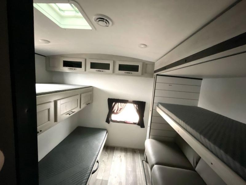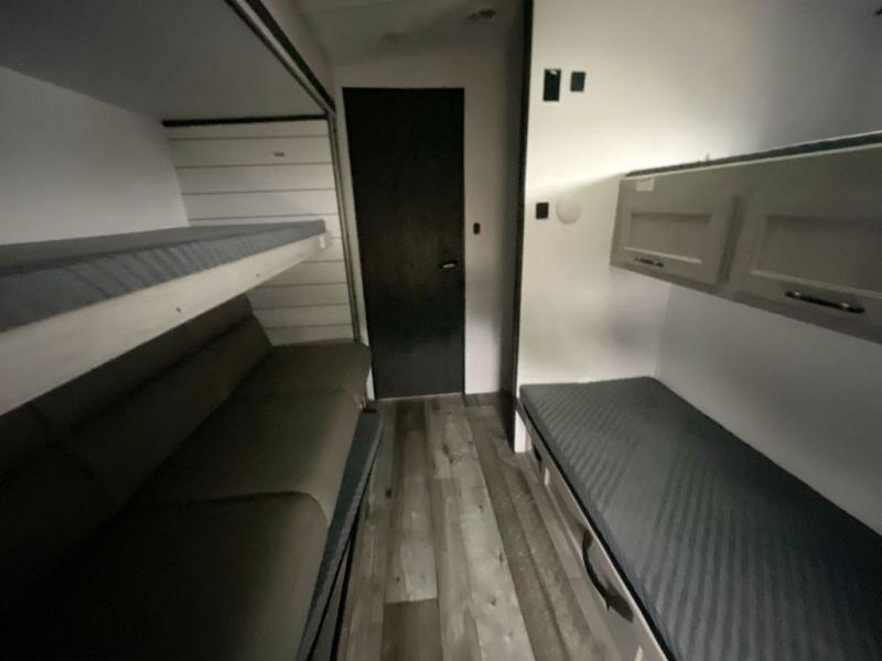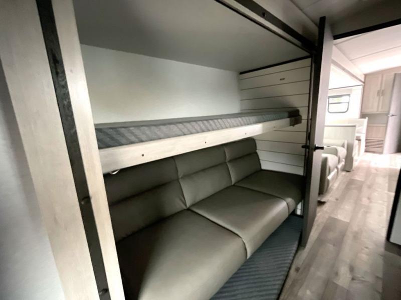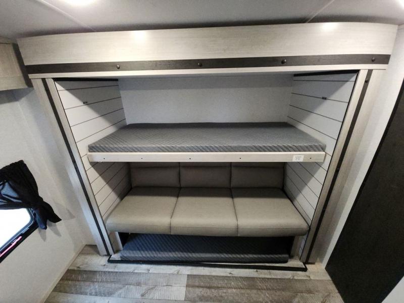 This travel trailer is packed with convenient features and luxury comforts for a camping trip you won't soon forget. Once you arrive at the campground, put out the electric awning and make a quick lunch on the exterior camp kitchen. The kitchen island inside will be the perfect place to cut up all the fixings for the burgers and you can grab the chips from the pantry. The kids will love the private bunkhouse that includes two bunks, a jackknife sofa with a kick, plus a dual entry half bath for convenience. The full walk-through bath will create a front master bedroom you are sure to love. Here, the king bed will provide a great night's rest and there are dual wardrobes for all your clothes.