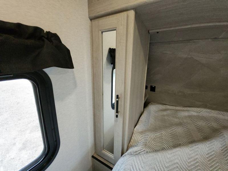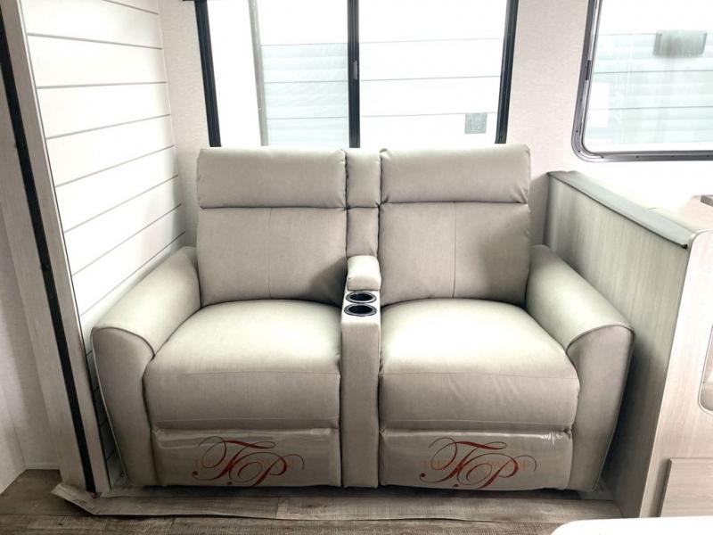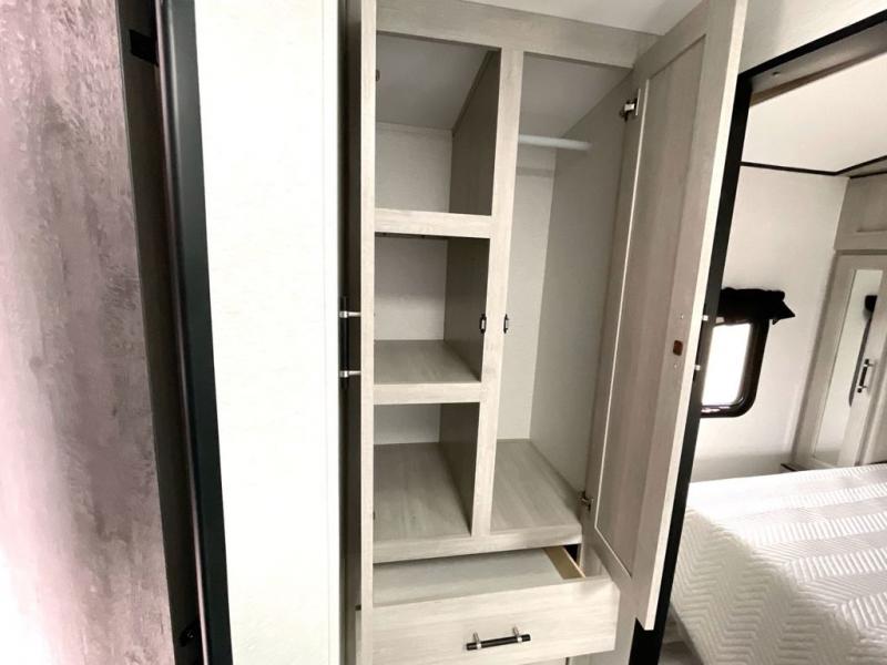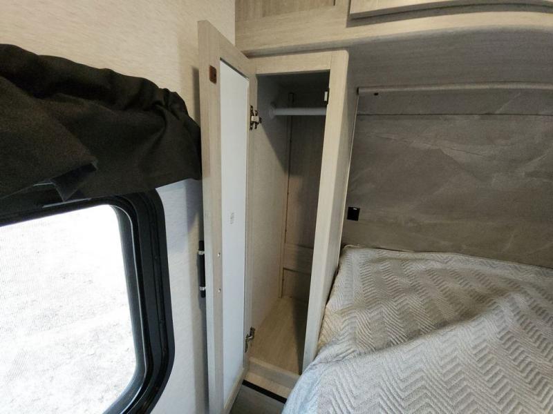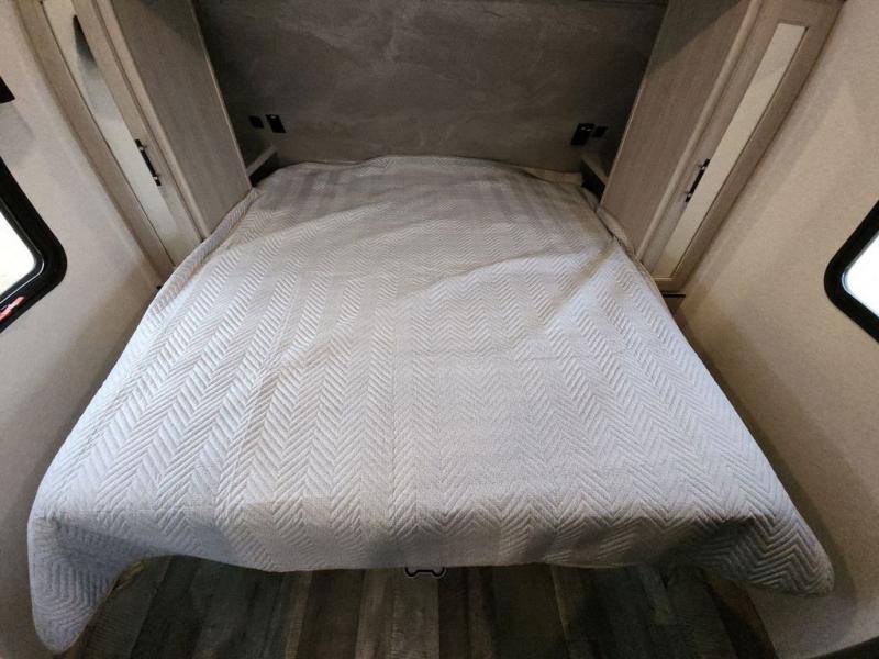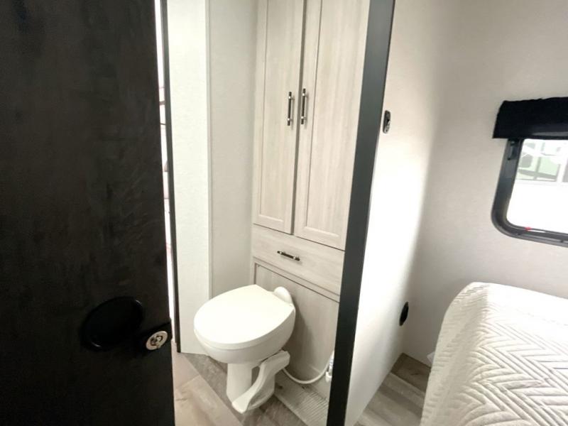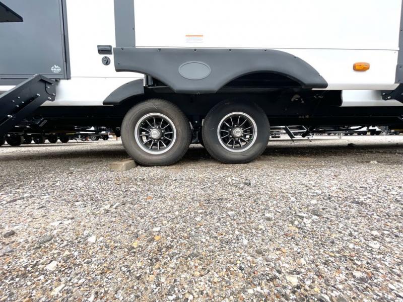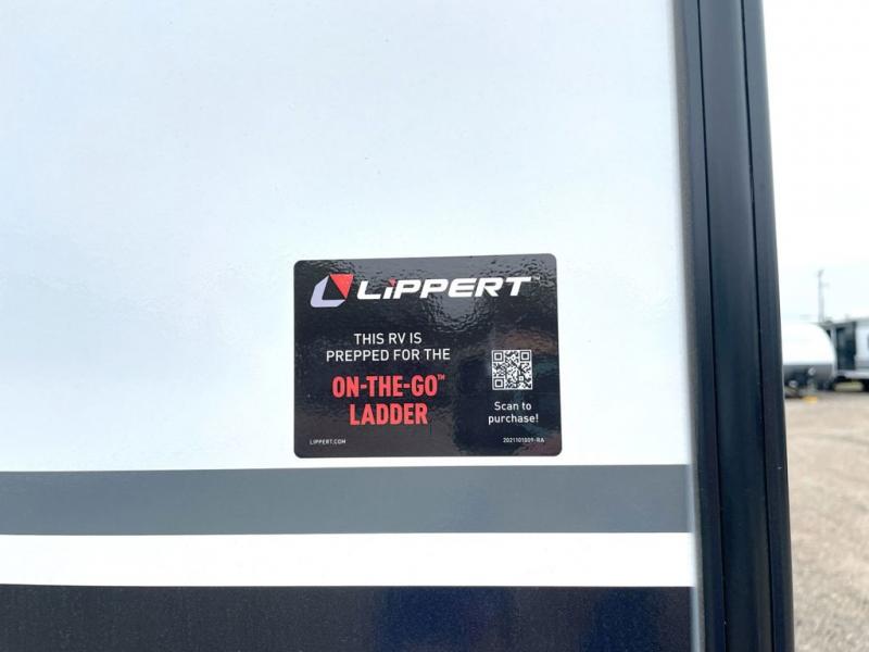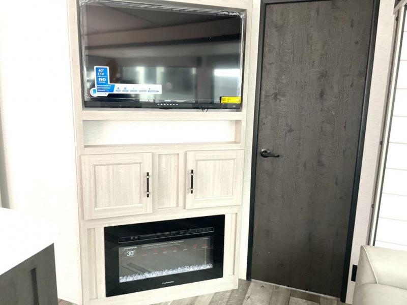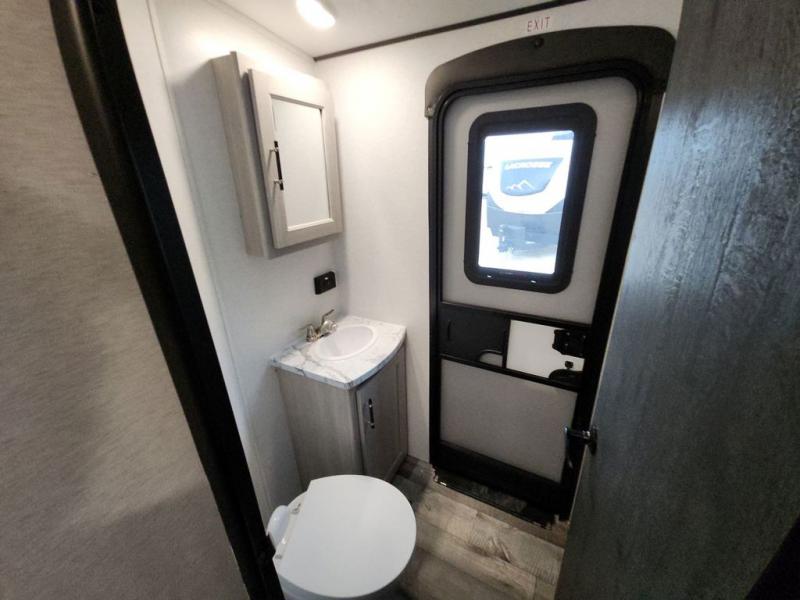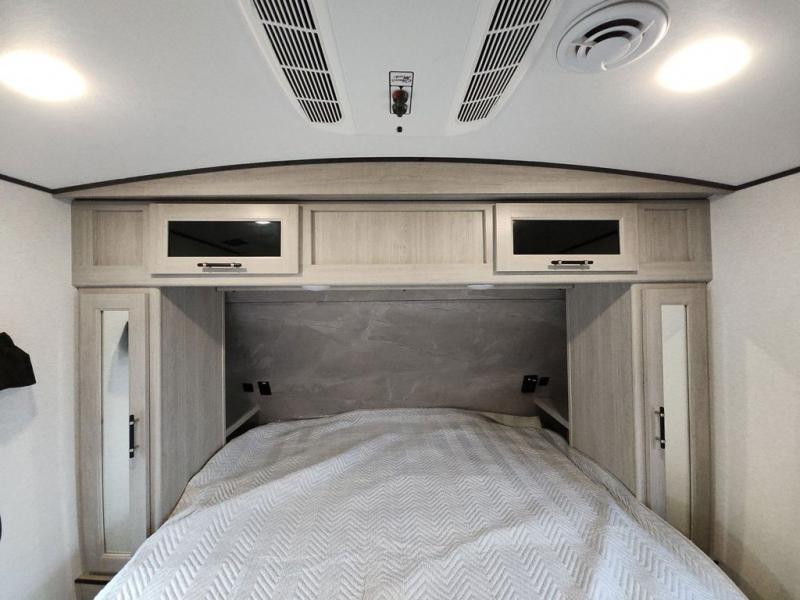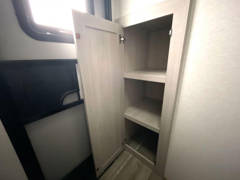This travel trailer is packed with convenient features and luxury comforts for a camping trip you won't soon forget. Once you arrive at the campground, put out the electric awning and make a quick lunch on the exterior camp kitchen. The kitchen island inside will be the perfect place to cut up all the fixings for the burgers and you can grab the chips from the pantry. The kids will love the private bunkhouse that includes two bunks, a jackknife sofa with a kick, plus a dual entry half bath for convenience. The full walk-through bath will create a front master bedroom you are sure to love. Here, the king bed will provide a great night's rest and there are dual wardrobes for all your clothes.