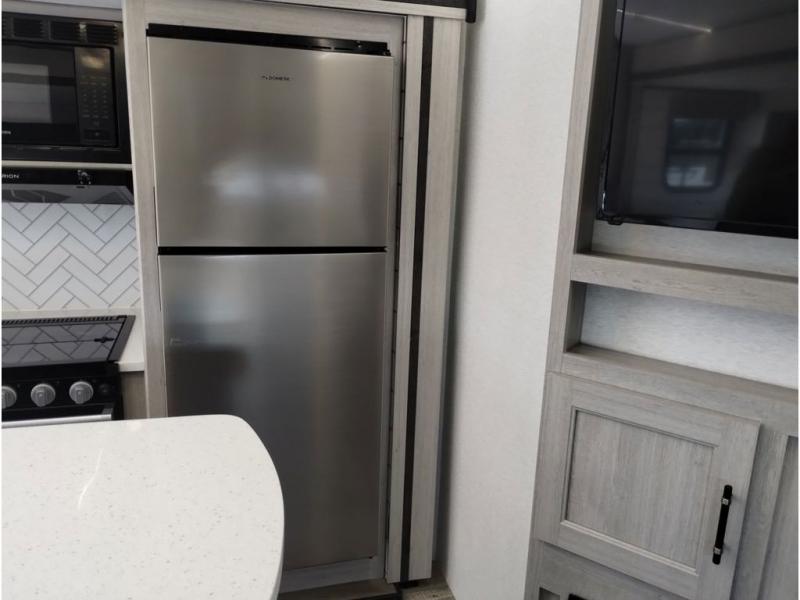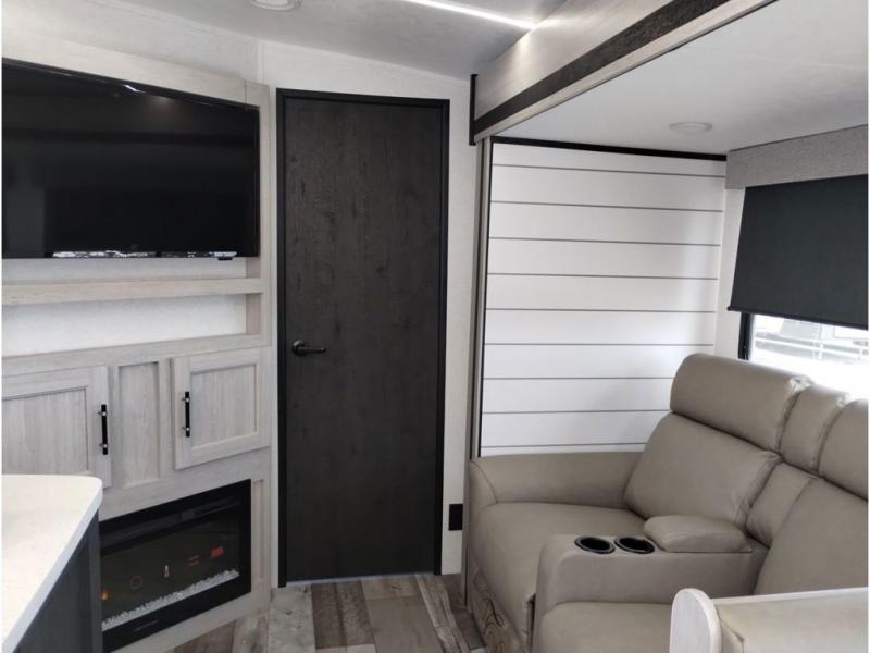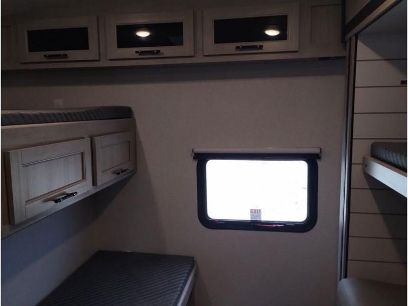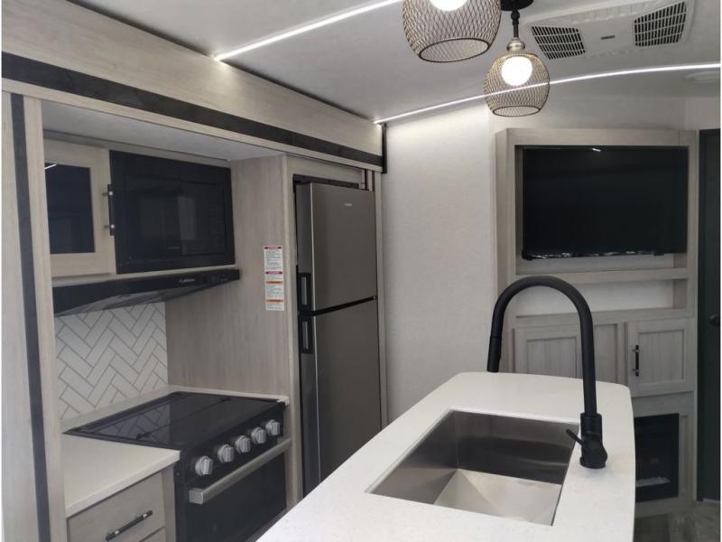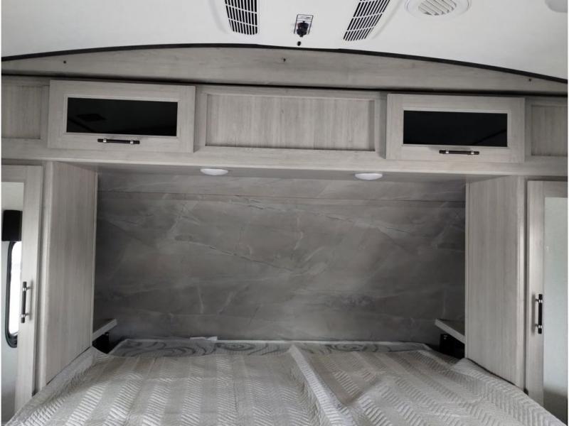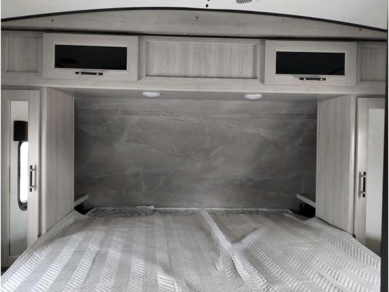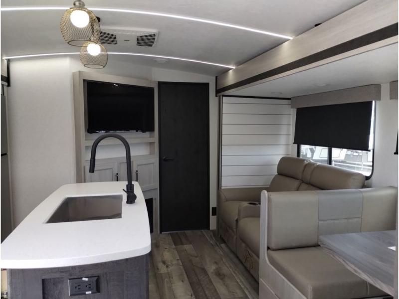 This travel trailer is packed with convenient features and luxury comforts for a camping trip you won't soon forget. Once you arrive at the campground, put out the electric awning and make a quick lunch on the exterior camp kitchen. The kitchen island inside will be the perfect place to cut up all the fixings for the burgers and you can grab the chips from the pantry. The kids will love the private bunkhouse that includes two bunks, a jackknife sofa with a kick, plus a dual entry half bath for convenience. The full walk-through bath will create a front master bedroom you are sure to love. Here, the king bed will provide a great night's rest and there are dual wardrobes for all your clothes.