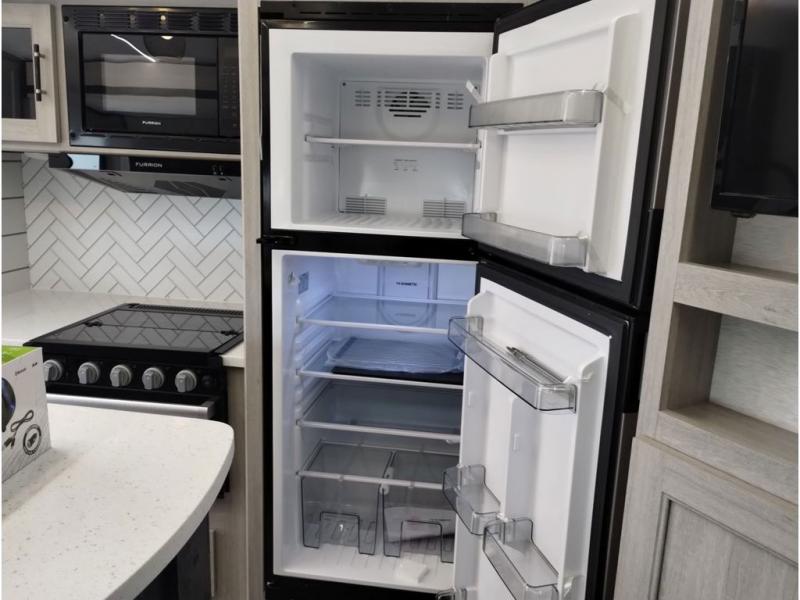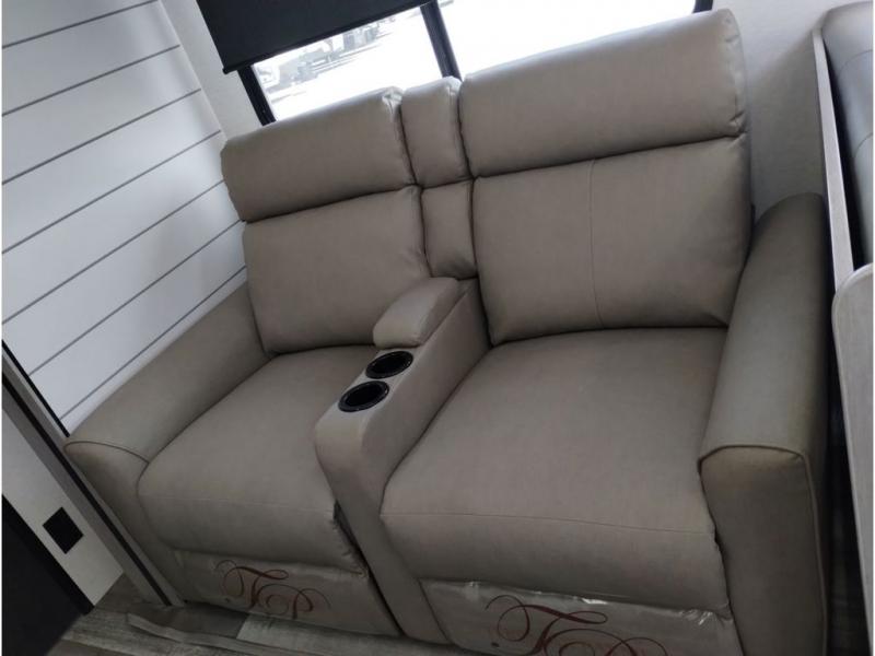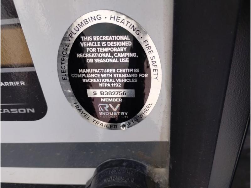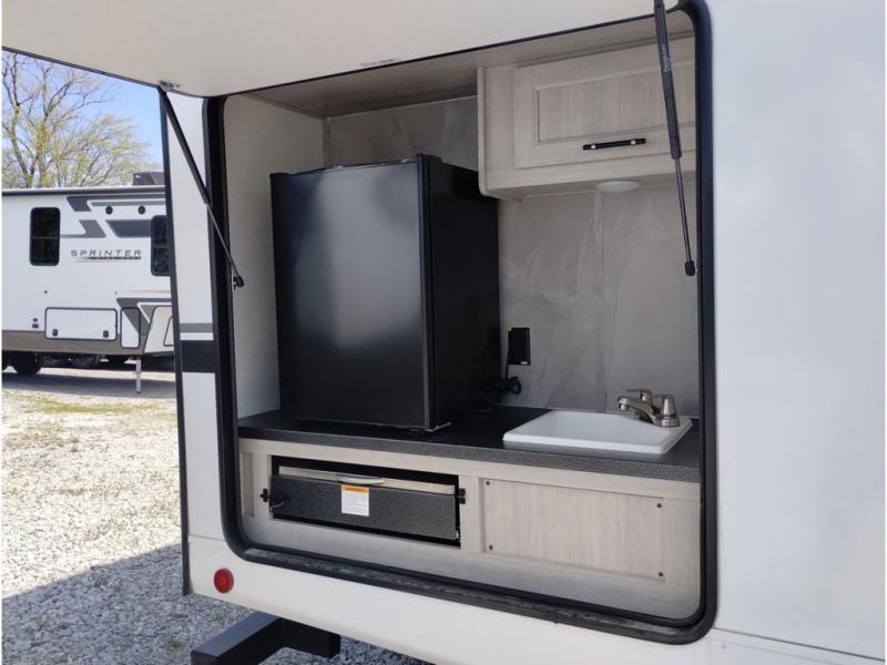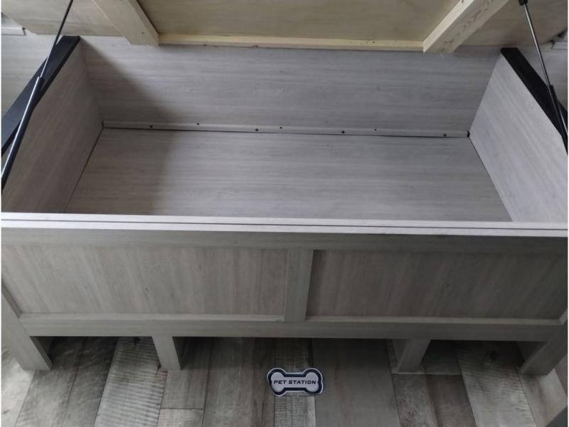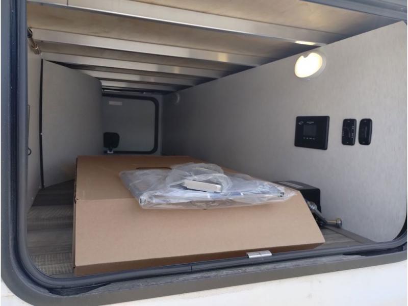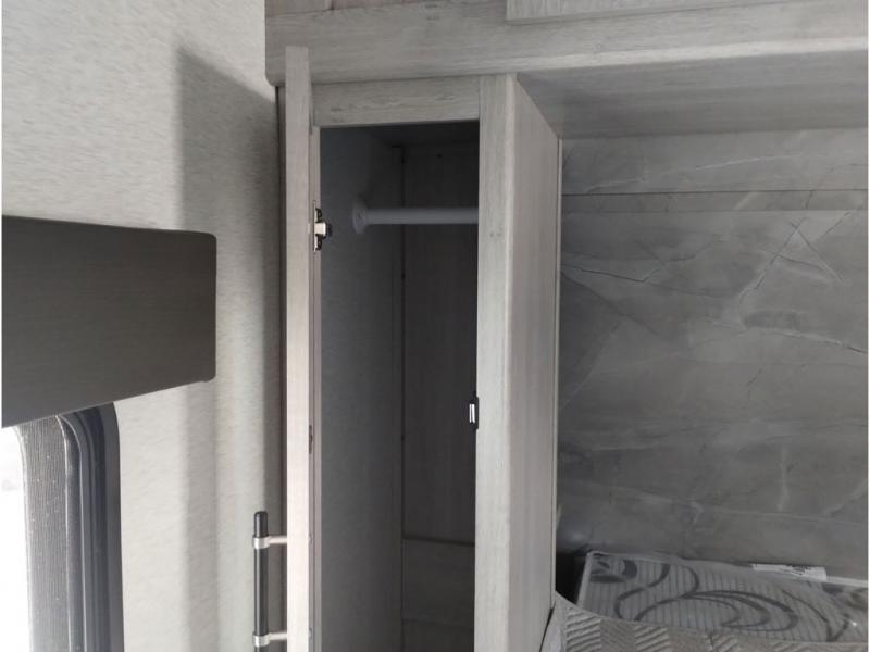 This travel trailer is packed with convenient features and luxury comforts for a camping trip you won't soon forget. Once you arrive at the campground, put out the electric awning and make a quick lunch on the exterior camp kitchen. The kitchen island inside will be the perfect place to cut up all the fixings for the burgers and you can grab the chips from the pantry. The kids will love the private bunkhouse that includes two bunks, a jackknife sofa with a kick, plus a dual entry half bath for convenience. The full walk-through bath will create a front master bedroom you are sure to love. Here, the king bed will provide a great night's rest and there are dual wardrobes for all your clothes.