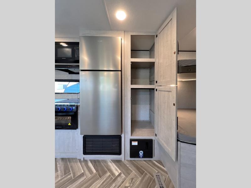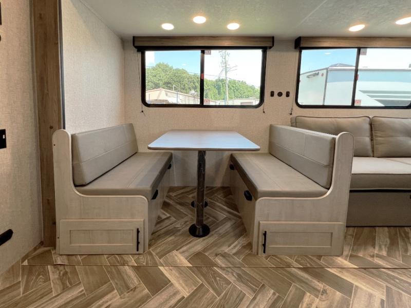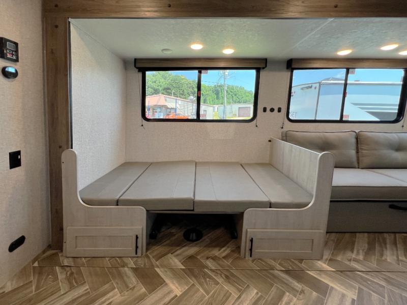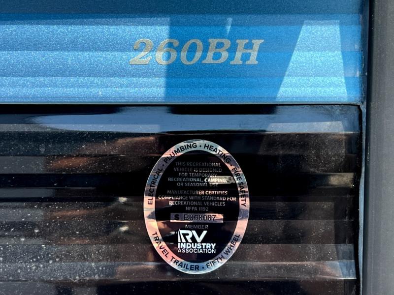 The 2025 CrossRoads RV Zinger 260BH is a travel trailer designed to accommodate larger groups and families, offering a blend of comfort and functionality. It features a spacious layout with sleeping arrangements for up to 10 people, including double-size bunk beds, a front private bedroom with an RV queen bed, a jackknife sofa, and a booth dinette that converts into additional sleeping spaces.