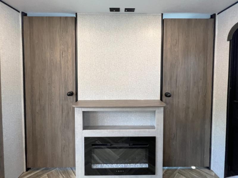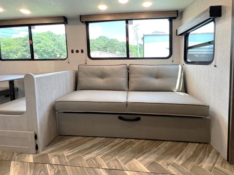 - Living Room: Includes an 81" interior ceiling height, AM/FM stereo with Bluetooth soundbar, designer valance, fireplace, flush floor slide-out with large dinette windows, LED accent lighting, pleated shades, sleeper sofa, storage doors below booth dinette, U-shaped dinette, USB ports, WiFi prep, and wood slide-out fascia.