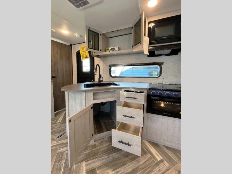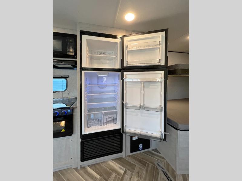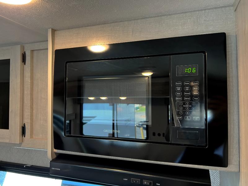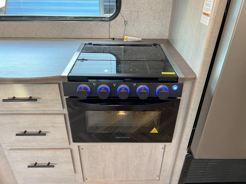 - Kitchen: Equipped with a 10 cu. ft. 12-volt refrigerator, three-burner range with LED-lit knobs, oven with LED glass top, microwave, pressed countertop with sink cover, and stainless steel high-rise faucet.