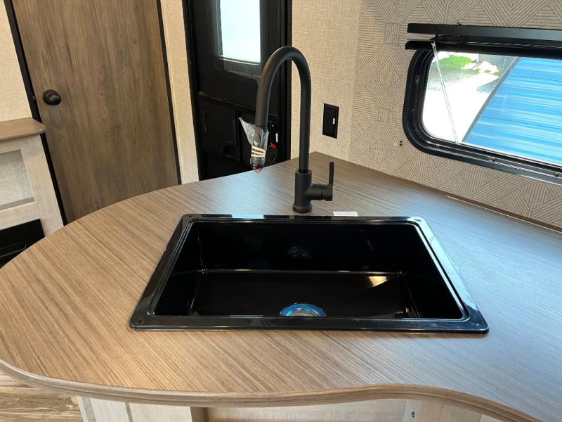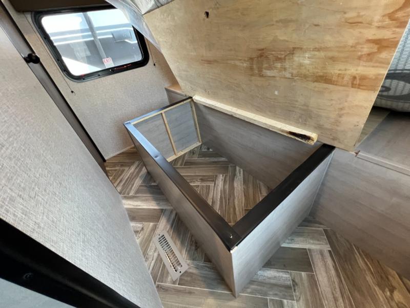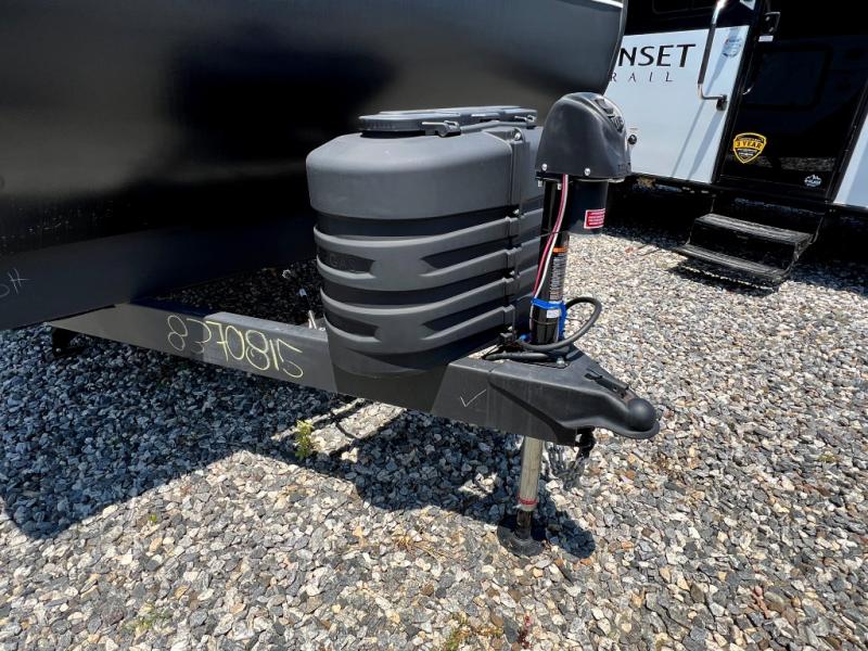 - Exterior: Features a fully enclosed and heated underbelly with forced heat, power stabilizer jacks, electric awning, electric tongue jack, two 20 lb LP bottles with cover, tankless on-demand water heater, backup camera prep, black tank flush system, bumper with drain hose storage and end caps, friction hinge entry door, large assist grab handle, molded rain gutters with 3” drip spouts, outside shower, radial tires, secure stance entry step, speakers with LED accents, and solar power prep.