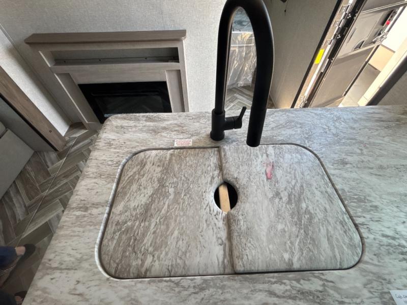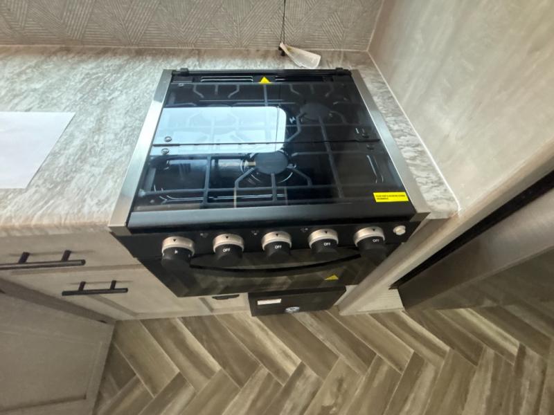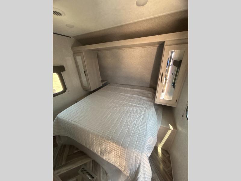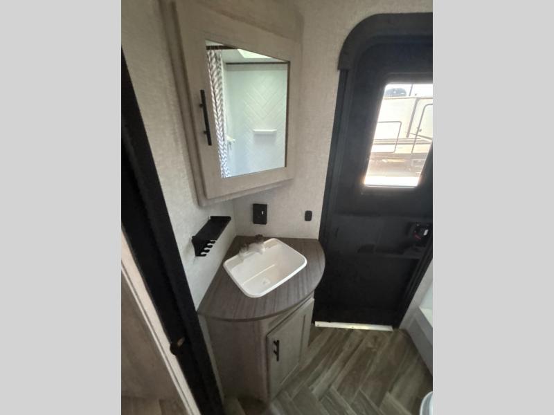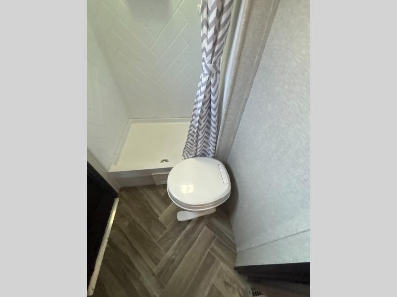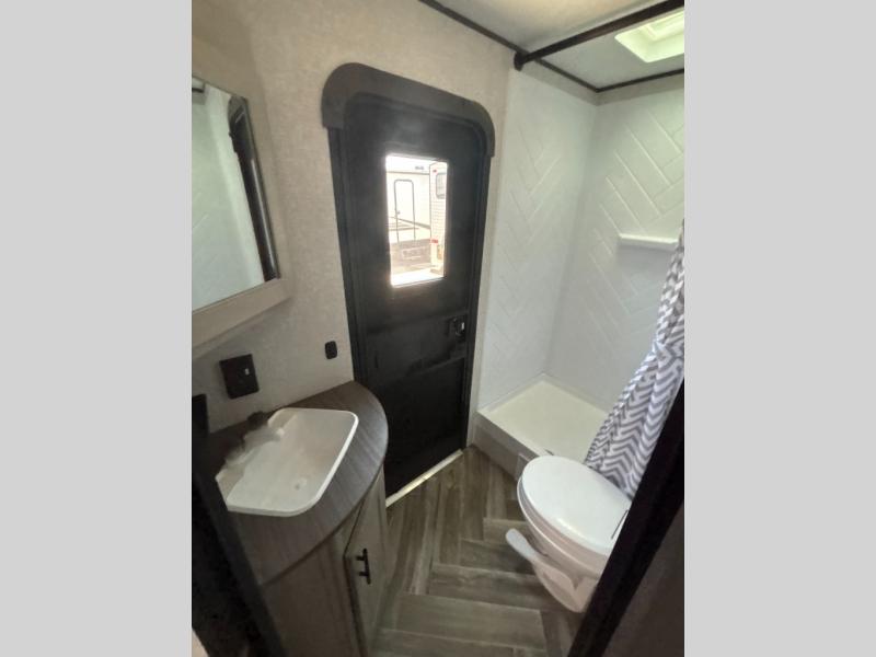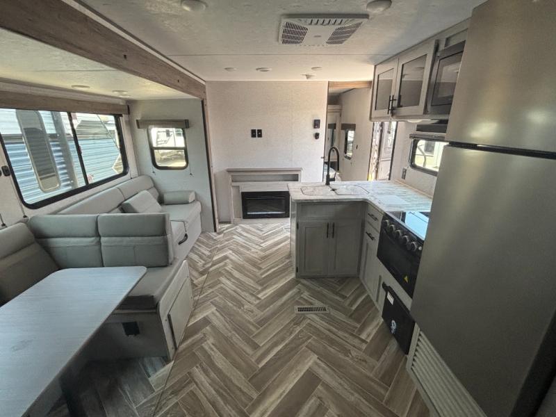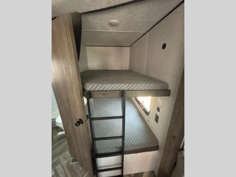 This travel trailer has everything you and your larger family will need for your next getaway, like a set of rear corner 50" x 74" bunk beds with a ladder, the entertainment center, the 60" jackknife sofa, and the outside kitchen with a refrigerator and two burner cooktop. One of the dual entry doors into this unit goes straight into the front private bedroom so that you can slip out early in the morning without waking everyone else up to go fish, and the second entry goes into the rear corner bathroom. The private bedroom also has its very own private half bathroom. The 80" U-shaped dinette is not only a great place to enjoy your meals at comfortably, but also to play games or even transform into an extra sleeping space!