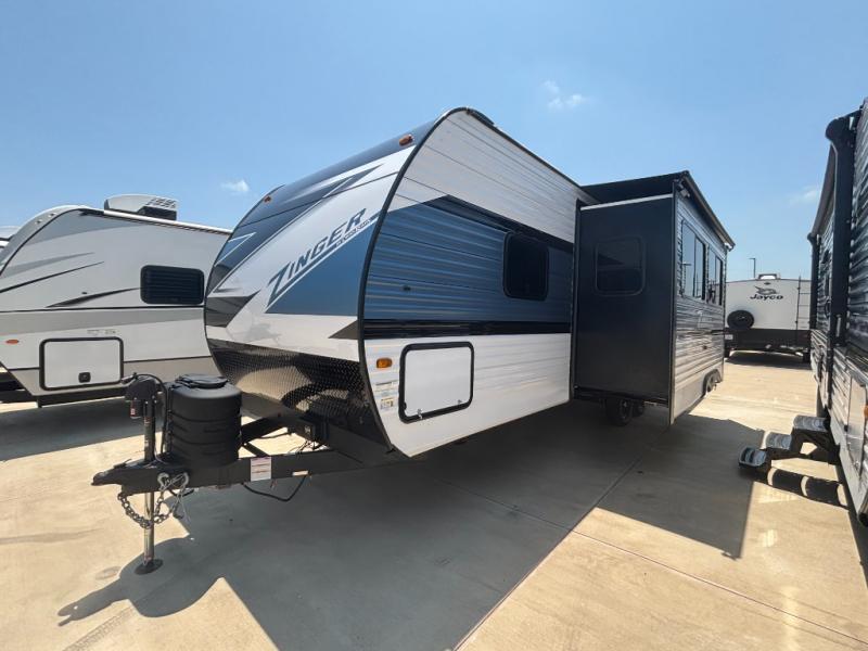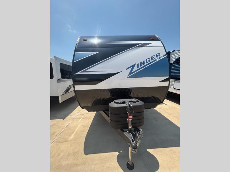 Lead your family to a great vacation getaway in any one of these CrossRoads RV Zinger travel trailers! They feature an aerodynamic front end, Keyed-Alike door locks, Secure Stance entry steps, and exterior speakers with LED accents. The interior of each model includes kitchen backsplash and pressed countertops, along with generous storage, designer valances, and LED lighting to keep your space well lit. You will also appreciate USB ports to keep your electronics charged up, and there is an AM/FM stereo with a Bluetooth soundbar to keep the party going!