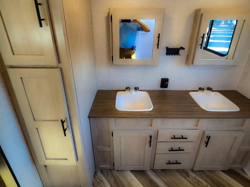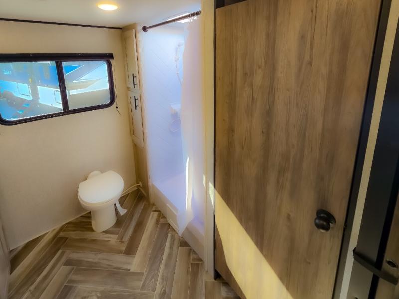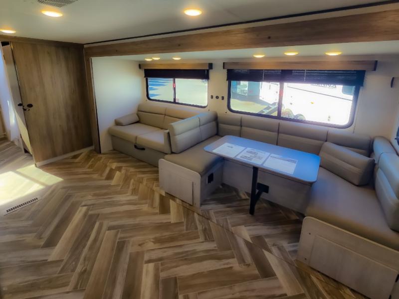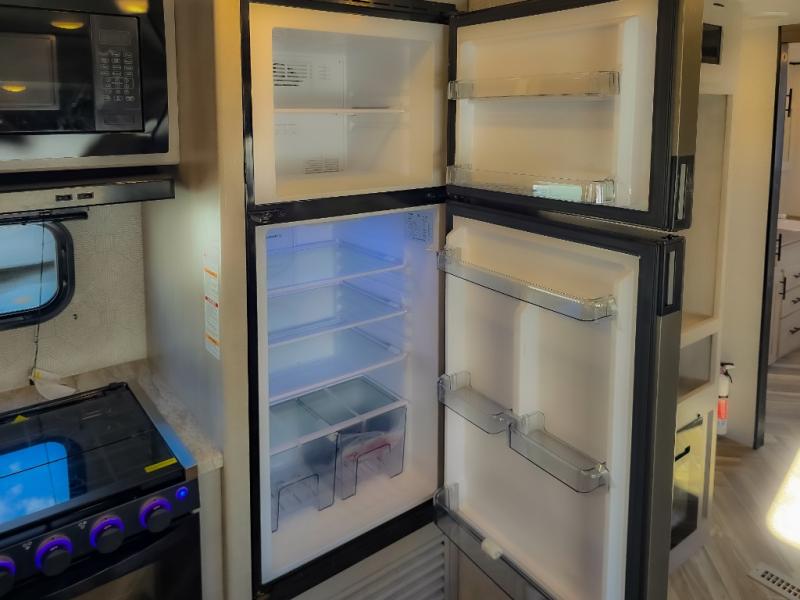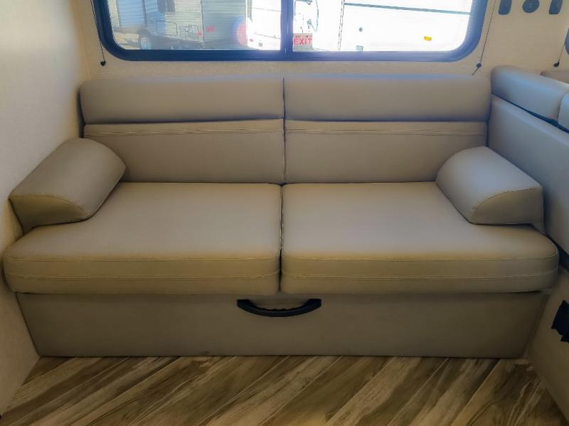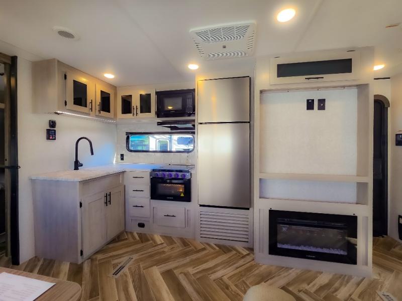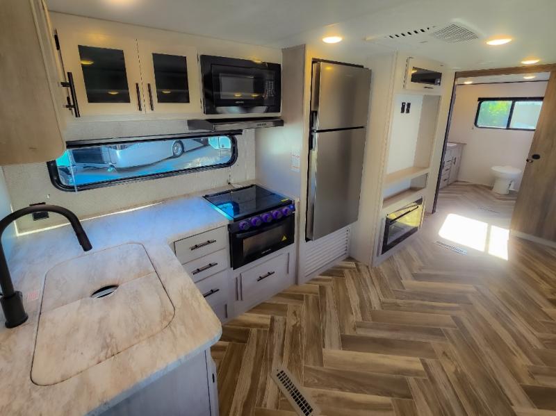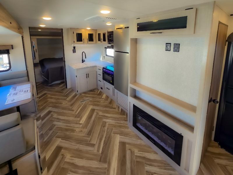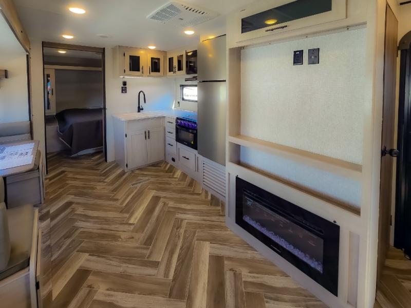 You need this award-winning travel trailer for your next weekend getaway! The full rear bathroom is decked out in features you're going to love like the dual-sink vanity for two to get ready at once, the linen closet next to the 30" x 36" shower and the second linen closet across from the closet with washer and dryer prep. After a fun-filled day outdoors, you can head inside and relax on either the 60" jackknife sofa and enjoy the entertainment center with a fireplace or grab a snack from the 10-cu. ft. refrigerator and play a few card games at the U-shaped dinette. The front private bedroom features a 60" x 74" RV queen bed with shirt closets on either side of it to keep your clothes looking nice!