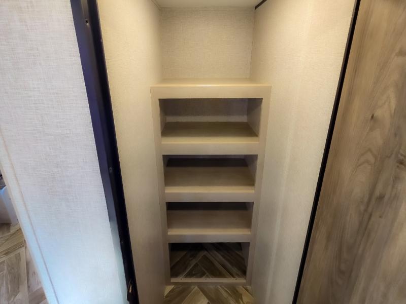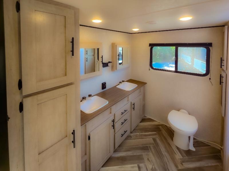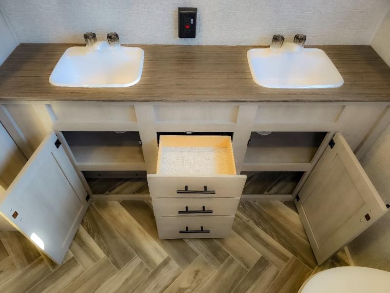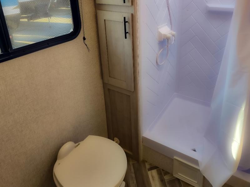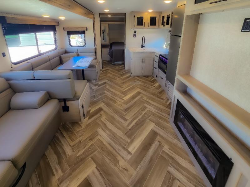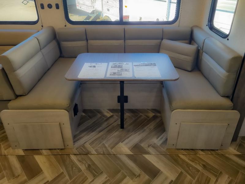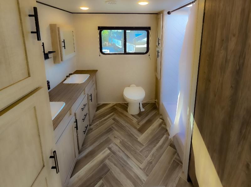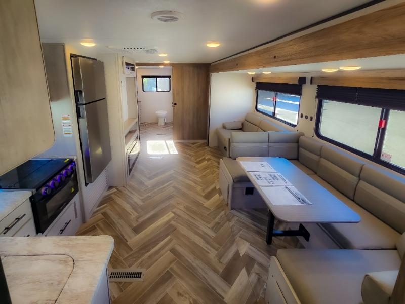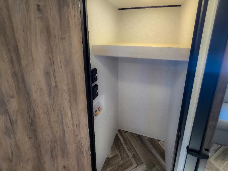 You need this award-winning travel trailer for your next weekend getaway! The full rear bathroom is decked out in features you're going to love like the dual-sink vanity for two to get ready at once, the linen closet next to the 30" x 36" shower and the second linen closet across from the closet with washer and dryer prep. After a fun-filled day outdoors, you can head inside and relax on either the 60" jackknife sofa and enjoy the entertainment center with a fireplace or grab a snack from the 10-cu. ft. refrigerator and play a few card games at the U-shaped dinette. The front private bedroom features a 60" x 74" RV queen bed with shirt closets on either side of it to keep your clothes looking nice!