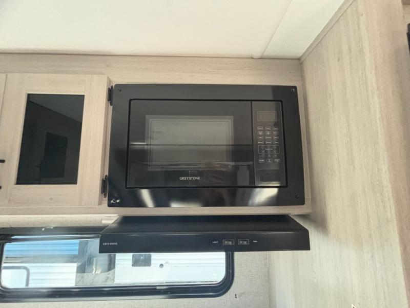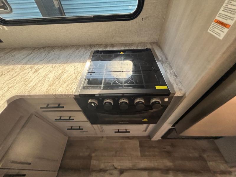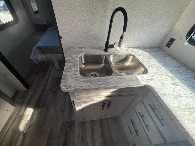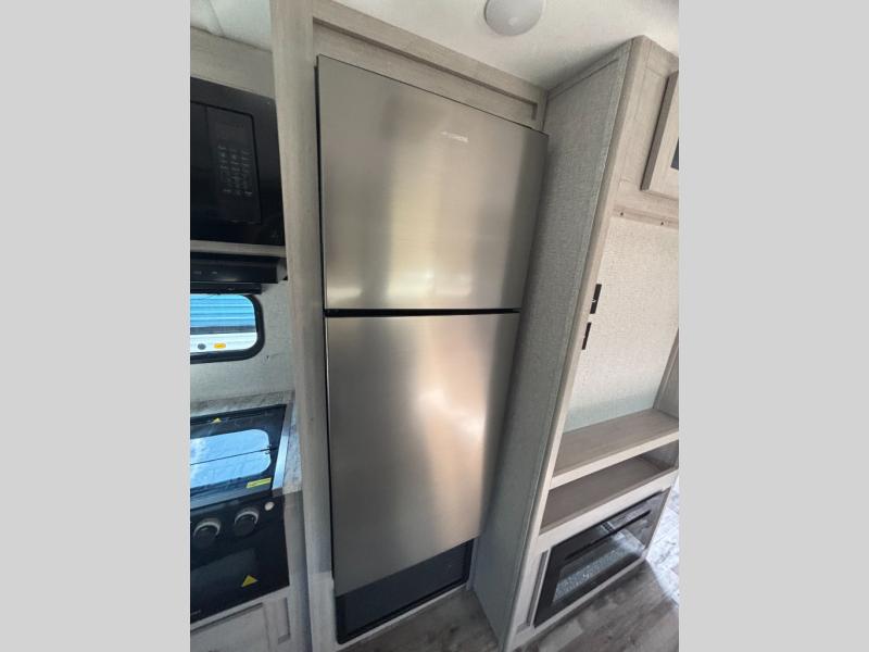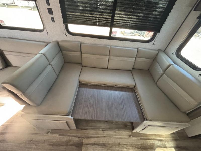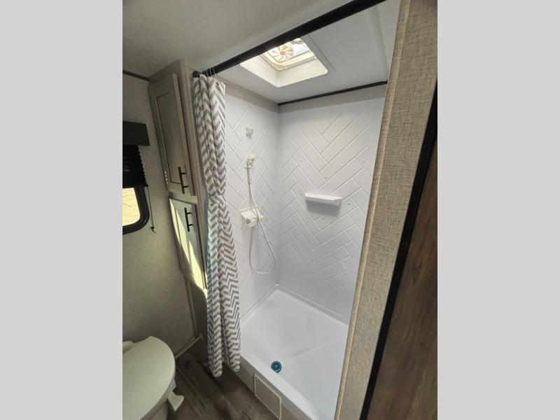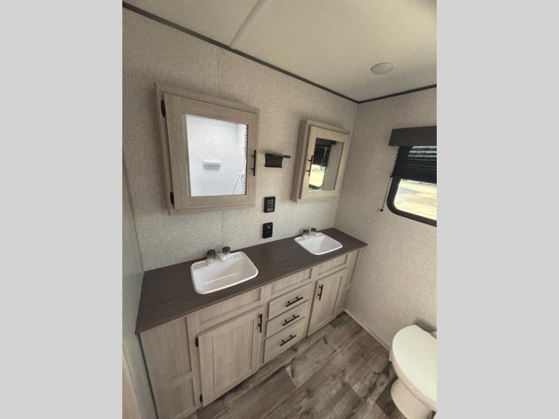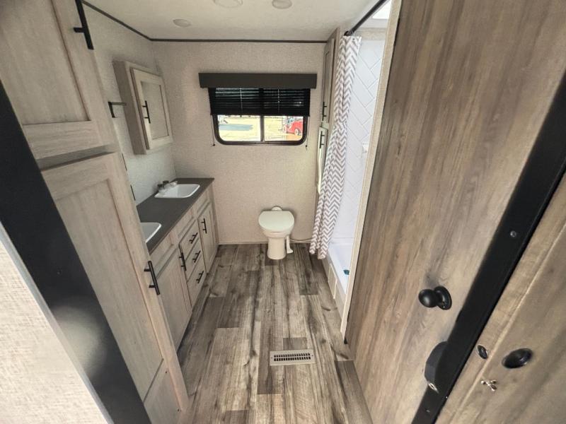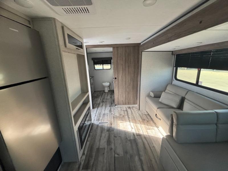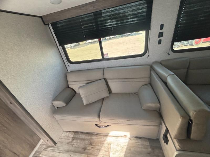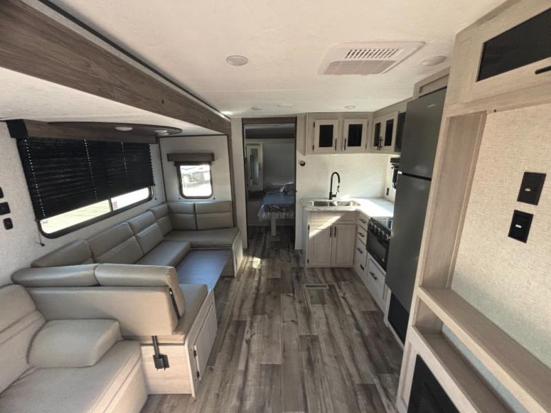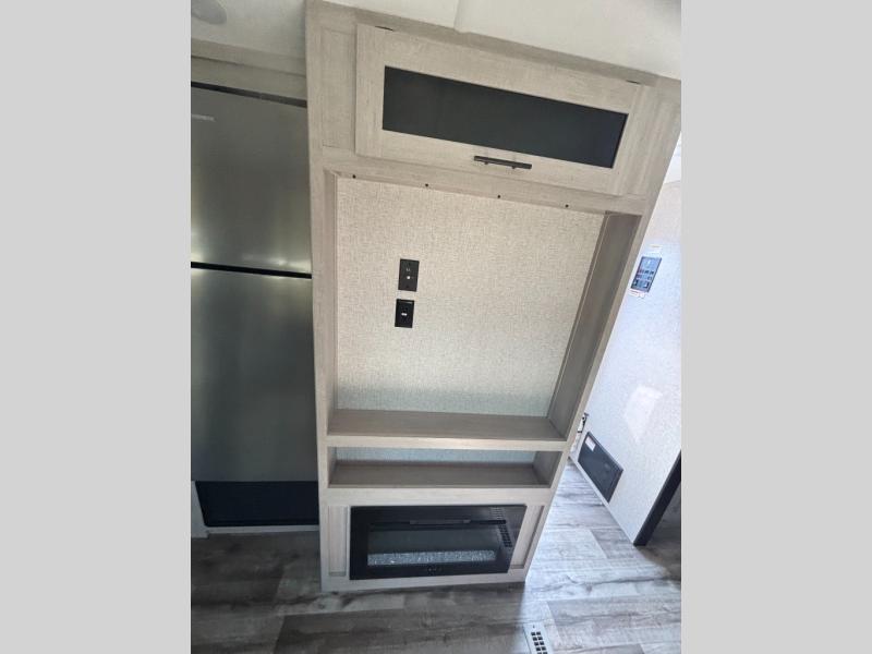 You need this award-winning travel trailer for your next weekend getaway! The full rear bathroom is decked out in features you're going to love like the dual-sink vanity for two to get ready at once, the linen closet next to the 30" x 36" shower and the second linen closet across from the closet with washer and dryer prep. After a fun-filled day outdoors, you can head inside and relax on either the 60" jackknife sofa and enjoy the entertainment center with a fireplace or grab a snack from the 10-cu. ft. refrigerator and play a few card games at the U-shaped dinette. The front private bedroom features a 60" x 74" RV queen bed with shirt closets on either side of it to keep your clothes looking nice!