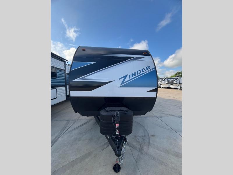 Lead your family to a great vacation getaway in any one of these CrossRoads RV Zinger travel trailers! They feature an aerodynamic front end, Keyed-Alike door locks, Secure Stance entry steps, and exterior speakers with LED accents. The interior of each model includes kitchen backsplash and pressed countertops, along with generous storage, designer valances, and LED lighting to keep your space well lit. You will also appreciate USB ports to keep your electronics charged up, and there is an AM/FM stereo with a Bluetooth soundbar to keep the party going!