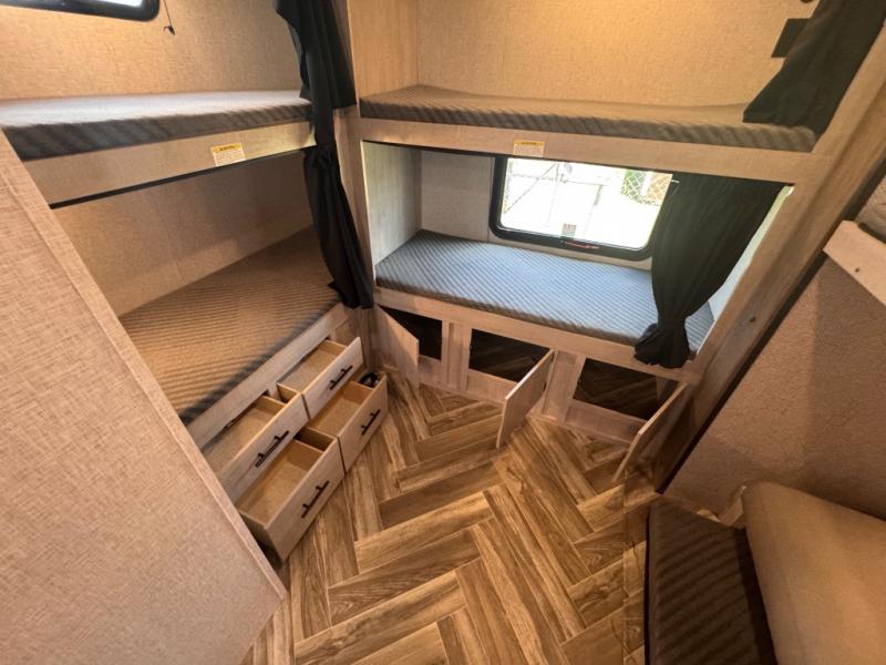 With dual entry doors, you will experience a smooth flow of traffic in and out of this travel trailer! The rear private bunkhouse includes two sets of bunk beds plus a fifth bunk over a jack knife sofa, so your kids can invite a few friends to come along. Across from the full bathroom is a linen closet to keep your towels close by and a U-shaped dinette to enjoy your meals at, play games, and even transform into an extra sleeping space. At night you can either relax on the 60" jackknife sofa by the fireplace or head to the front private bedroom and lie down on the 60" x 74" RV queen bed with closets on either side to keep your clothes looking their best!