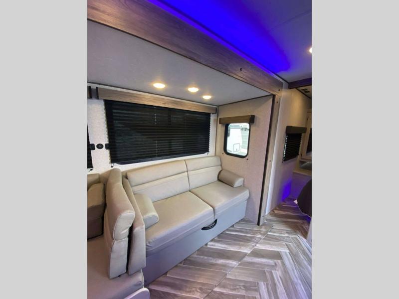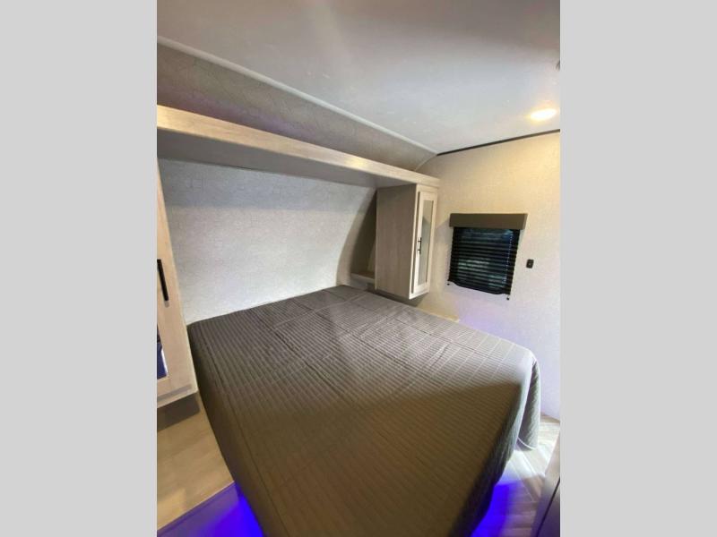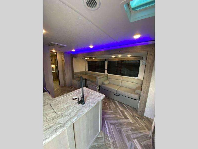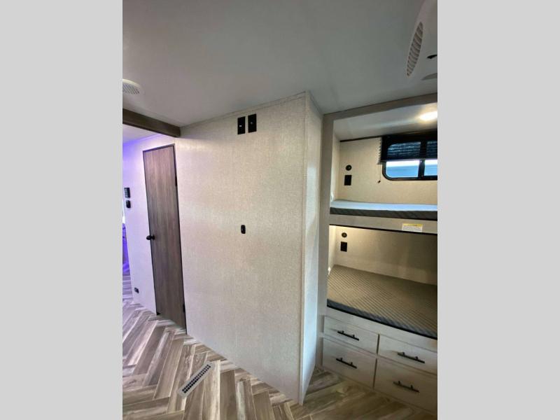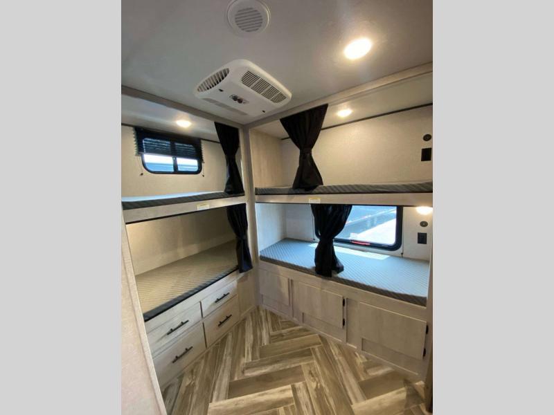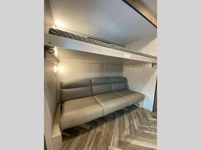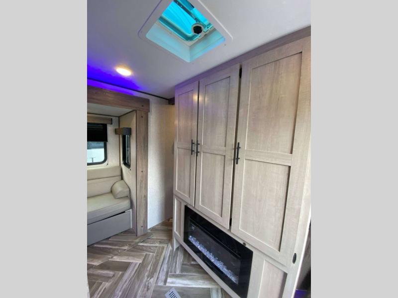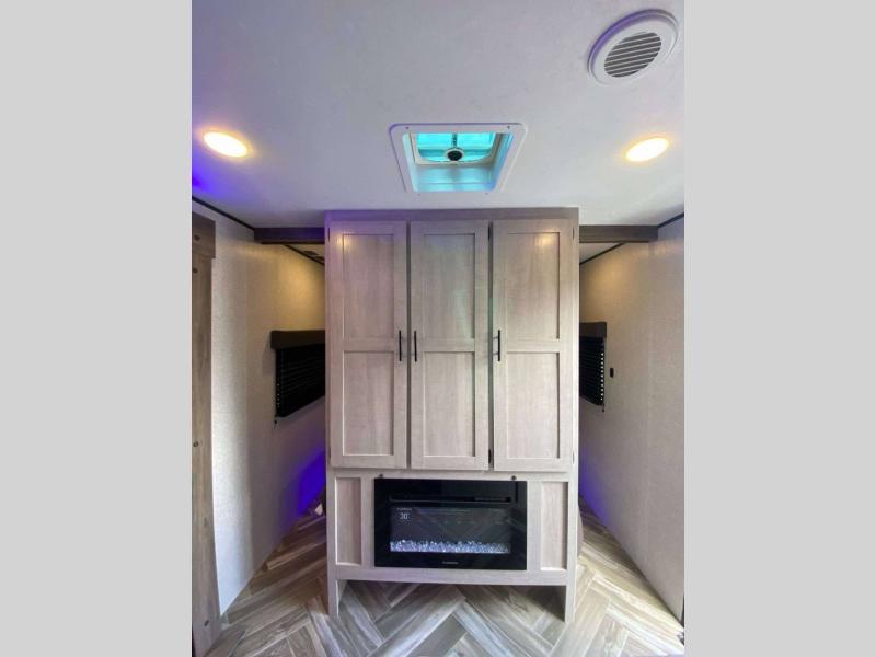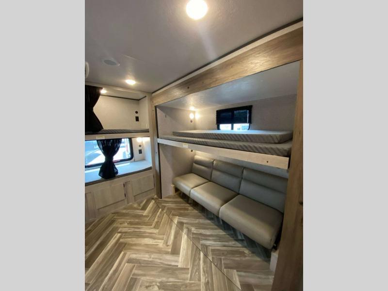 With dual entry doors, you will experience a smooth flow of traffic in and out of this travel trailer! The rear private bunkhouse includes two sets of bunk beds plus a fifth bunk over a jack knife sofa, so your kids can invite a few friends to come along. Across from the full bathroom is a linen closet to keep your towels close by and a U-shaped dinette to enjoy your meals at, play games, and even transform into an extra sleeping space. At night you can either relax on the 60" jackknife sofa by the fireplace or head to the front private bedroom and lie down on the 60" x 74" RV queen bed with closets on either side to keep your clothes looking their best!