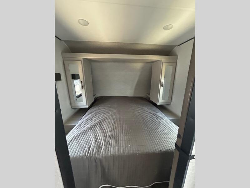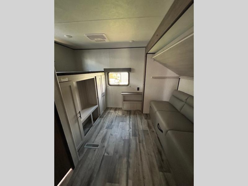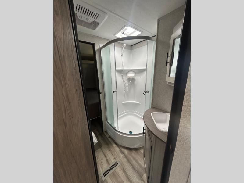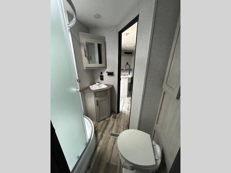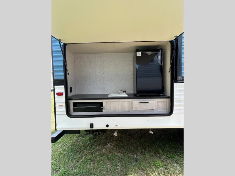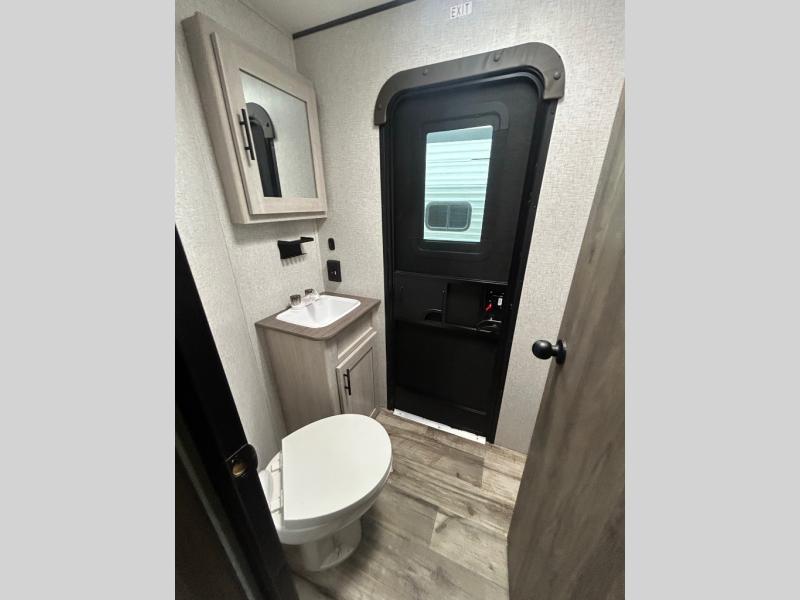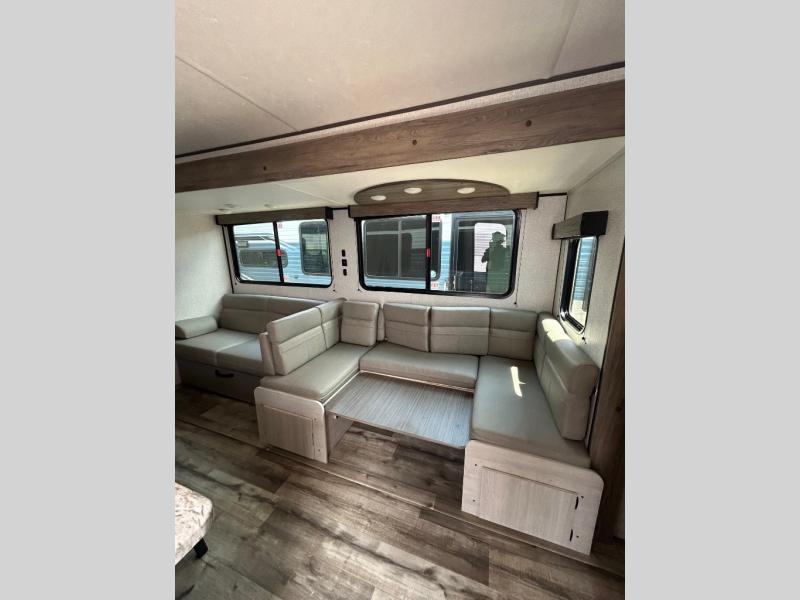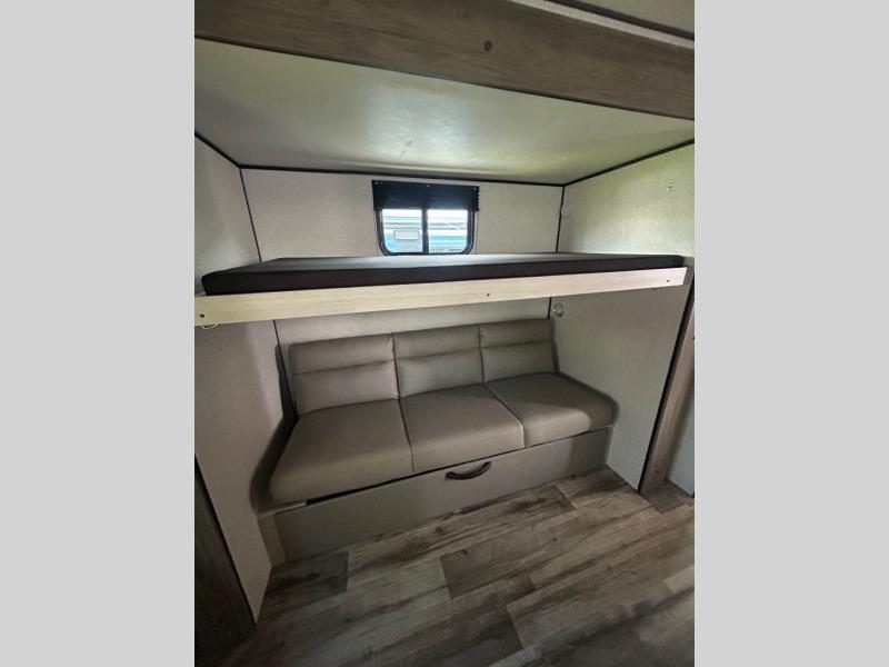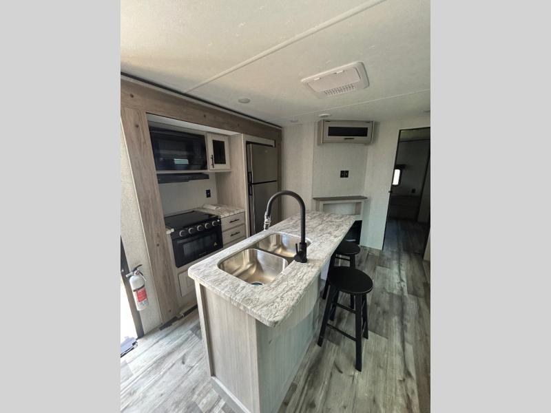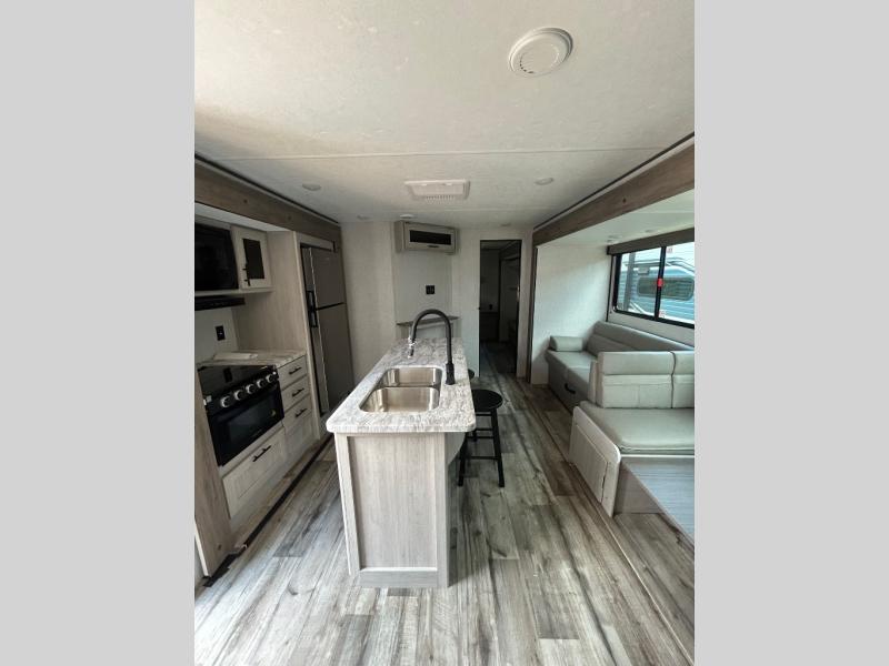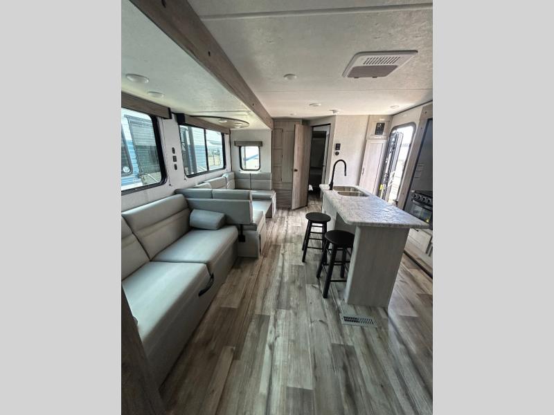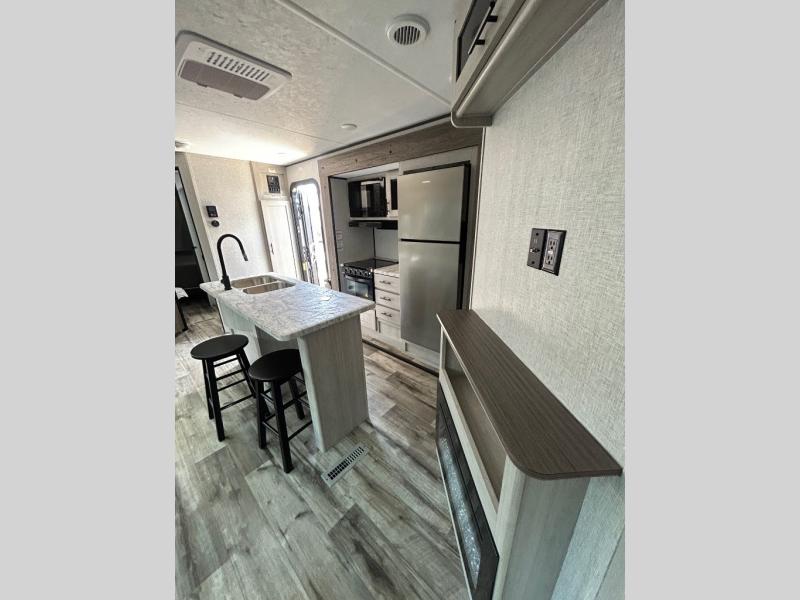 You won't believe all that this travel trailer has to offer! There is a kitchen island with a chair on either side of it for two helpers to roll out the dough for cinnamon rolls in the morning and enjoy them at the 42" U-shaped dinette. One of the entrance doors leads right into the half bathroom which also leads into the rear private bunkhouse. Inside the bunkhouse is a flip-up bunk above the jackknife sofa which are both across from the set of bunk beds. While the kids are busy playing in their bedroom, you and your spouse can relax on the tri-fold sofa across from the fireplace or head to the front private bedroom to relax on the king bed, plus you have your own entrance into the walk-through bathroom which will come in very handy at night!